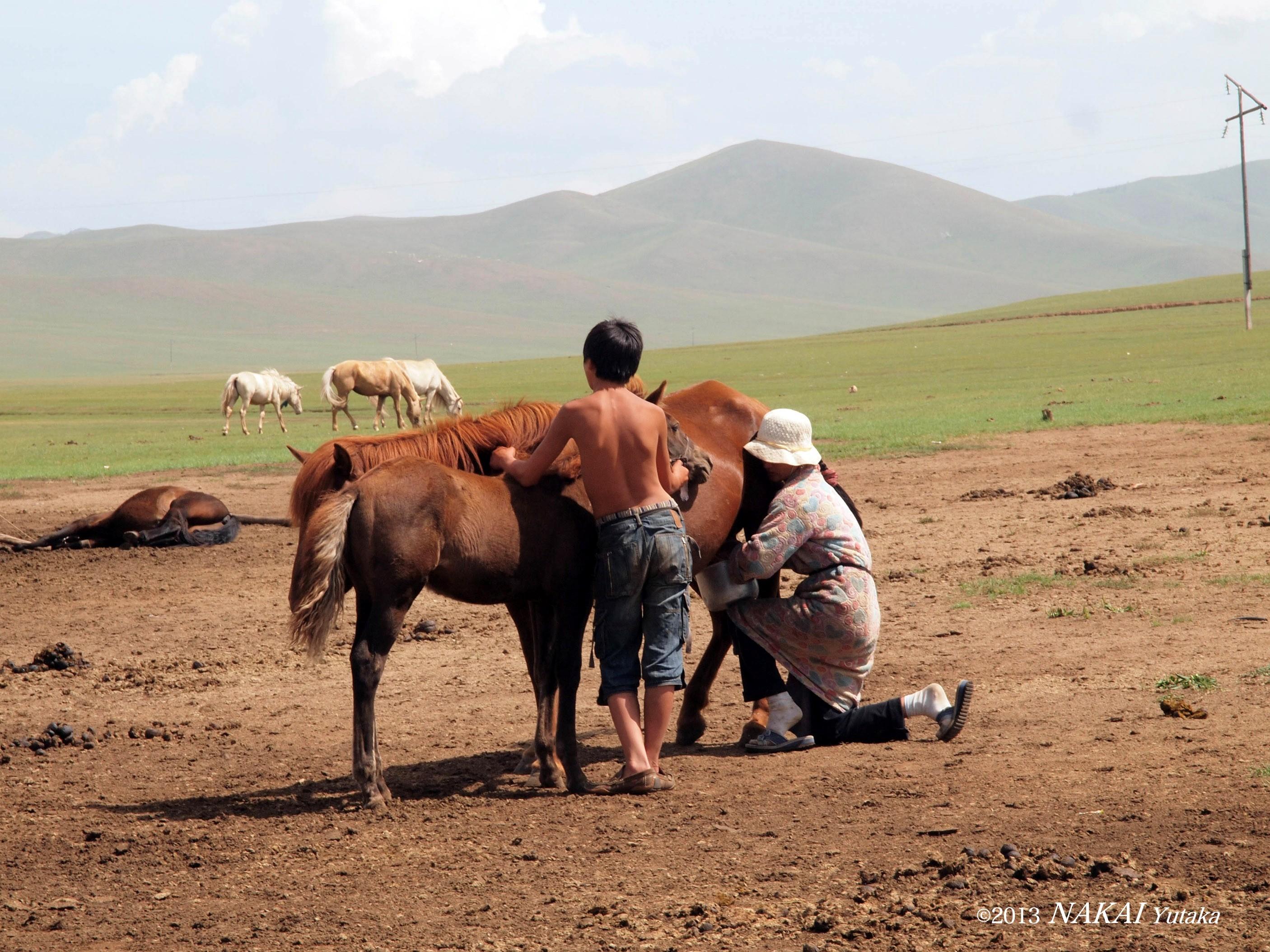 小学生くらいの息子が裸馬に跨がり、馬を集めます。息子は子馬を優しく押さえ、母親が母馬の乳を搾ります。牛の搾乳の場合、牛が動かないよう保定して行いますが、ここでは全く何もせず、手早く金属の容器を持って乳頭に手を伸ばして搾っていました。家族とともに暮らす馬ならではできる搾乳方法です。