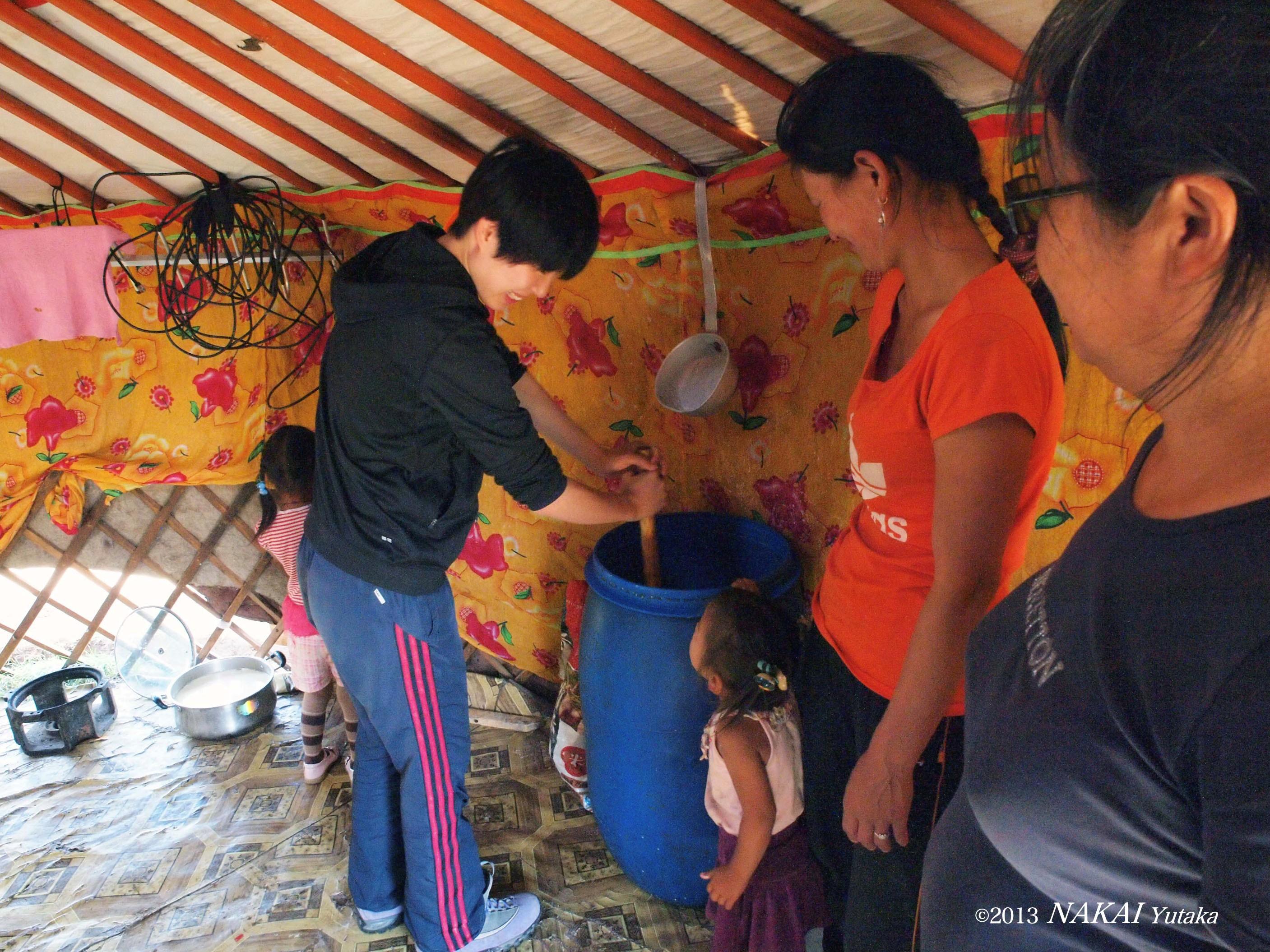 同行していた研究室の学生が混ぜることになりました。ゆっくりと混ぜ続けるようにとの指示で、子どもたちに笑顔を振りまきながら腕を動かします。よく混ぜることが馬乳酒作りの基本です。