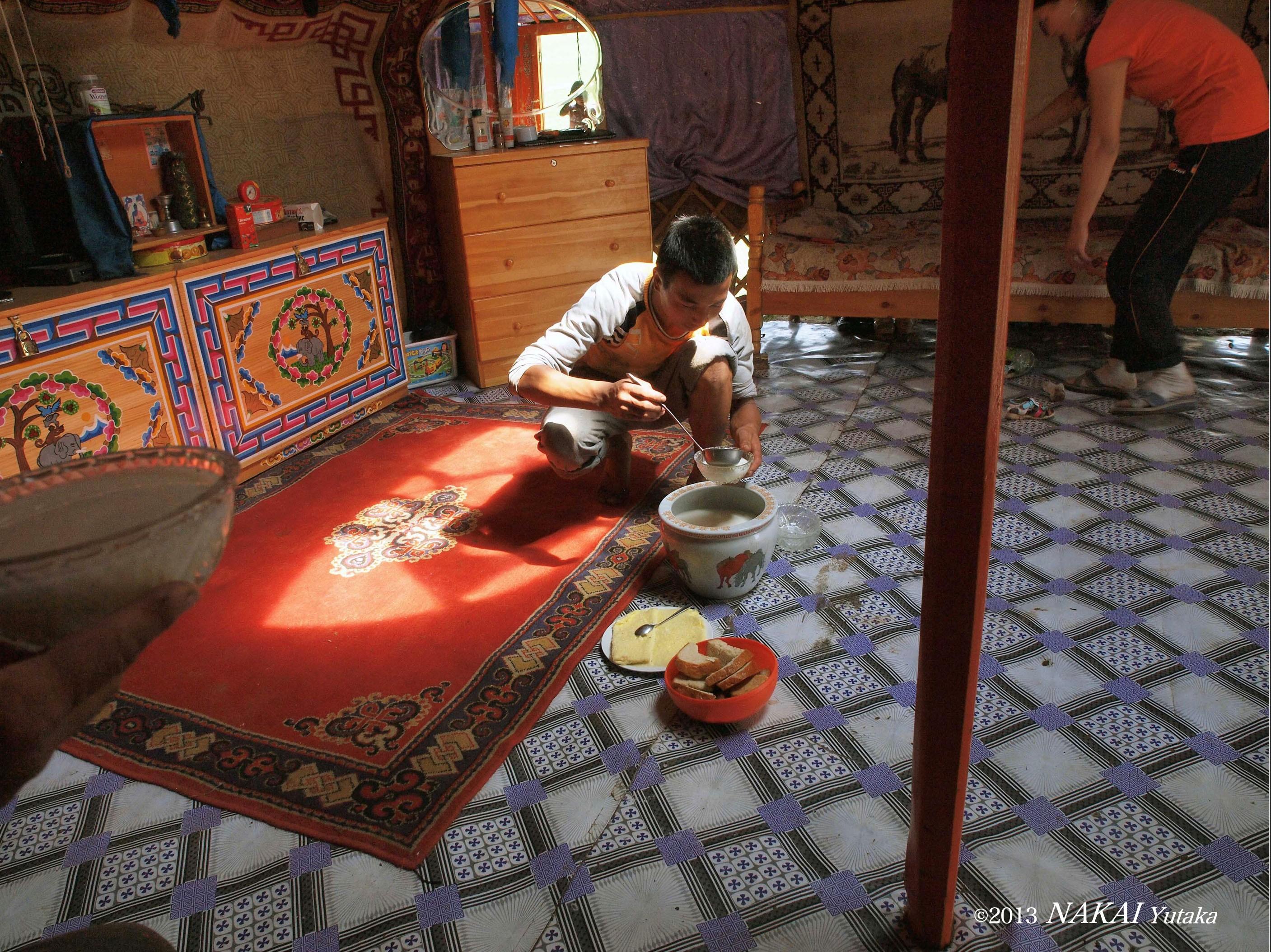 遊牧民たちは古くから来訪者に馬乳酒や乳製品を振る舞う風習があります。訪問者であれば誰であれもてなします。これは、外部から来た人から情報を得るためといわれています。われわれは、この風習のお陰で、簡単に遊牧民の家族と近づくことができました。
