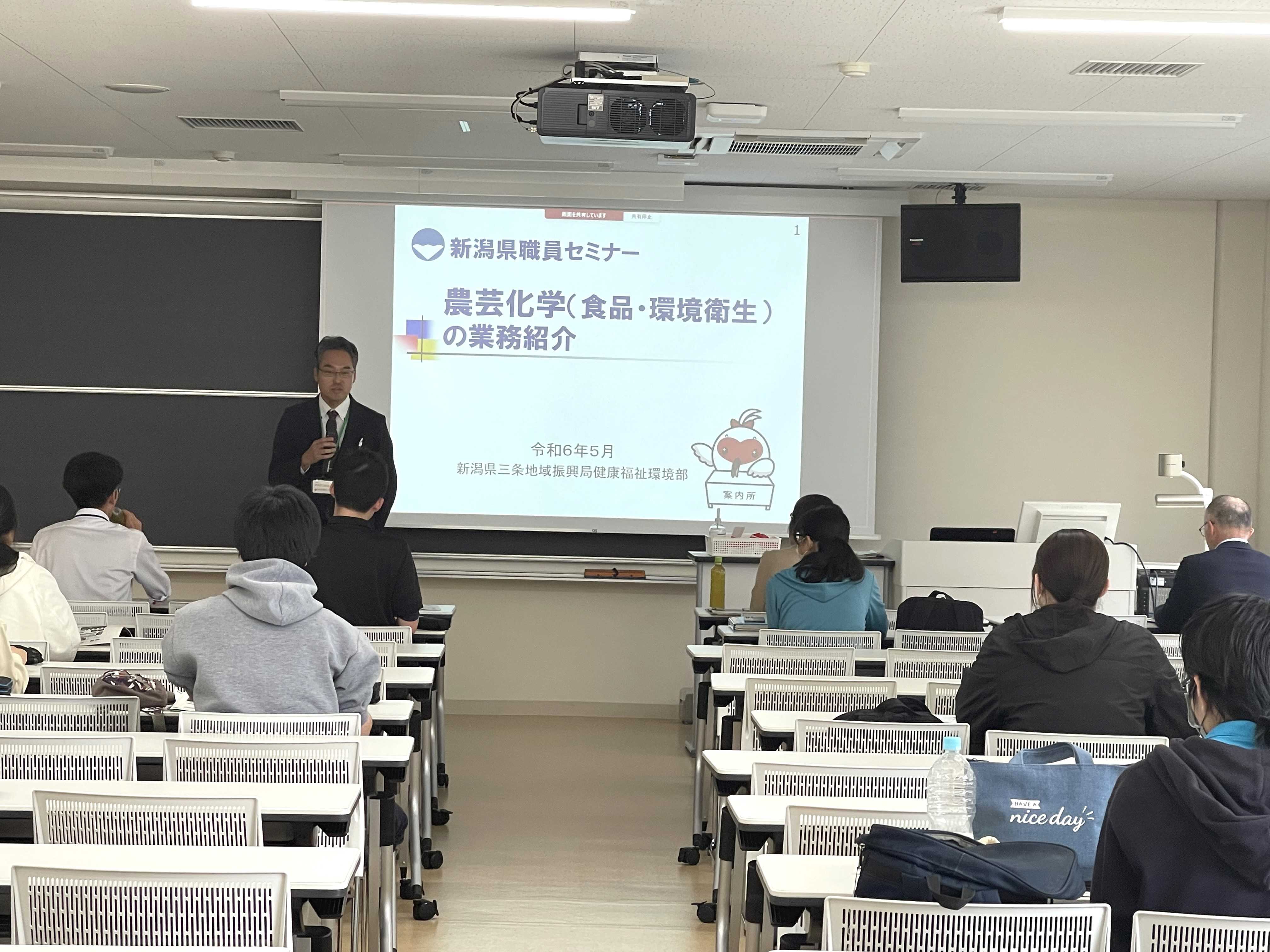5月15日(水)、3年生向けの就職支援として、新潟県人事委員会事務局総務課より惣塚様、新潟県農林水産部 農産園芸課 より原田様、新潟県三条地域振興局健康福祉環境部 岡田様をお迎えして業界研究セミナーを開催いたしました。