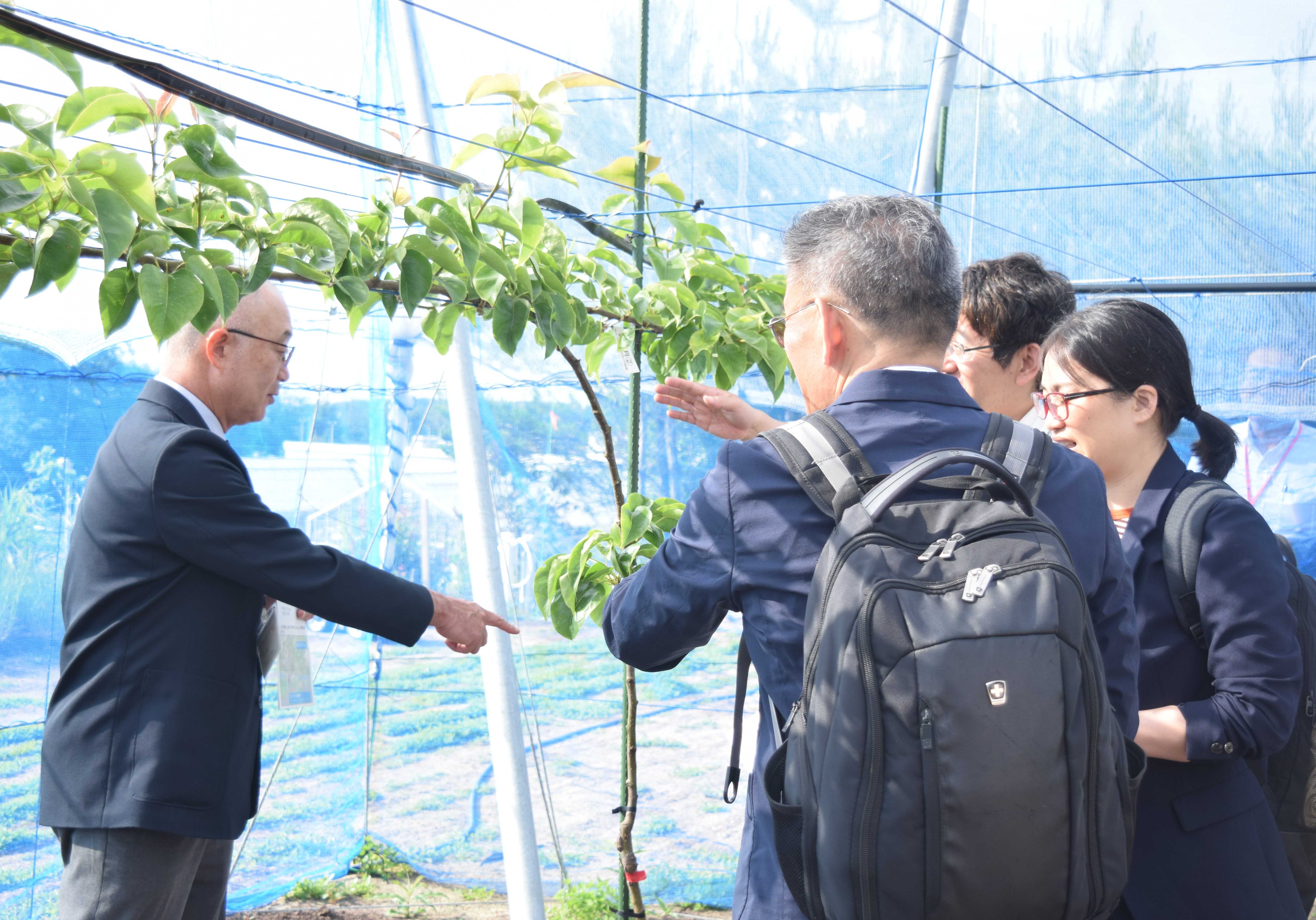 梨を育てている圃場やイチゴのビニールハウスを見ていただき、質疑応答を含めて充実した意見交換が行われました。見学には中国からの留学生も同行し、説明の通訳をする場面もあり、活躍をしていました。