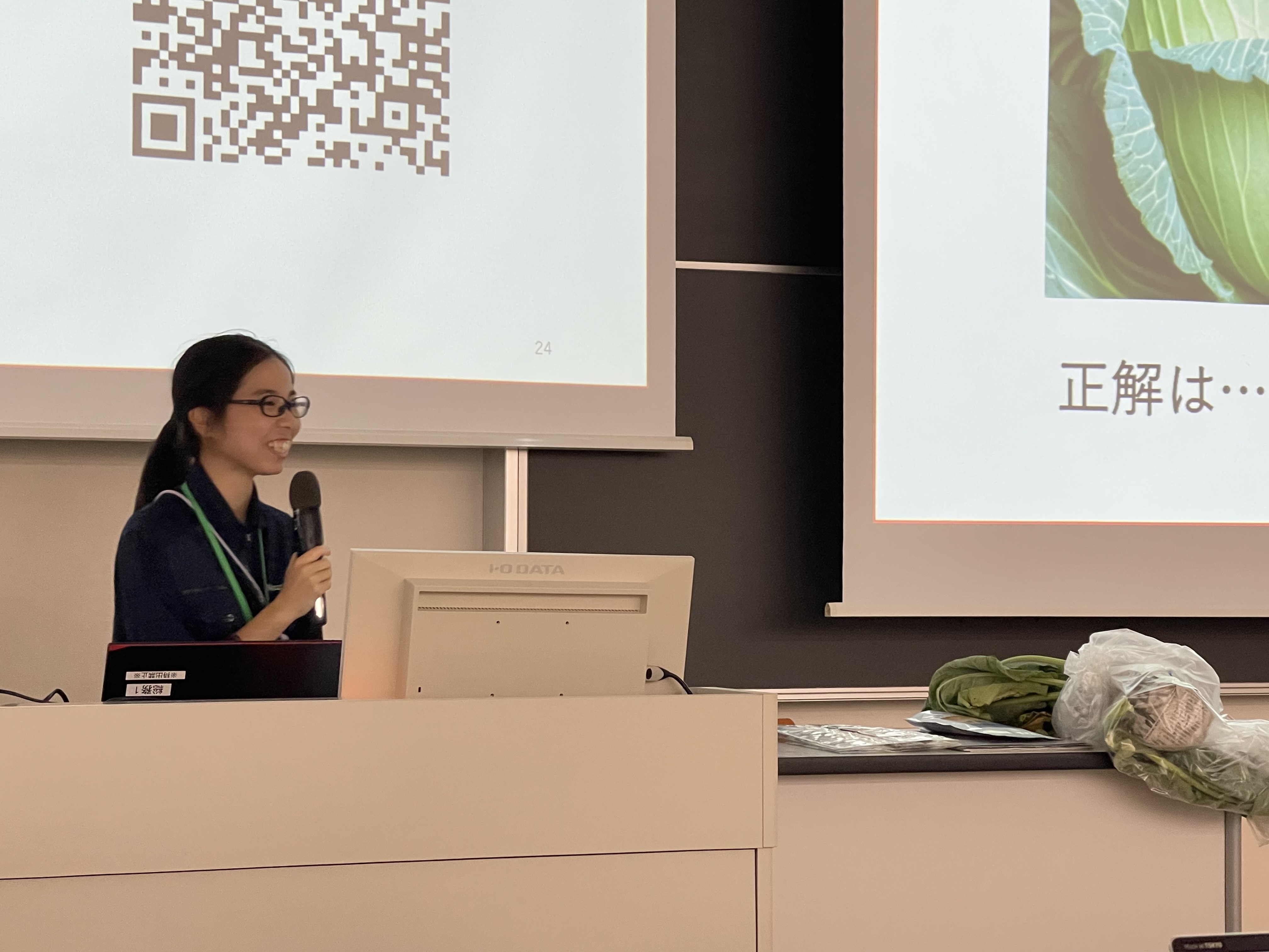 在学生より大越様に「今の仕事で楽しいと思うこと、大変なことは何ですか?」という質問がありました。大越様は「楽しいことは、1つの野菜でも多くの品種に関われること。大変なことは、毎日業務がルーティン化しておらず、毎日様々な業務に携わっていること。」と答えられました。それでも、毎日ワクワクしながらお仕事をされているそうです。