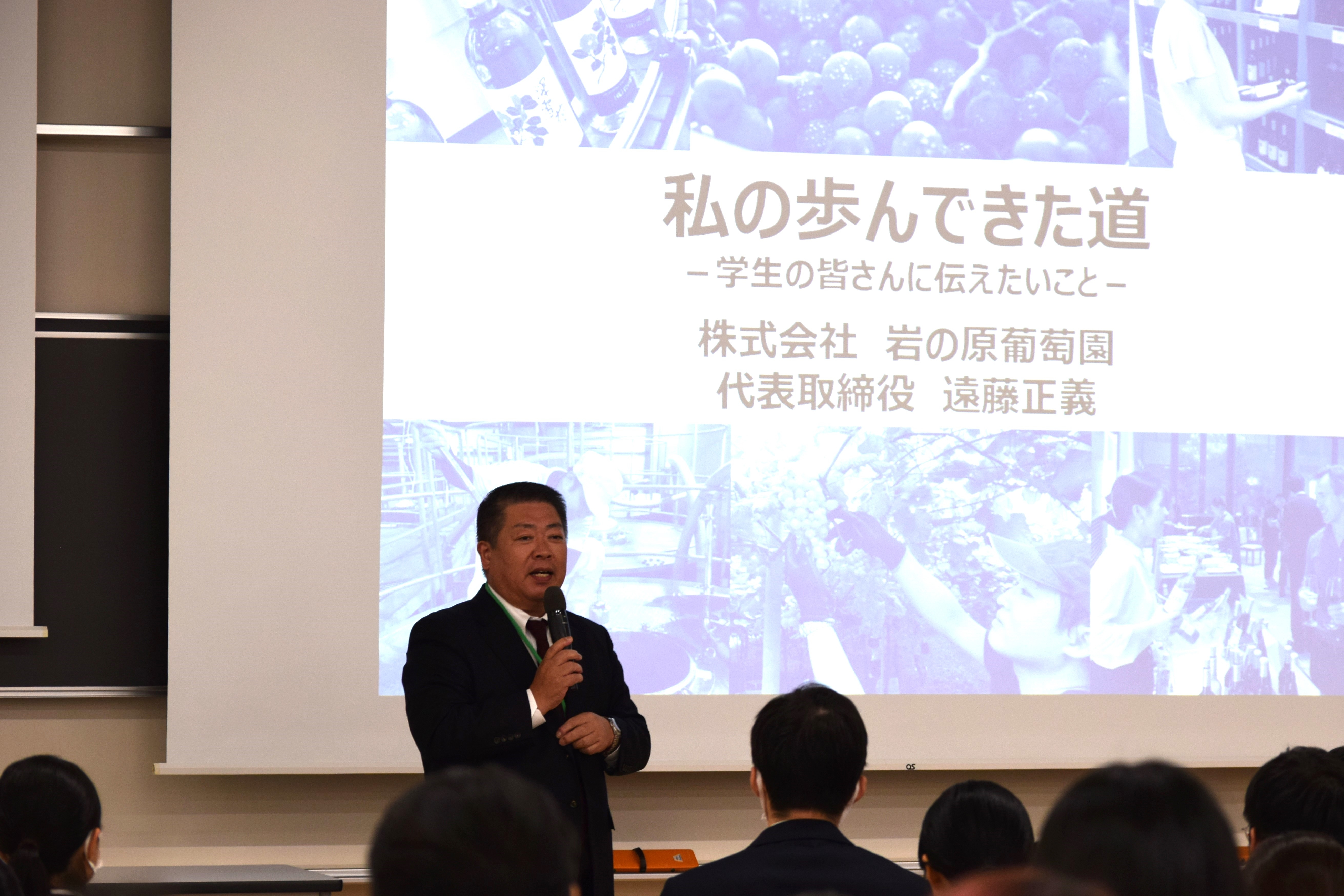 第1部 就職講演会「夢実現セミナー」(就職講演会)では、株式会社 岩の原葡萄園の代表取締役社長 遠藤 正義 様を講師に迎え、これから就職活動を始める3年生に向けて、これまでのキャリアや取り組んできた仕事について、非常に参考になるお話をしていただきました。