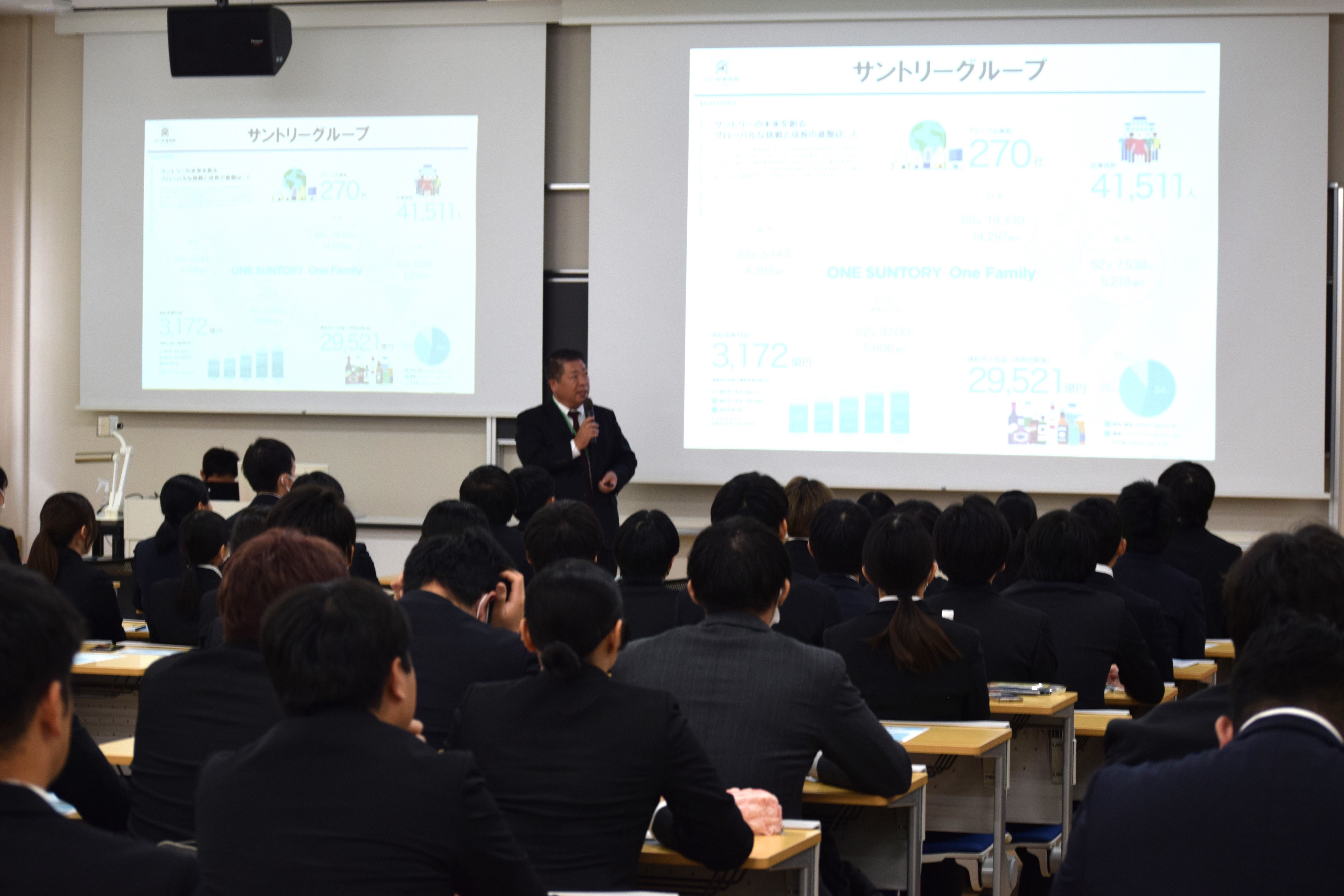 就職活動の様子や営業職としてご経験されたこと、ウィスキーの低迷期にどうやって市場を復活させたのか、様々な取り組みや経営者としての視点などを事例とともにお話しいただきました。また、現在、岩の原葡萄園で取り組まれていることなど、これから社会に出る学生達にとって非常に参考になるお話をいただきました。