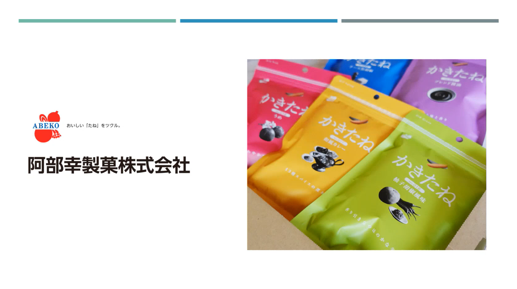 阿部幸製菓株式会社様は、米菓、惣菜、鏡餅などの食品を製造・販売をされています。特に『かきたね』という商品名で様々な味の柿の種を作られていることや『柿の種のオイル漬け』で知られています。