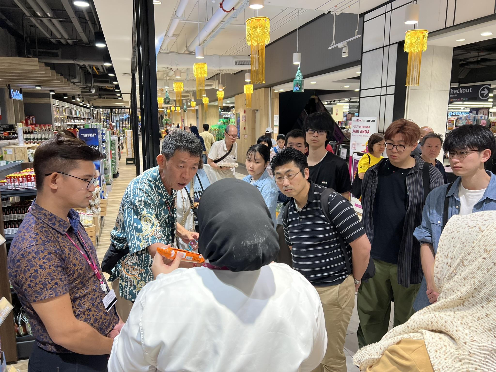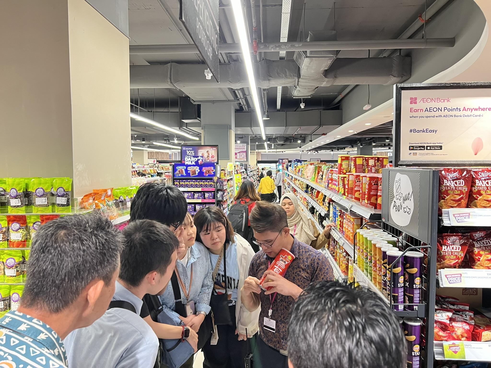 同日午後には、現地の大型スーパー「AEONマレーシア」を訪問し、流通現場におけるハラル対応を学びました。そして、AEONのマネージャーの方、ハラル担当の方からお話を聞きました。ハラルというと食品というイメージがありましたが、学生の質問から、ハラルが食品だけではなく衣料品等の素材まで幅広いものであるという気づきがありました。店内ではハラル認証マークを確認したり、ハラルとノンハラルで買い物かごが分けられている様子などを見たりしました。