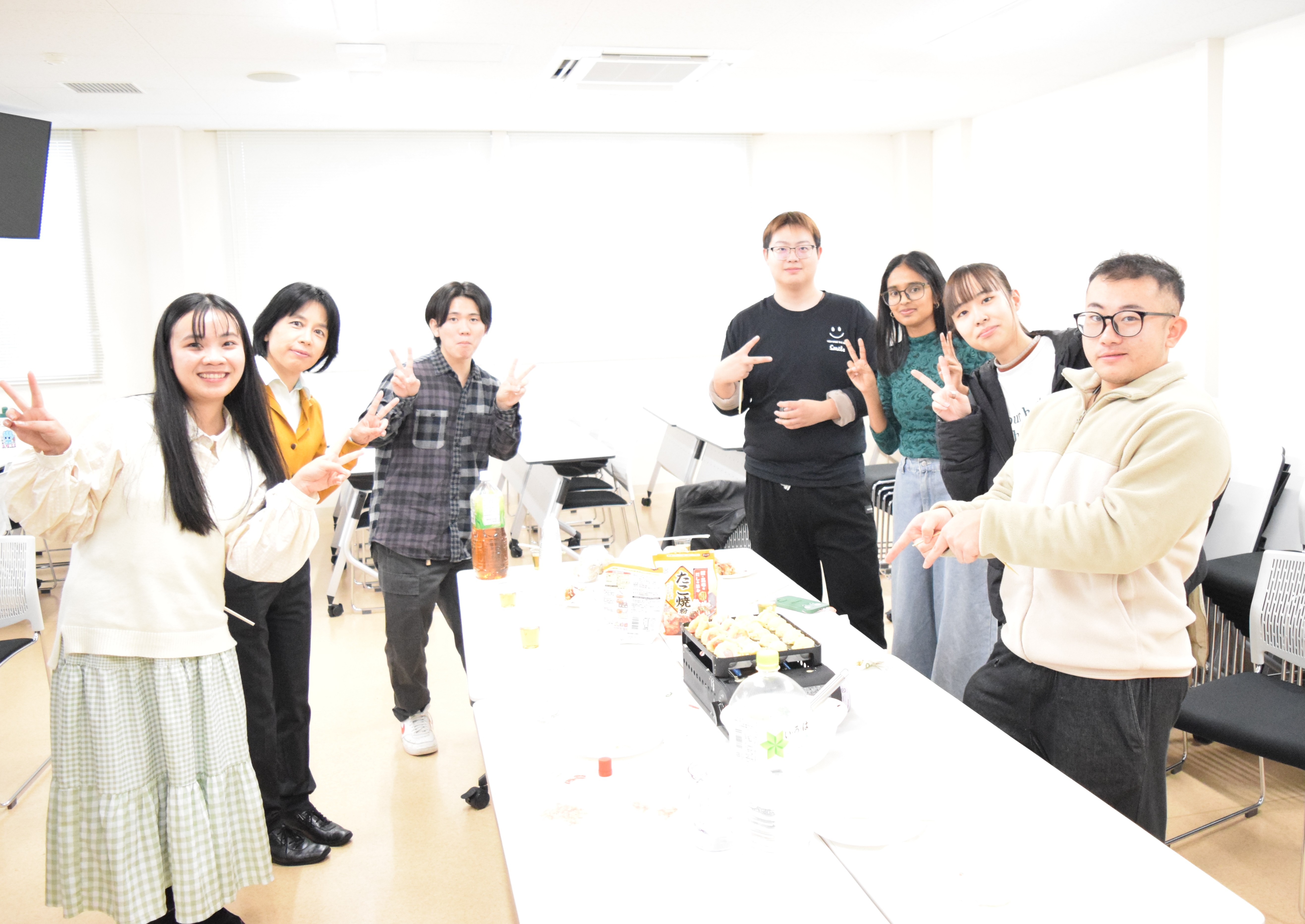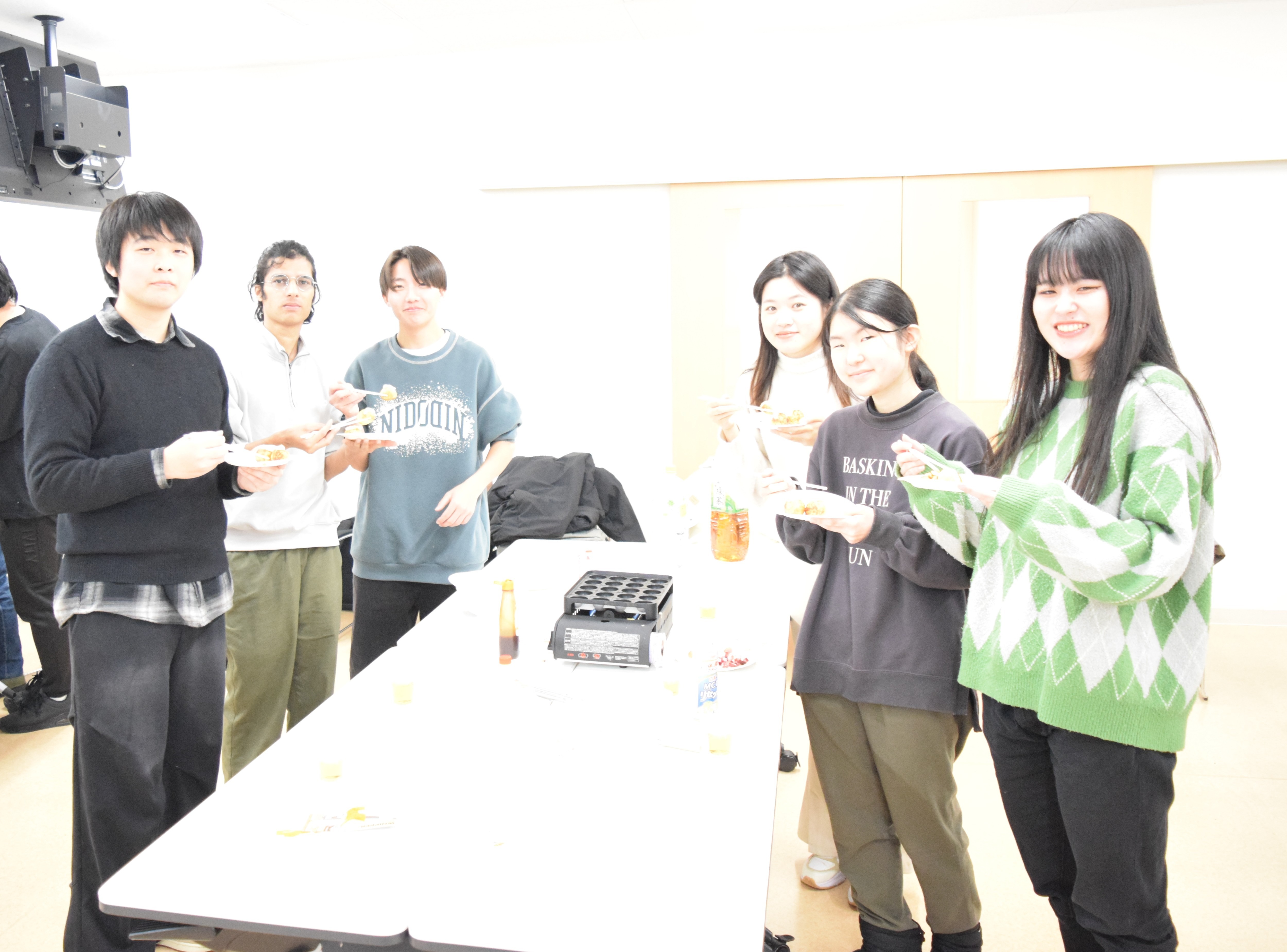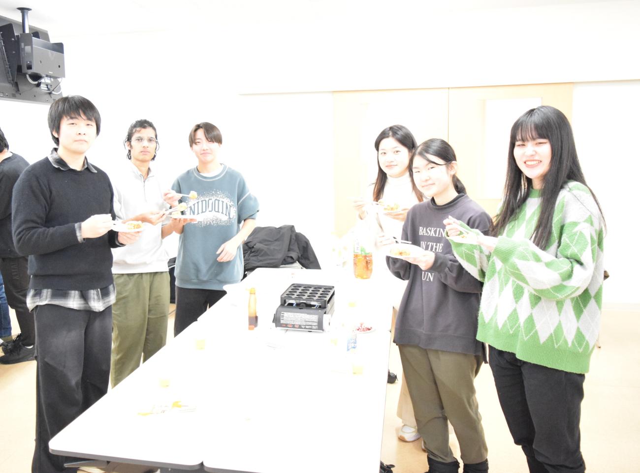 参加した学生からは、「みんなと仲良くたこ焼きやゲームができた(日本人学生)」「これまで話したことのない留学生や学生と交流できた。たこ焼き作りも初めてだったがとても楽しめた(日本人学生)」「たこ焼きを初めて作り、とても面白かった。福笑いも楽しかった(留学生)」といった感想が寄せられました。