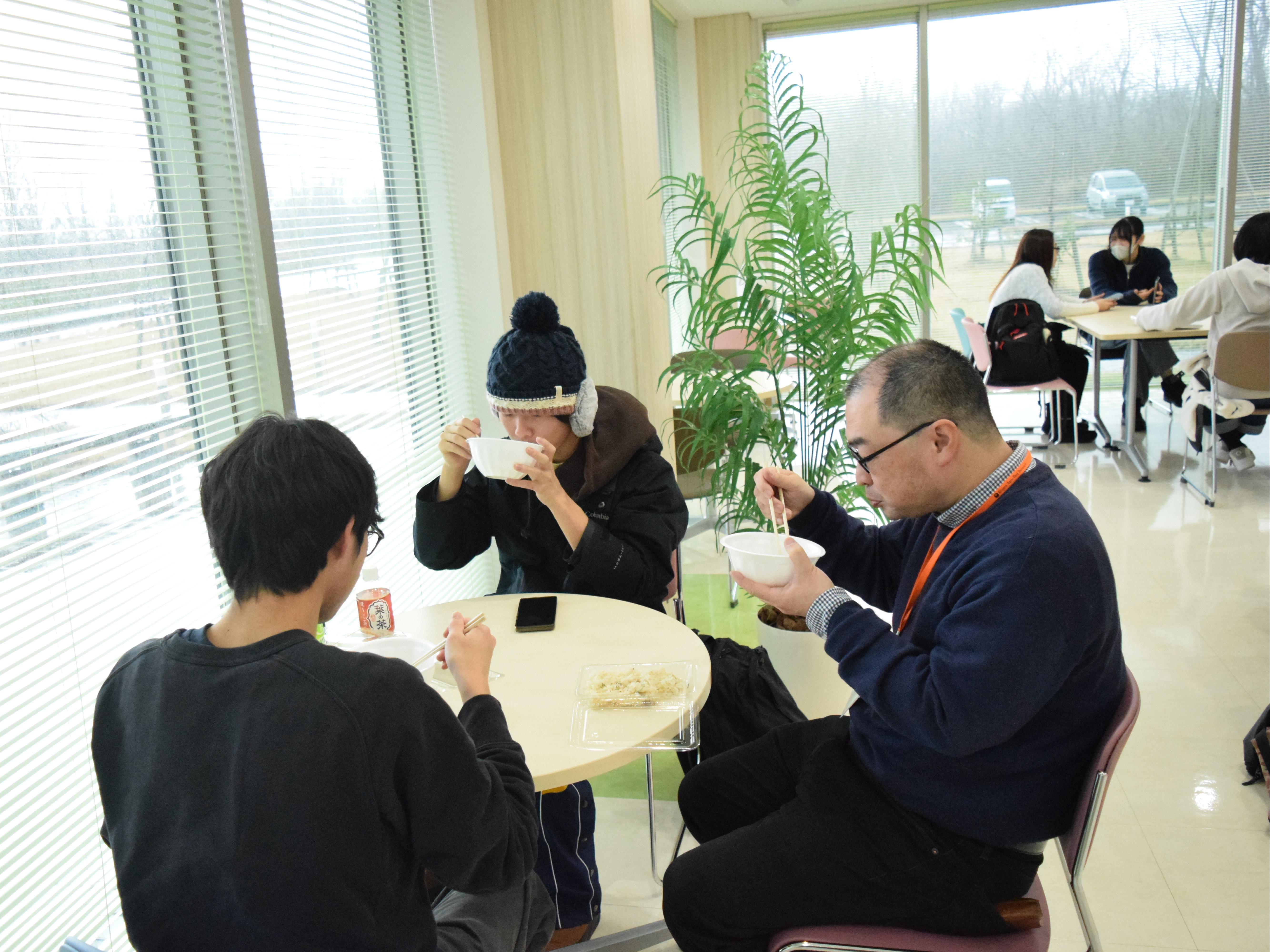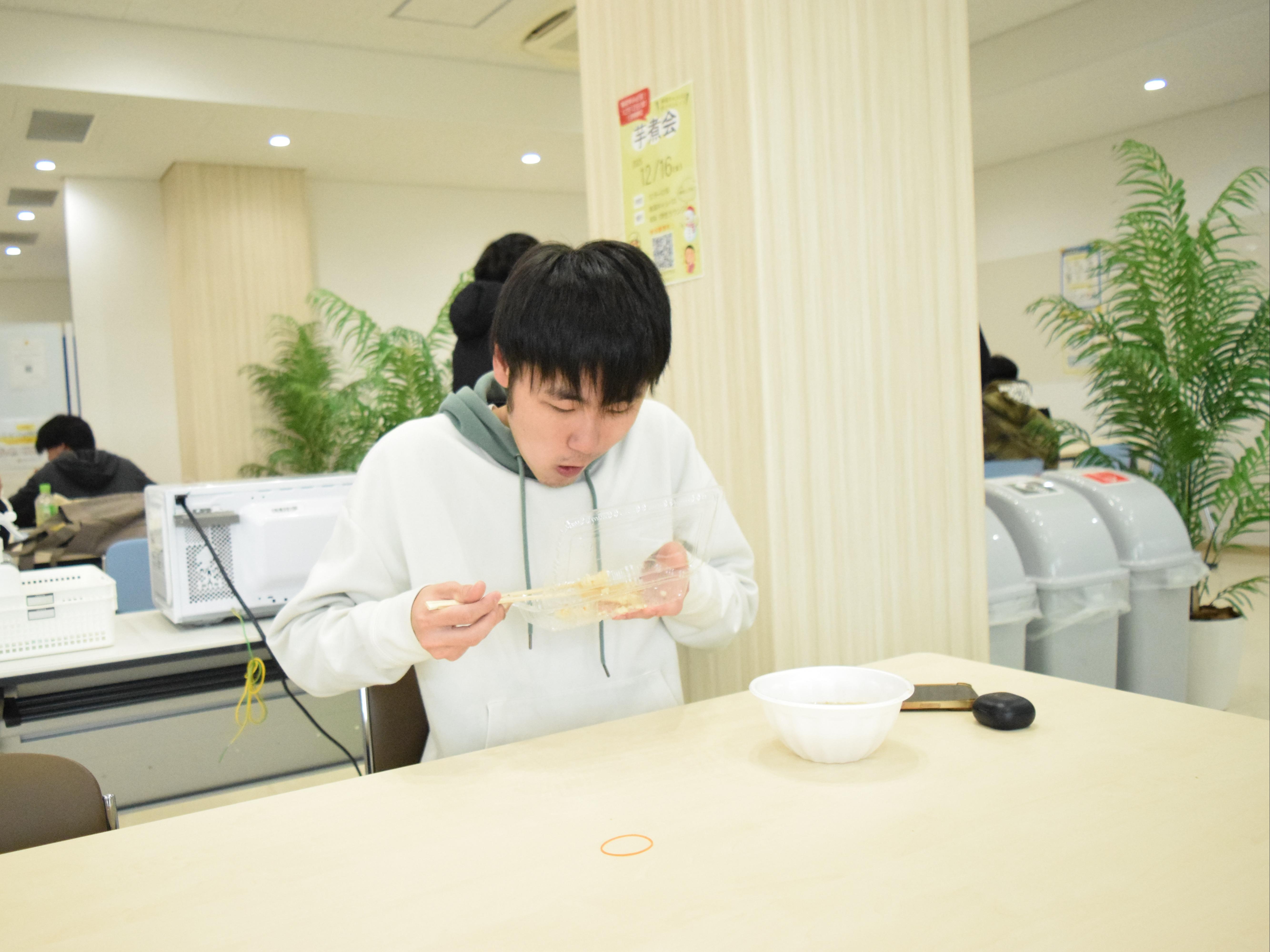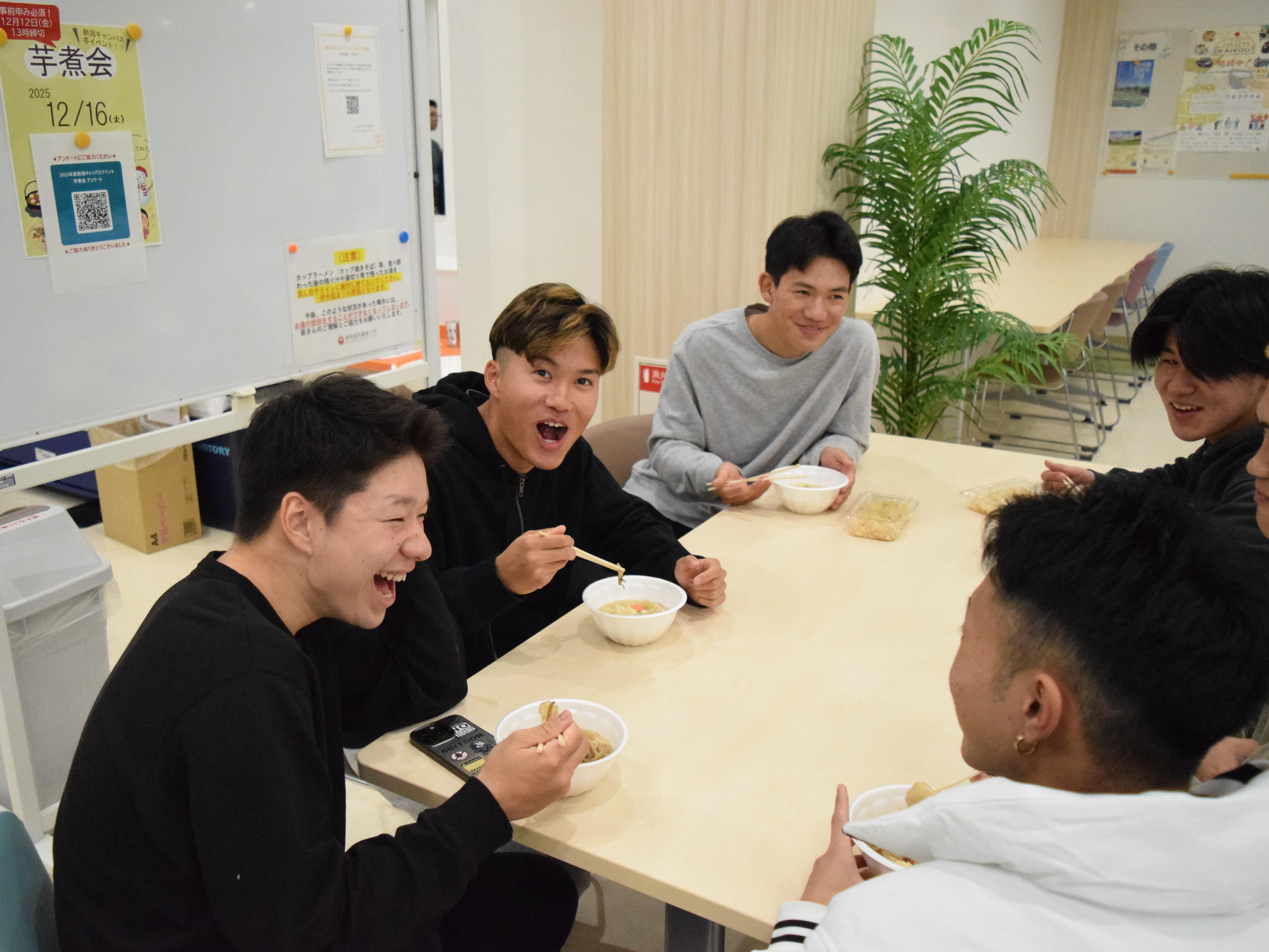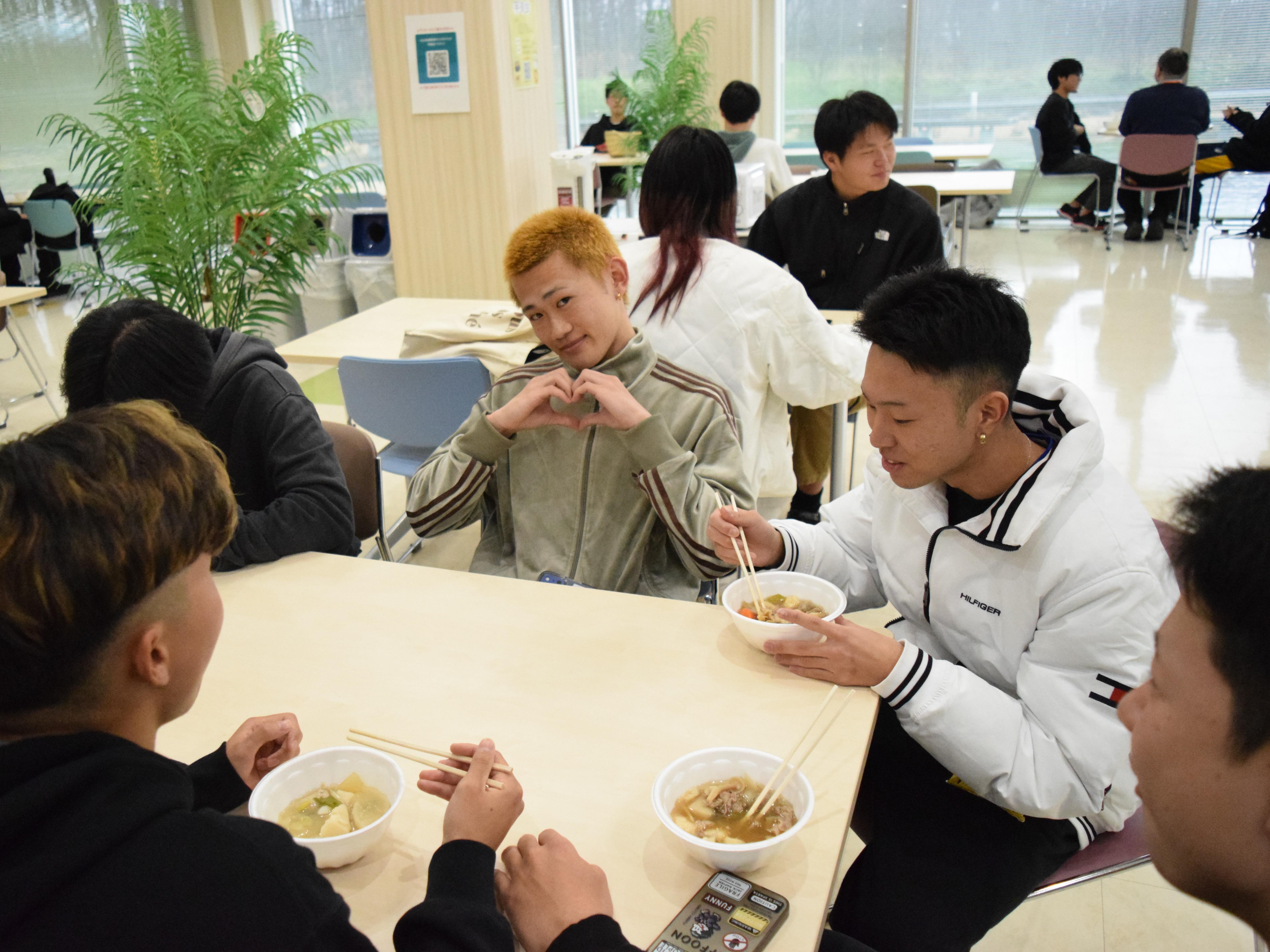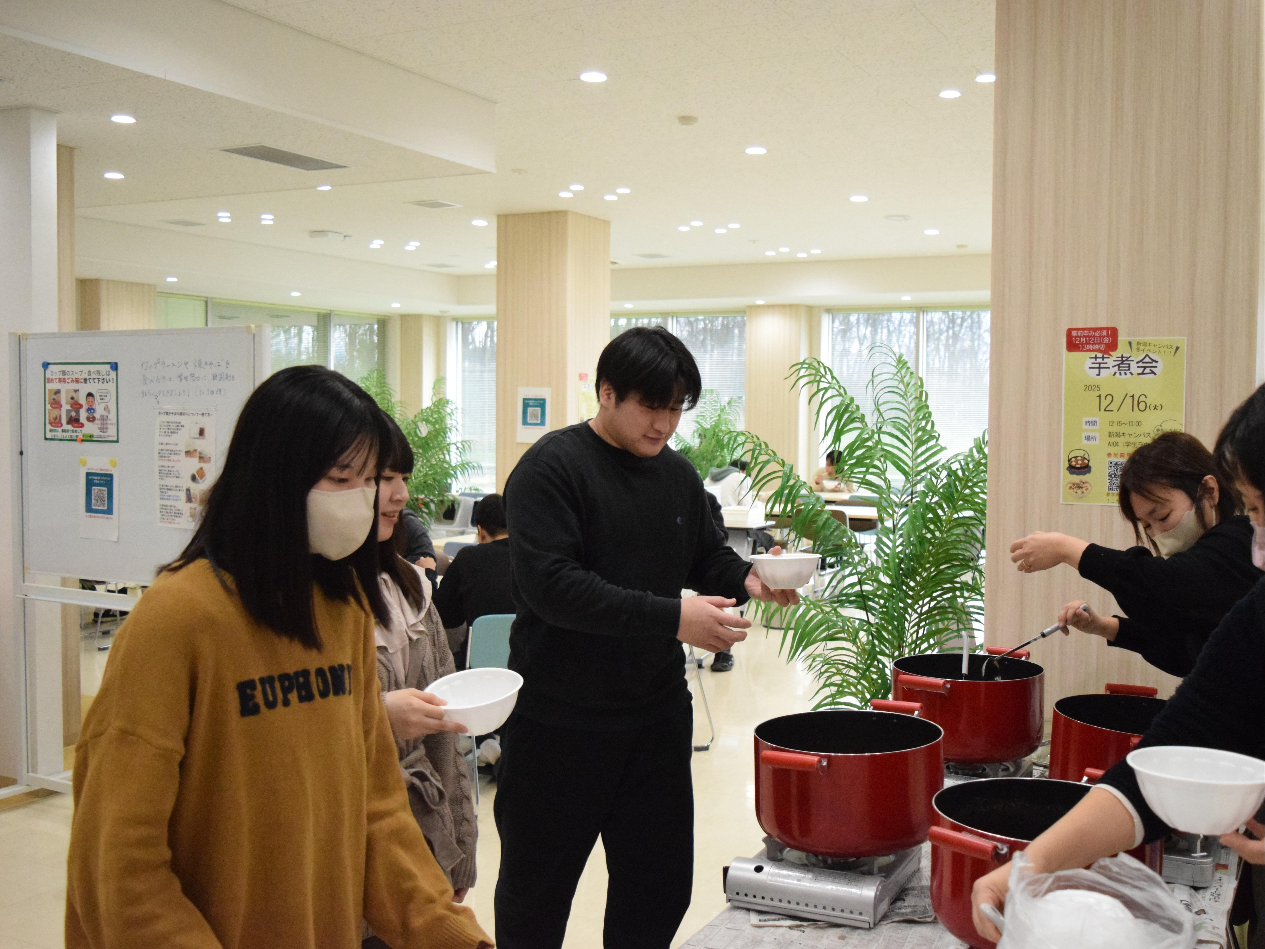 中には2杯、3杯とおかわりをして「しょうゆ風味」と「味噌風味」の芋煮を食べ比べをする学生もおり、寒い季節にぴったりの温かい料理を楽しんでいる様子が印象的でした。