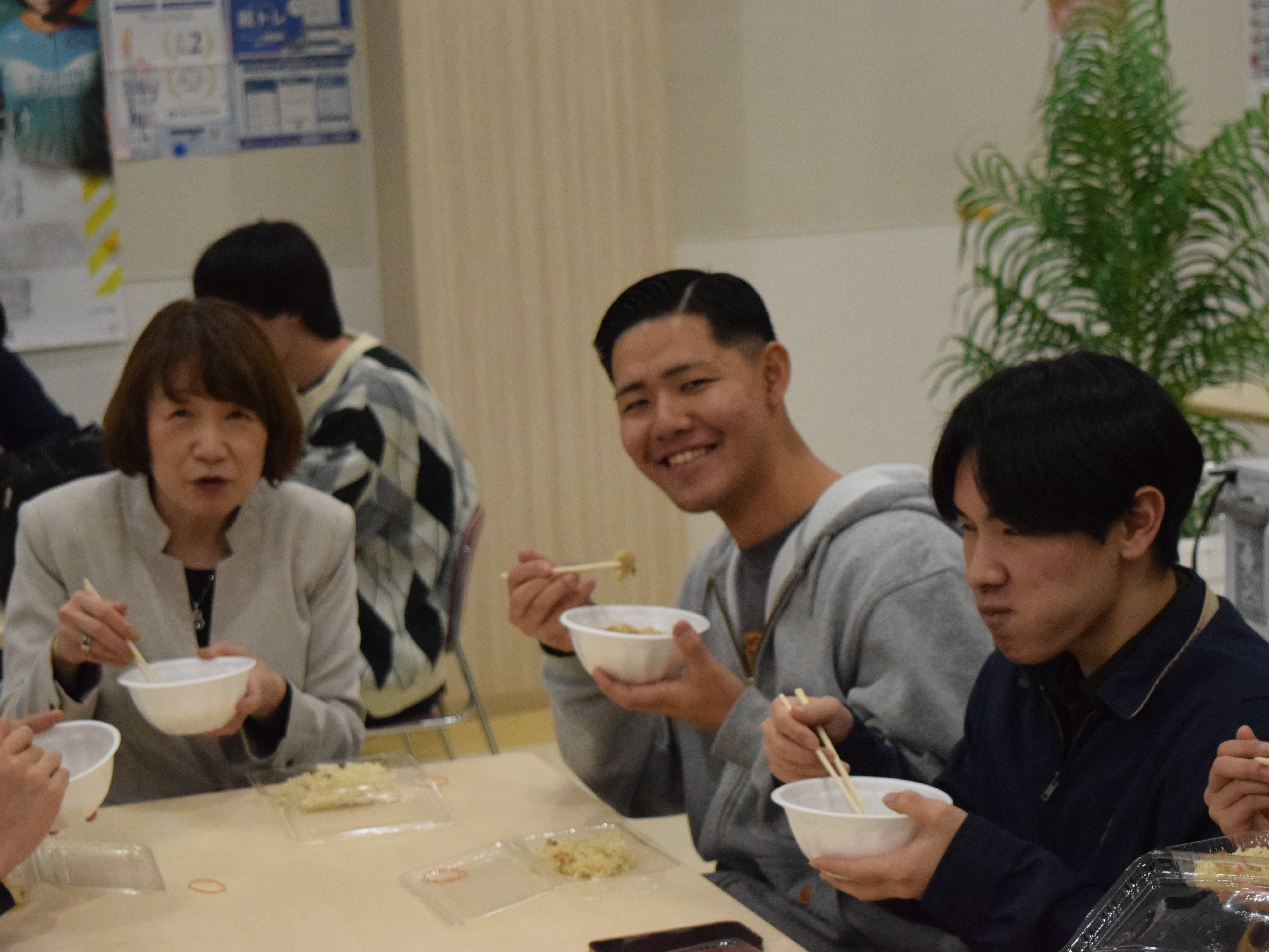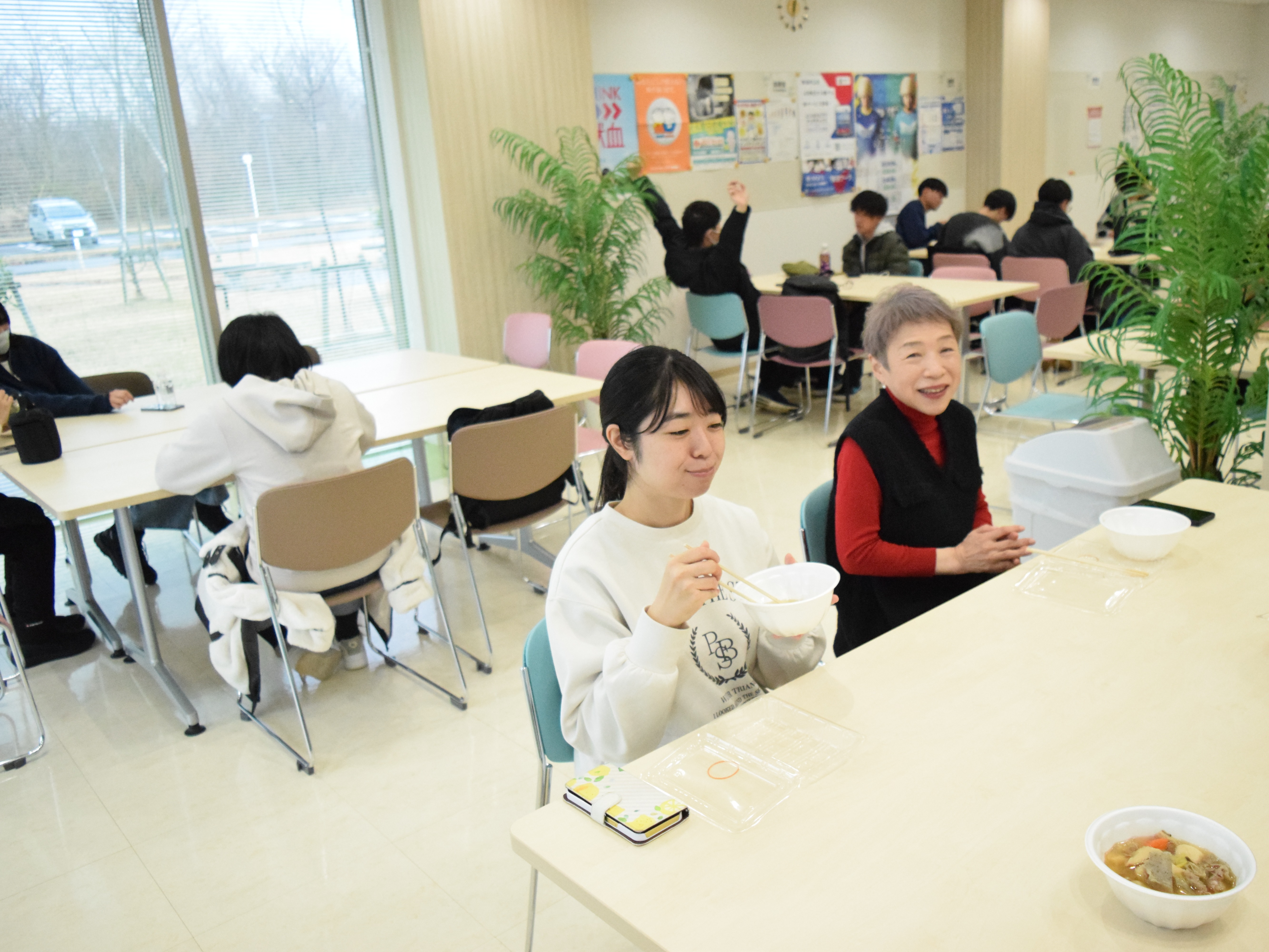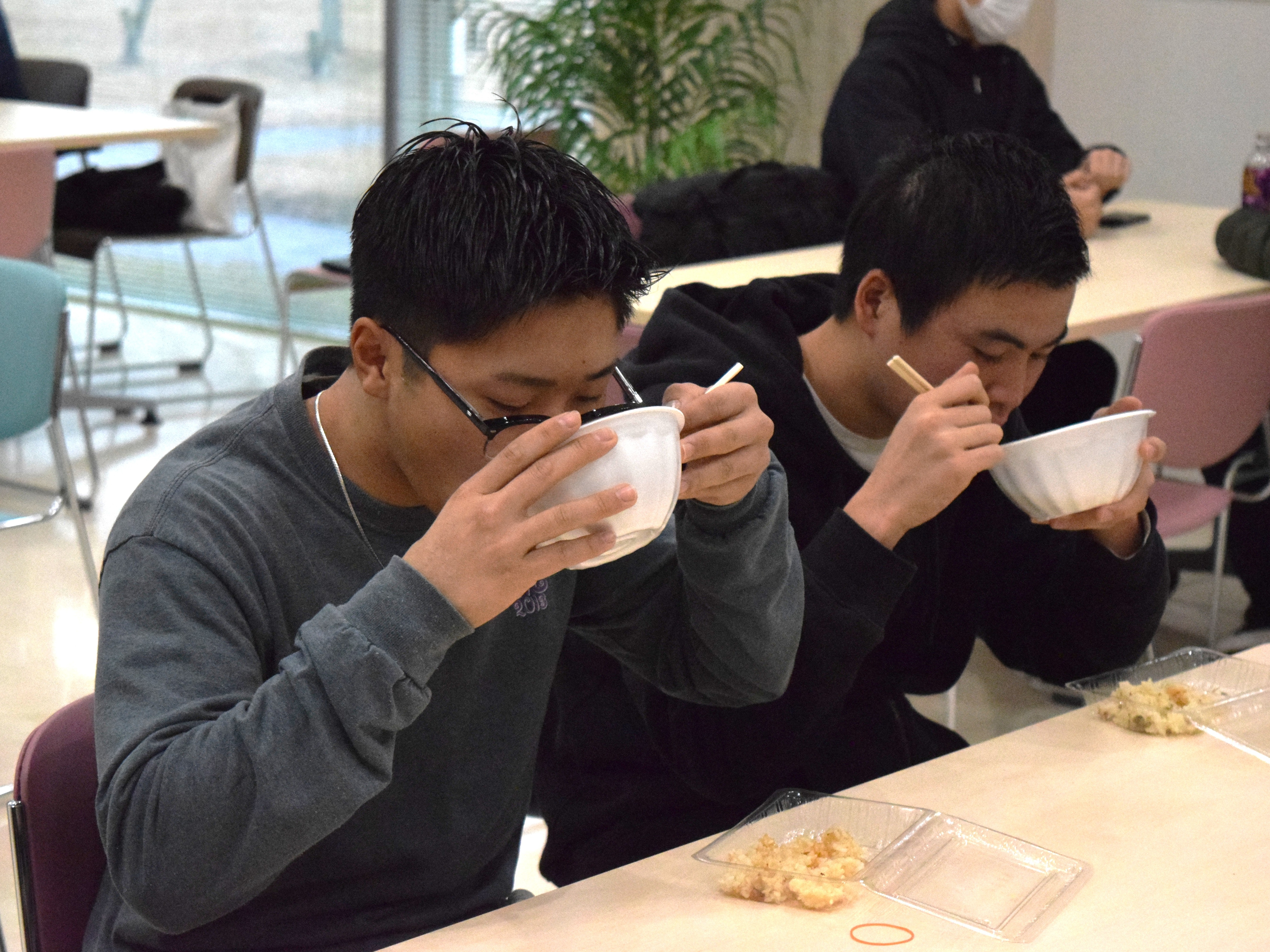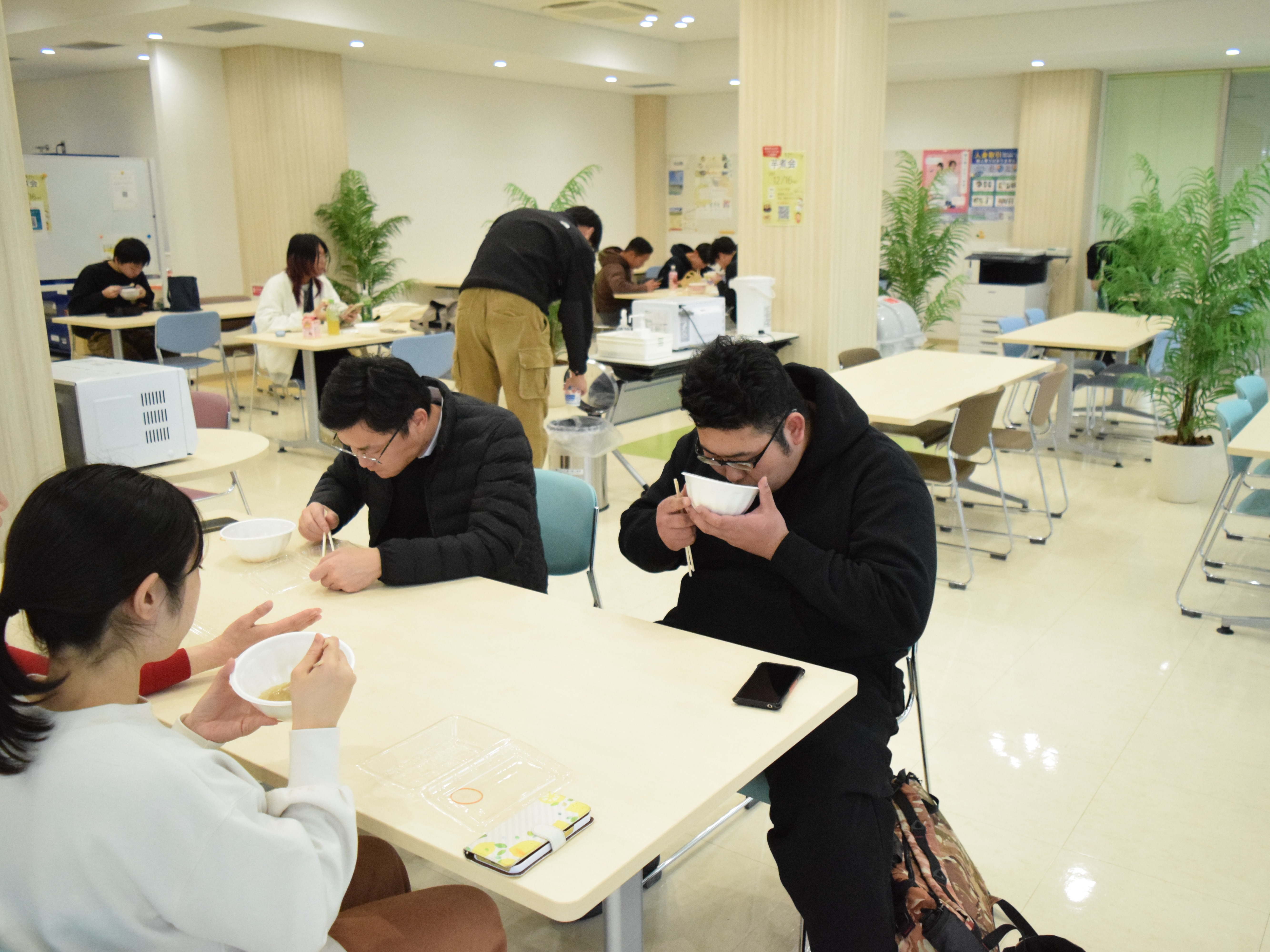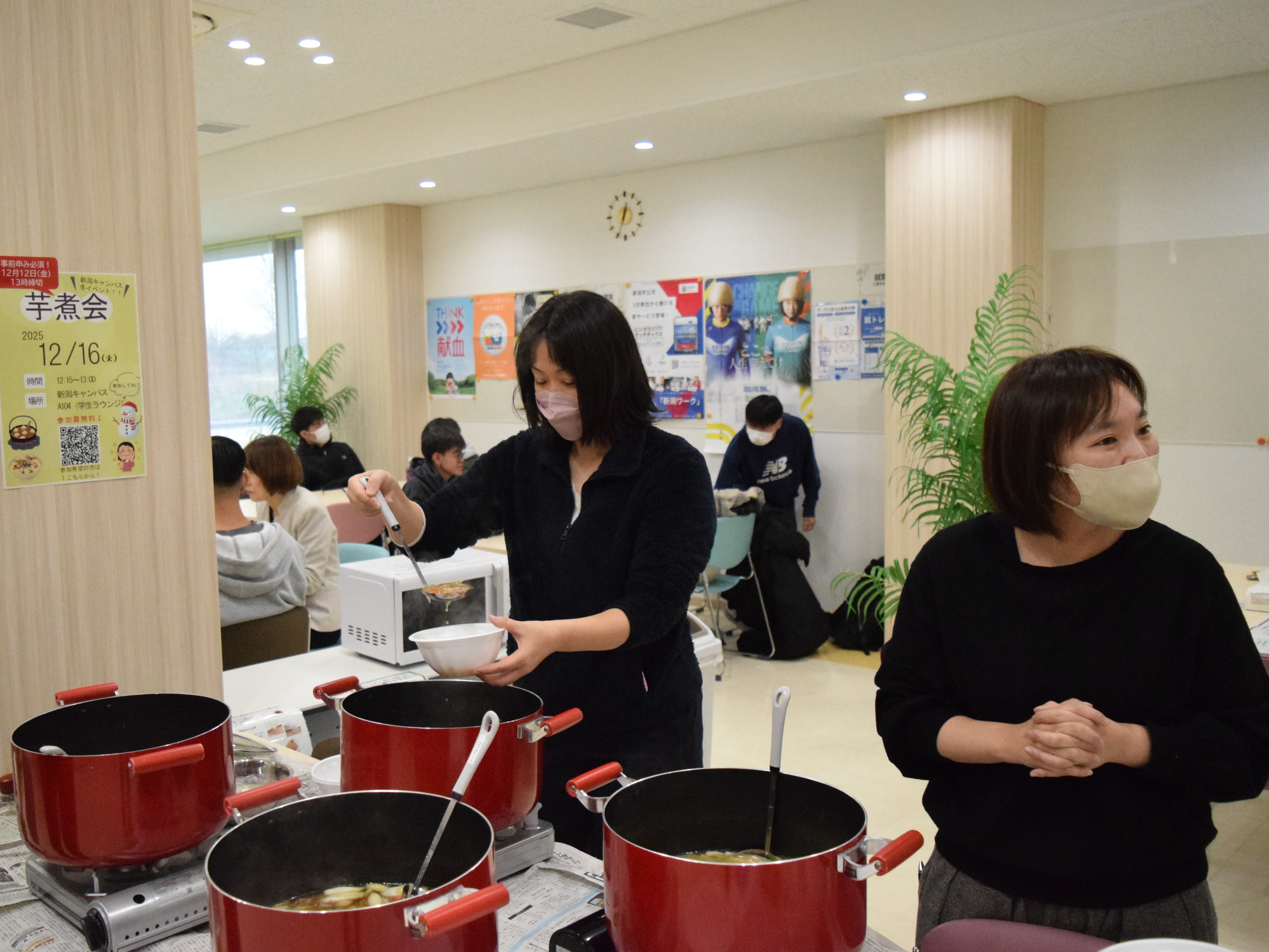 中には2杯、3杯とおかわりをして「しょうゆ風味」と「味噌風味」の芋煮を食べ比べをする学生もおり、寒い季節にぴったりの温かい料理を楽しんでいる様子が印象的でした。