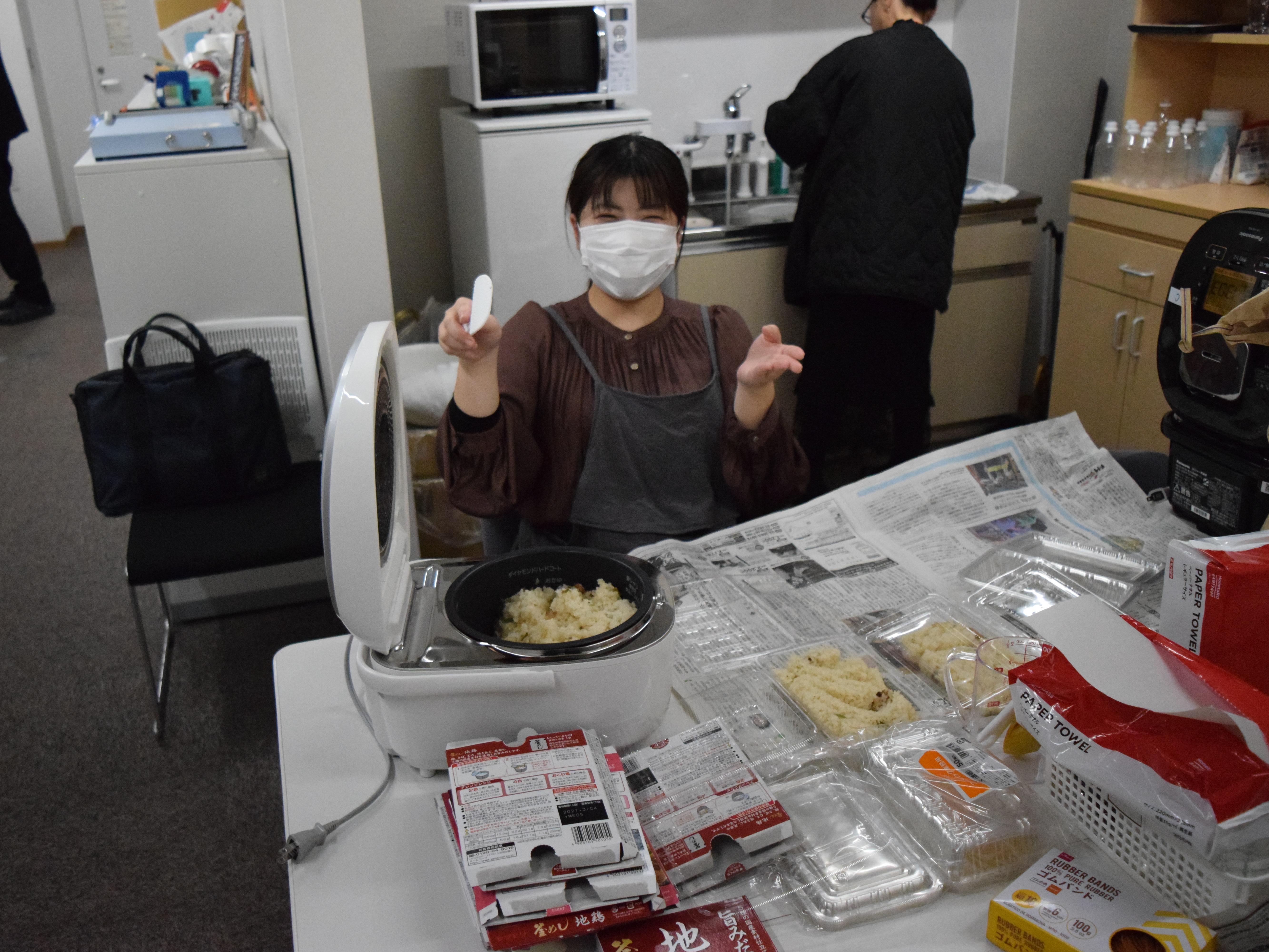 当日は、企画・準備を担当してくれた学生たちが朝から集合し、しょうゆ風味の芋煮と味噌風味の芋煮、さらにNAFU米を使ったアサリの炊き込みご飯と鶏ごぼうの炊き込みご飯の計4種類を心を込めて準備してくれました。