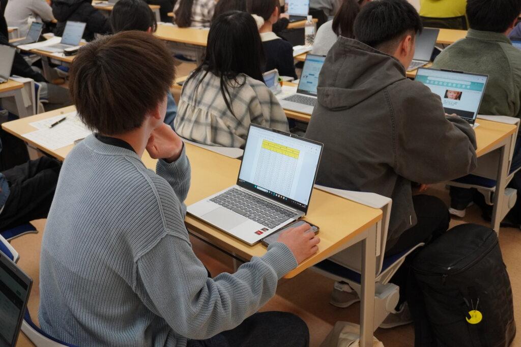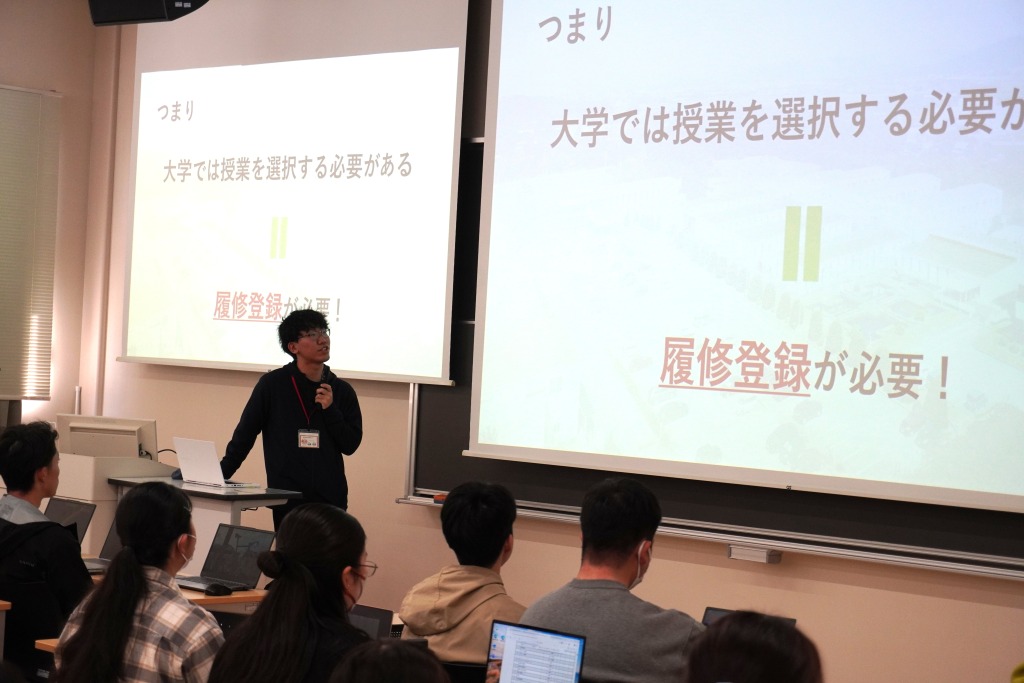 お昼の時間が終わった後には、学生スタッフが新入生に向けて履修登録の説明を行いました。
