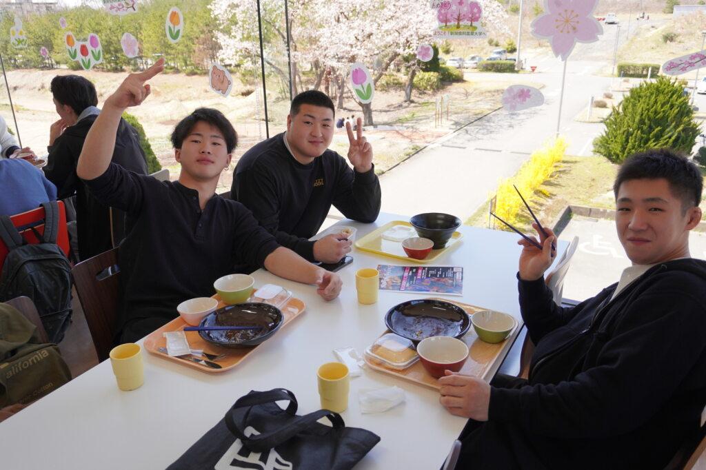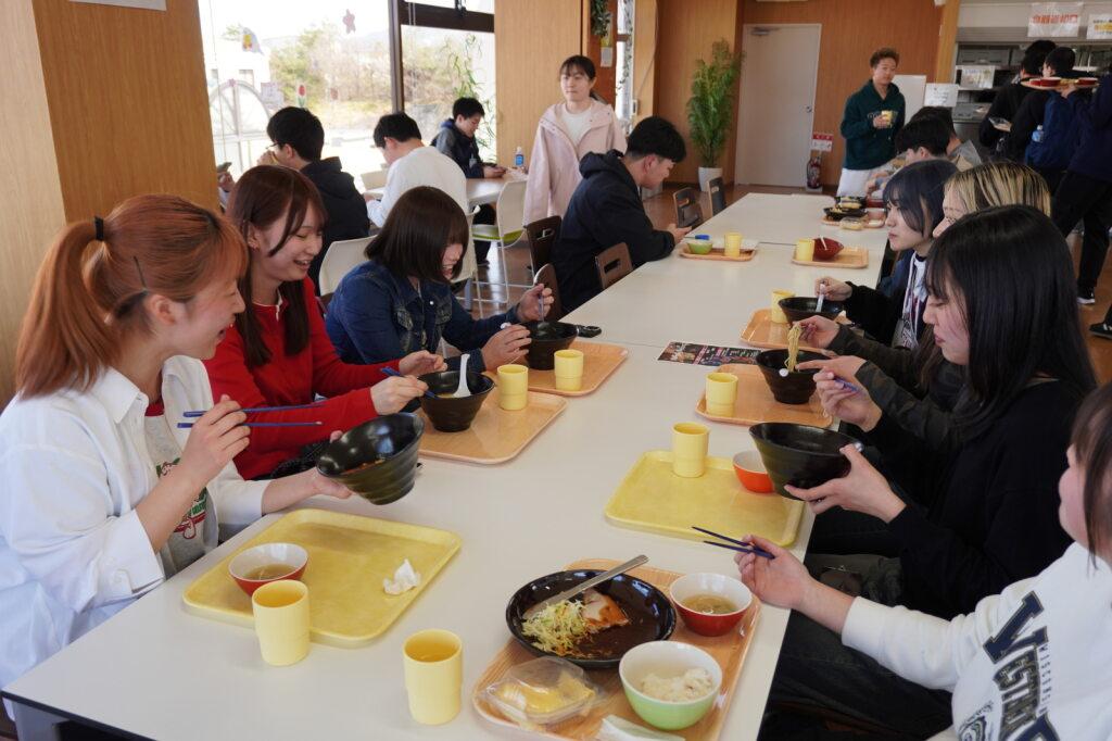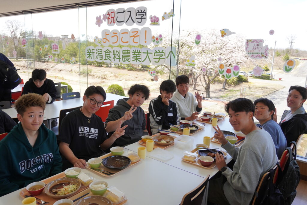 学食では、新入生が和気あいあいと食事を楽しむ姿が見られました。