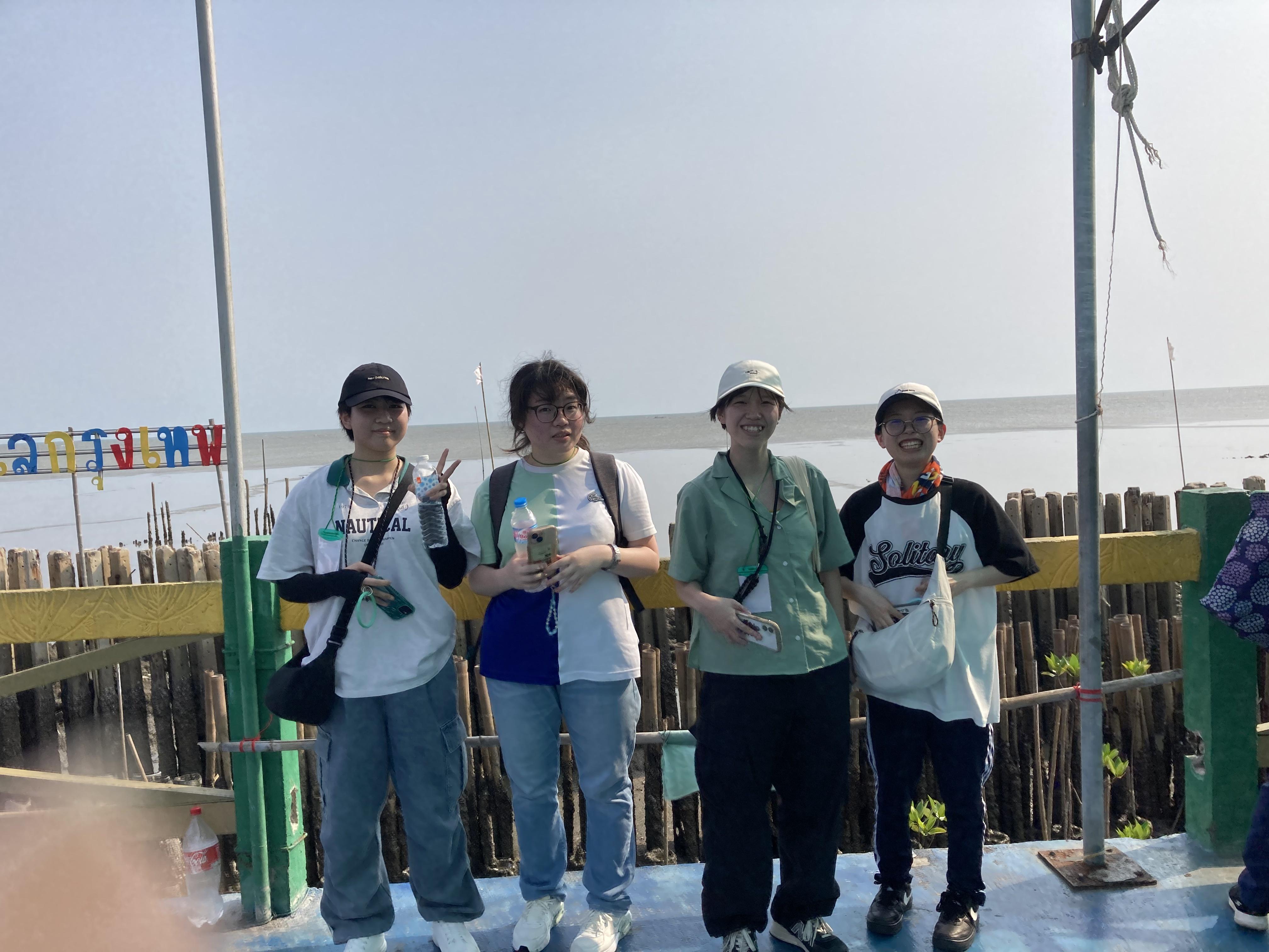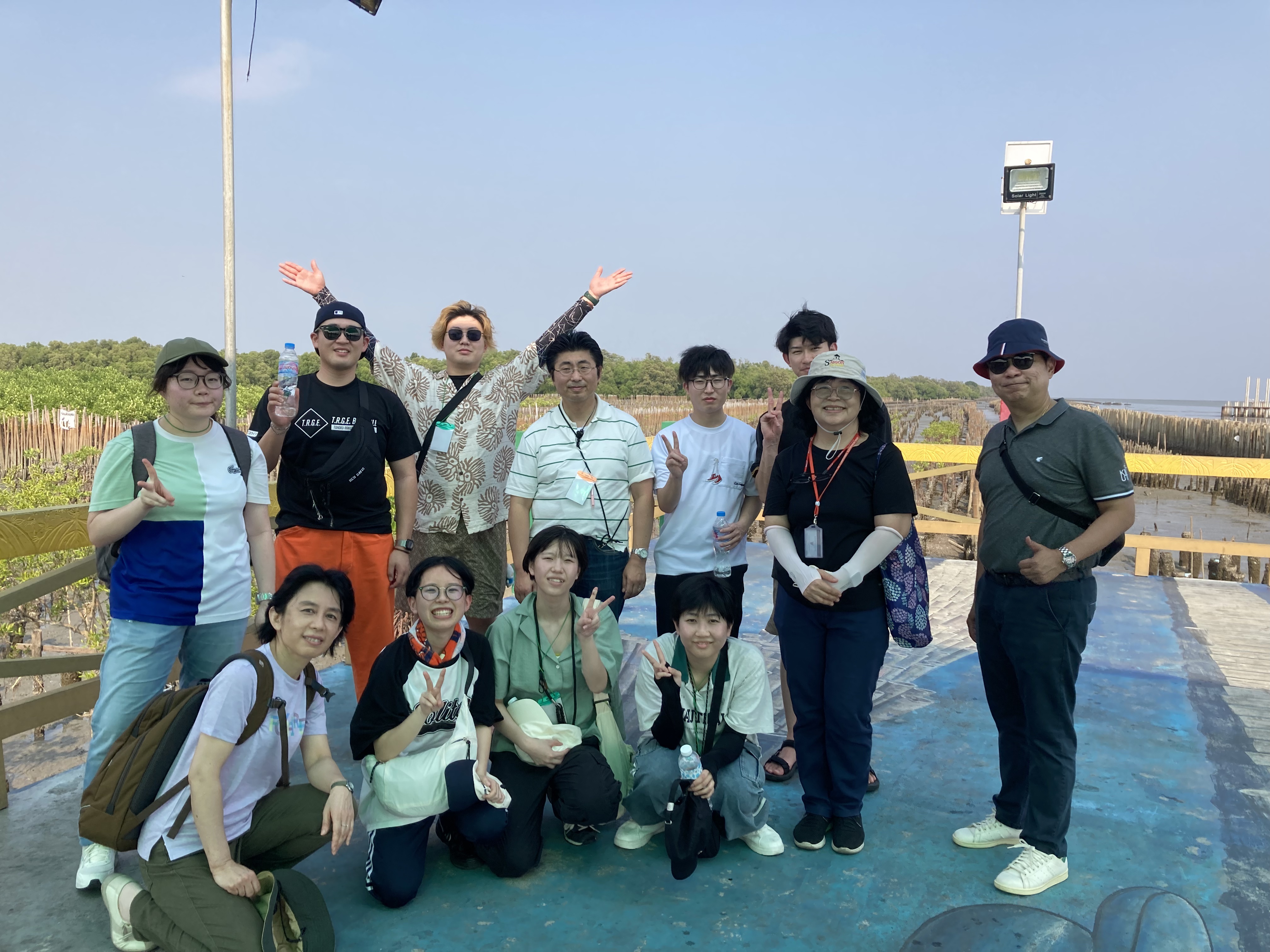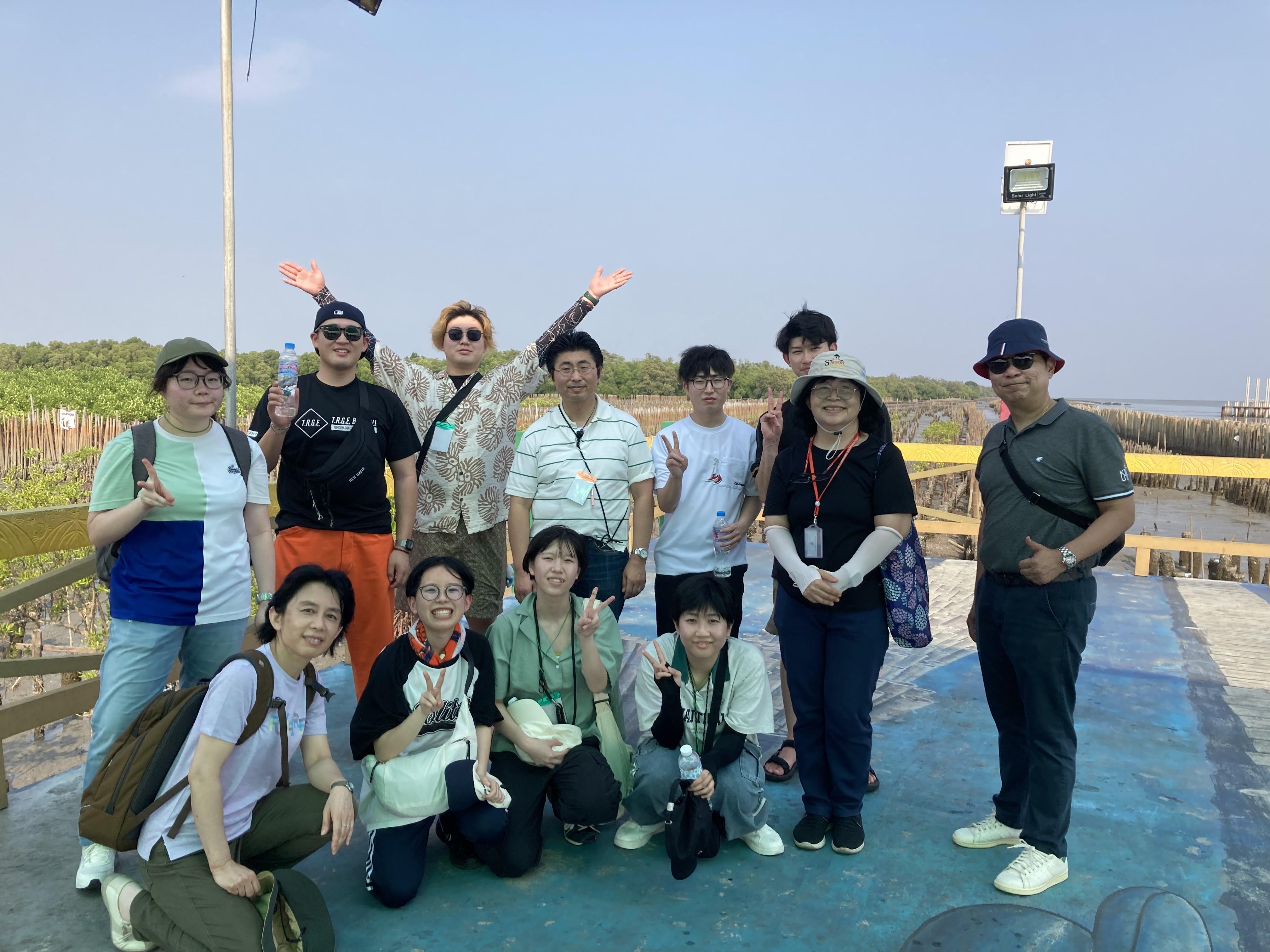 自然体験として、KMUTT近郊のマングローブ林を訪問しました。現地では、湿地帯に広がる植生や生態系について説明を受けながら見学を行いました。マングローブ林が生態系の維持や水産資源に果たす役割について学び、自然環境と食料資源との関係について理解を深めました。