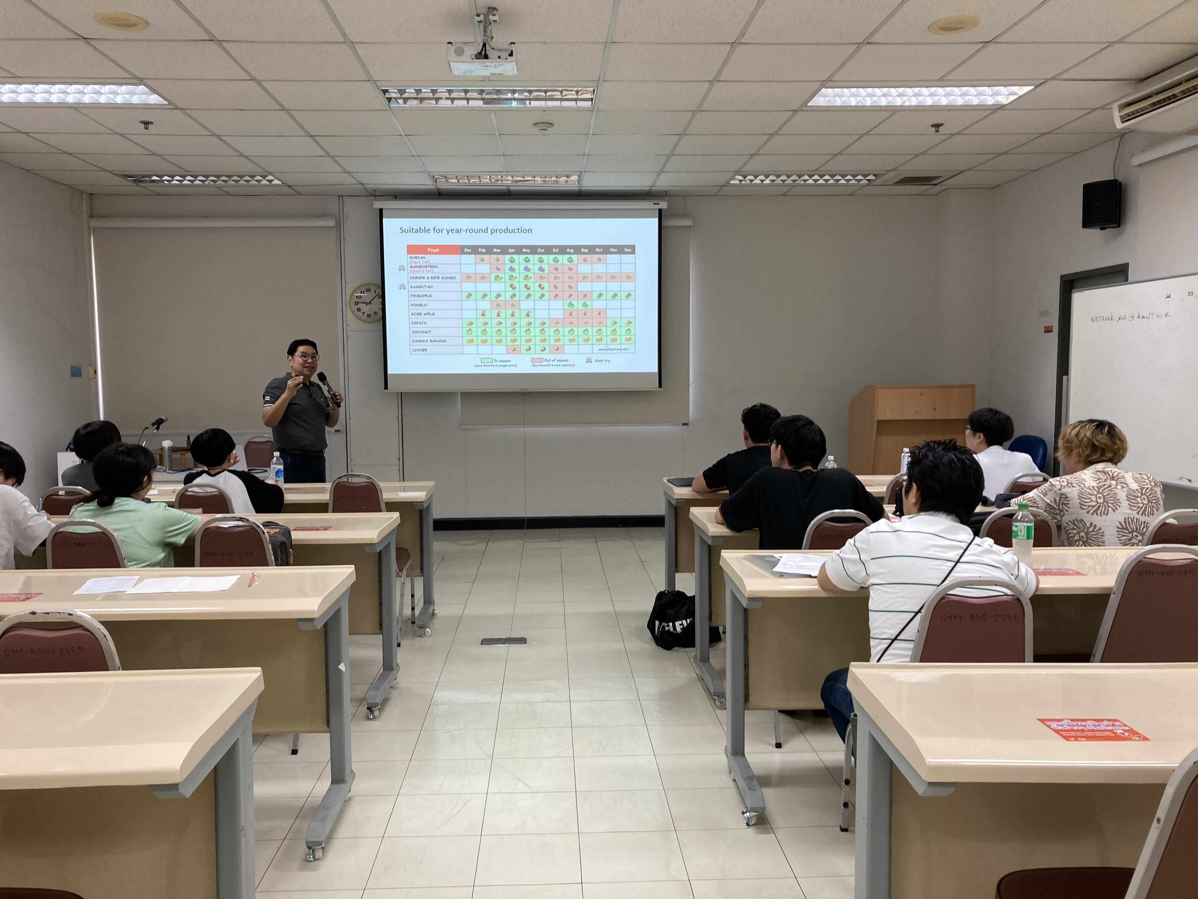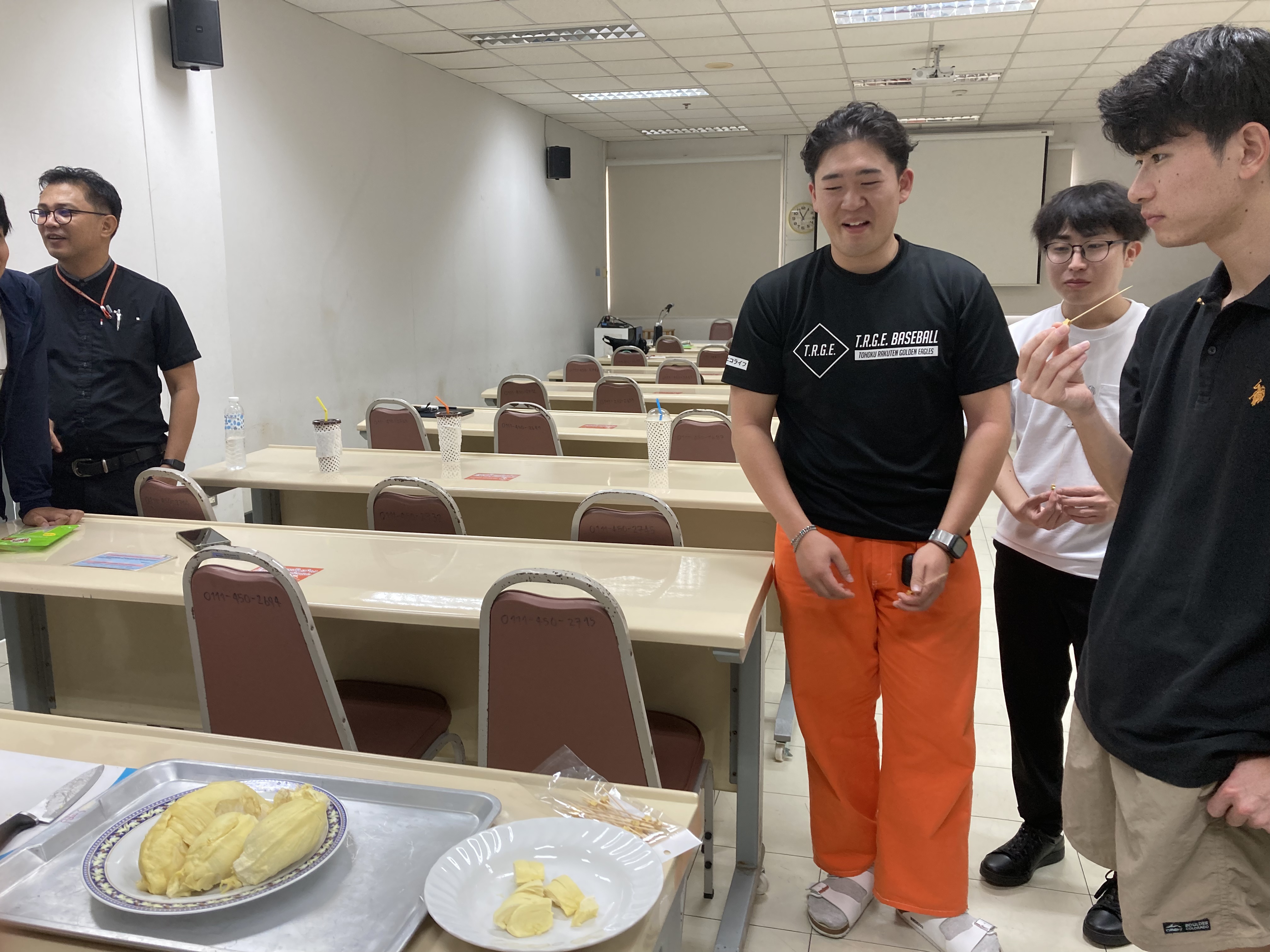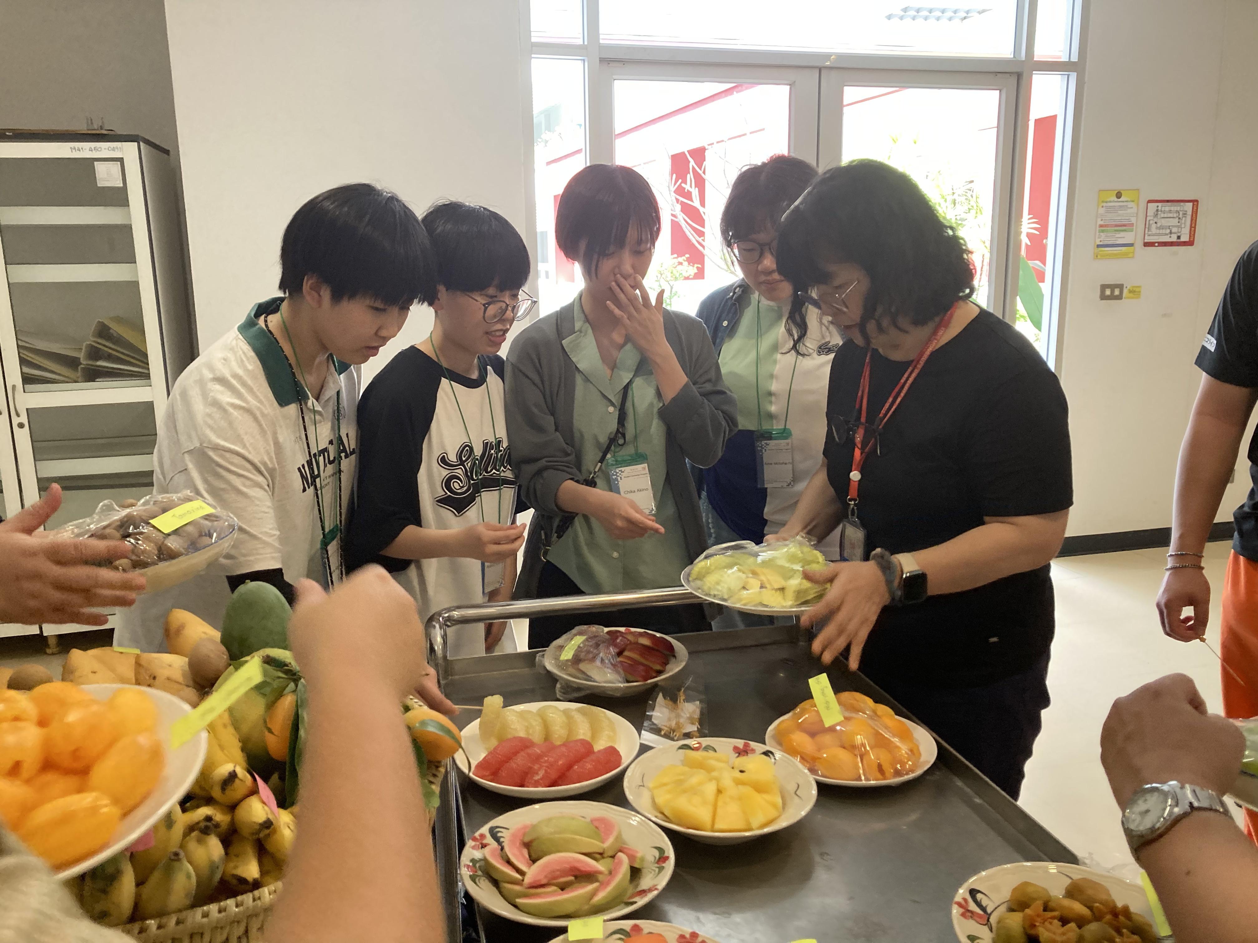 続いて、タイを代表する果物であるドリアンとマンゴーについて学びました。講義では、それぞれの特徴や栽培背景に加え、タイにおける消費文化や経済的価値についても取り上げられました。講義後にはドリアンの試食も行い、実際の味や香りを体験することで、講義内容への理解を深めました。