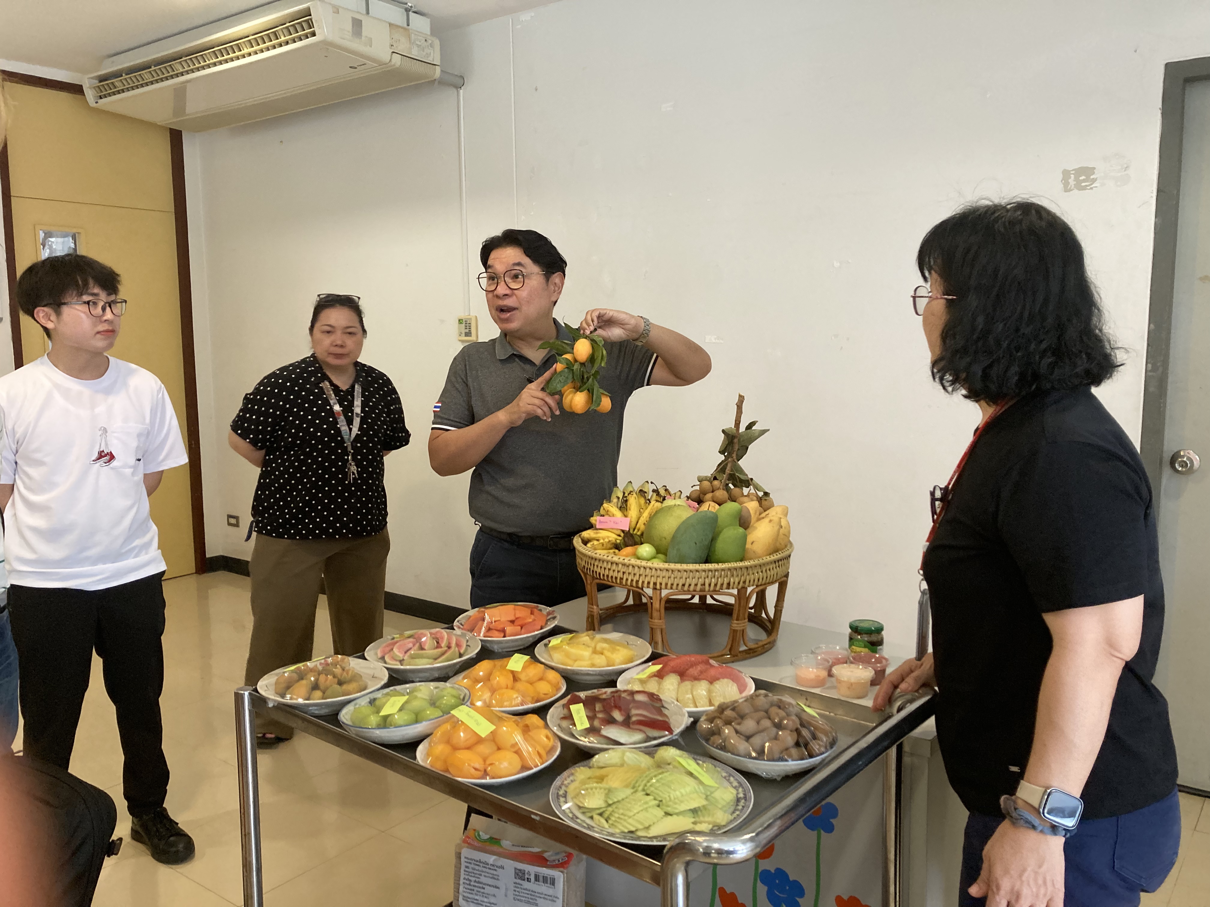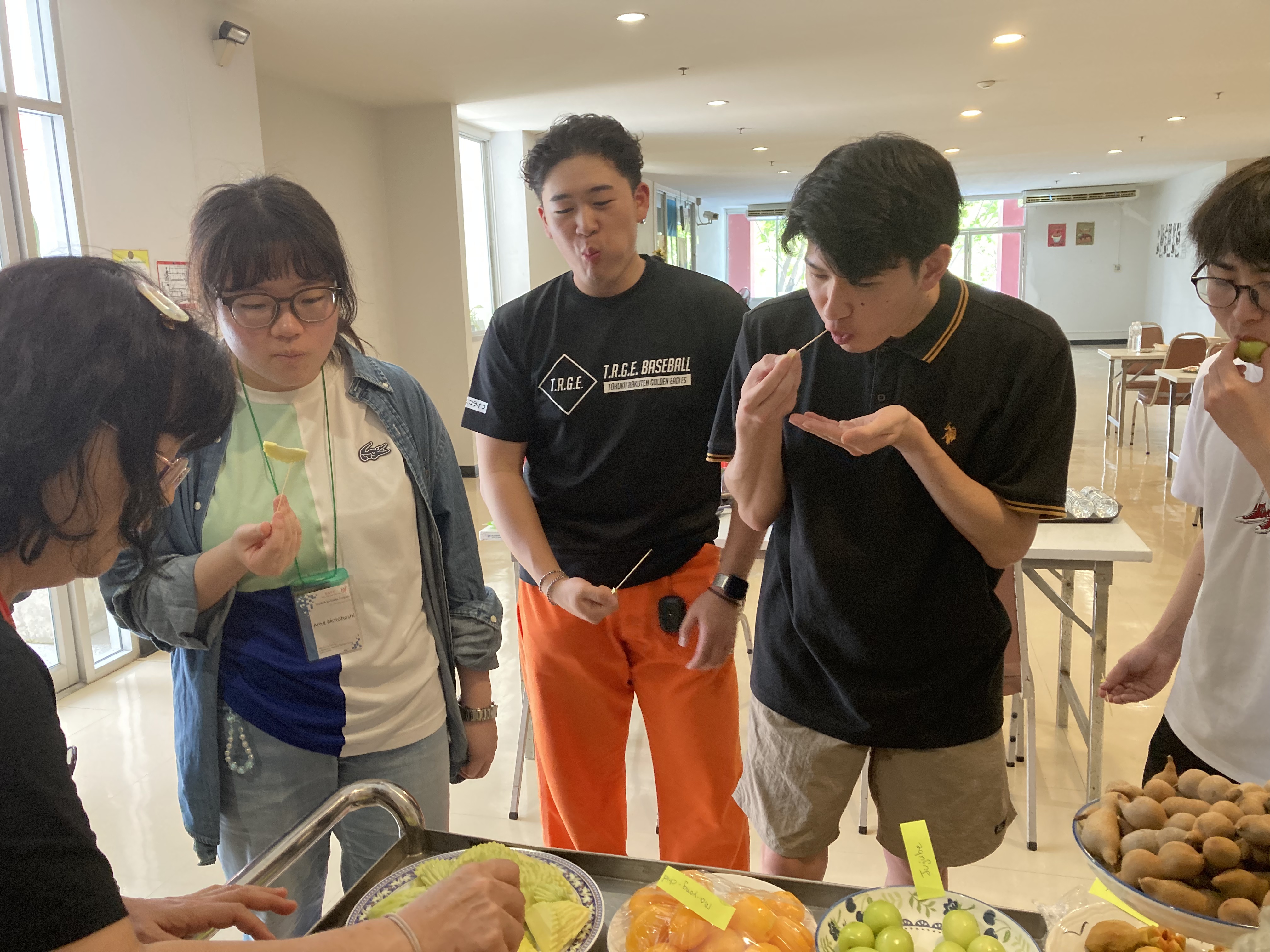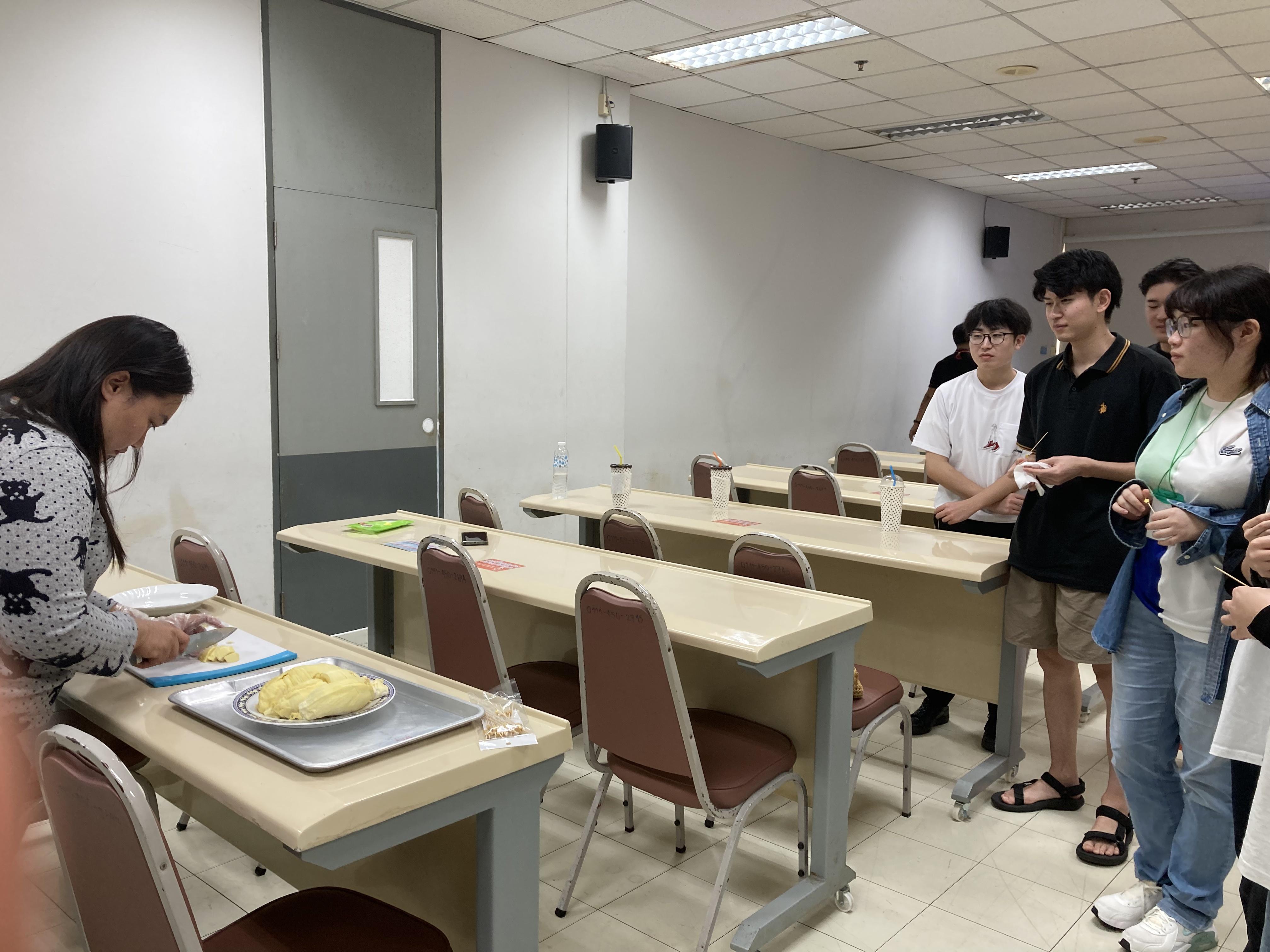 続いて、タイを代表する果物であるドリアンとマンゴーについて学びました。講義では、それぞれの特徴や栽培背景に加え、タイにおける消費文化や経済的価値についても取り上げられました。講義後にはドリアンの試食も行い、実際の味や香りを体験することで、講義内容への理解を深めました。