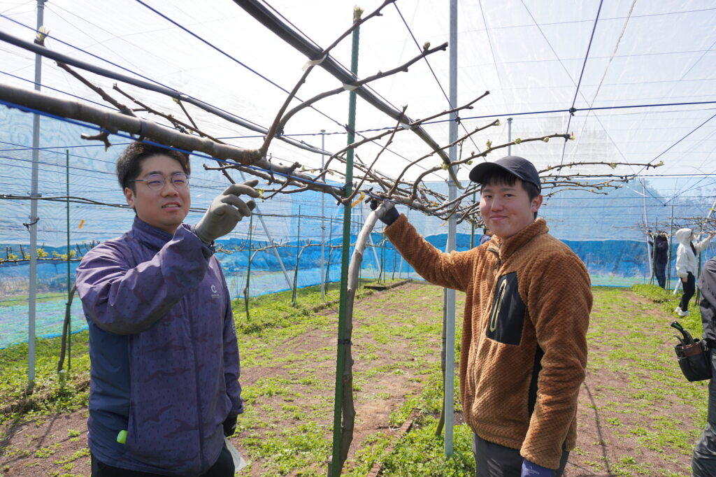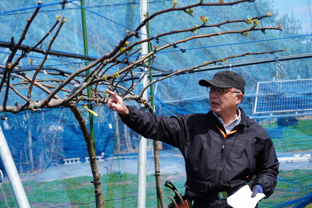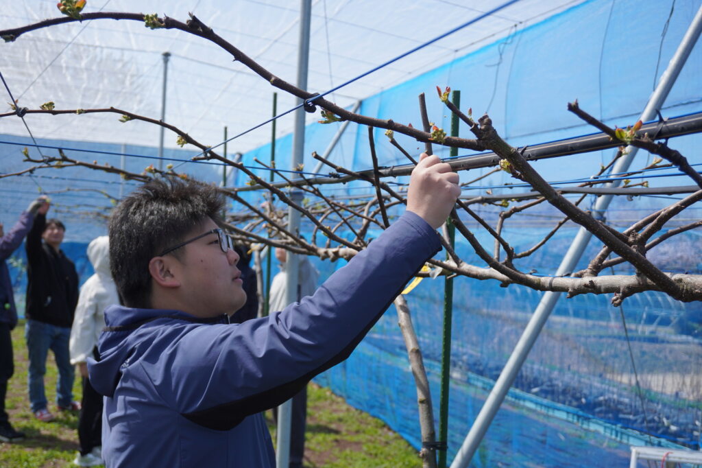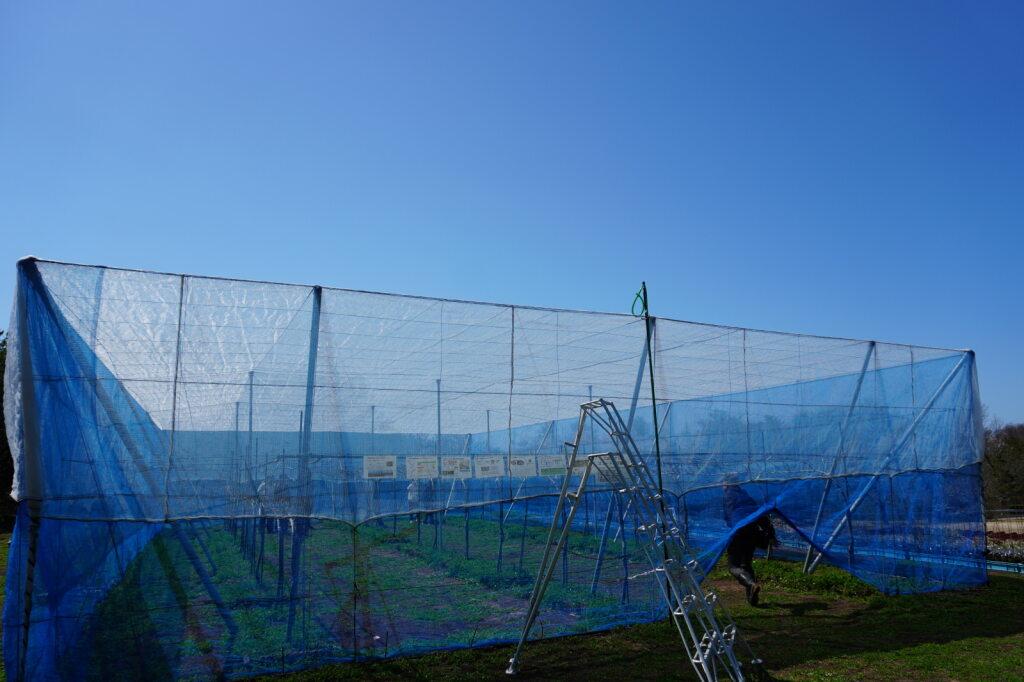 4月8日、松本ゼミで梨の除芽(じょが)と摘蕾(てきらい)が行われました。畑に到着すると、前回の取材とは様子が少し変わっており、白いネットがかけられていました。ネットは雨や風、鳥や虫から実を守るためのもので、生徒と教授が安全に作業を行いながらかけたものです。