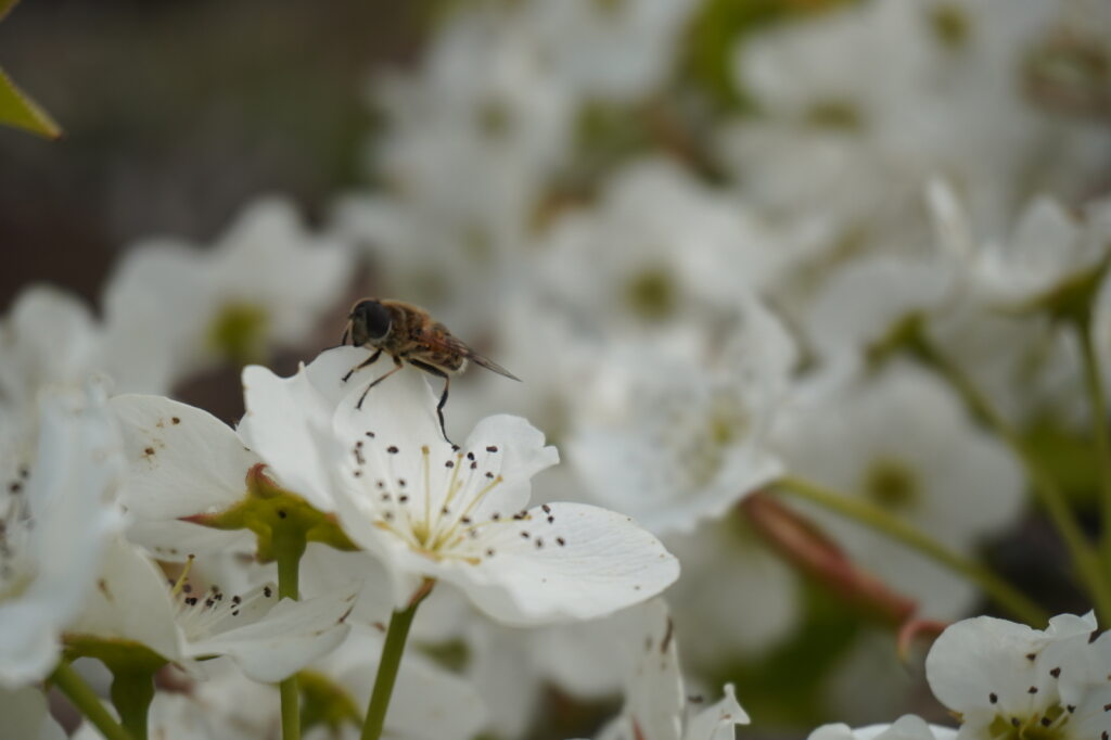 ついに、梨の花が咲きました。白くてやさしい花が一面に広がっていて、とてもきれいでした。