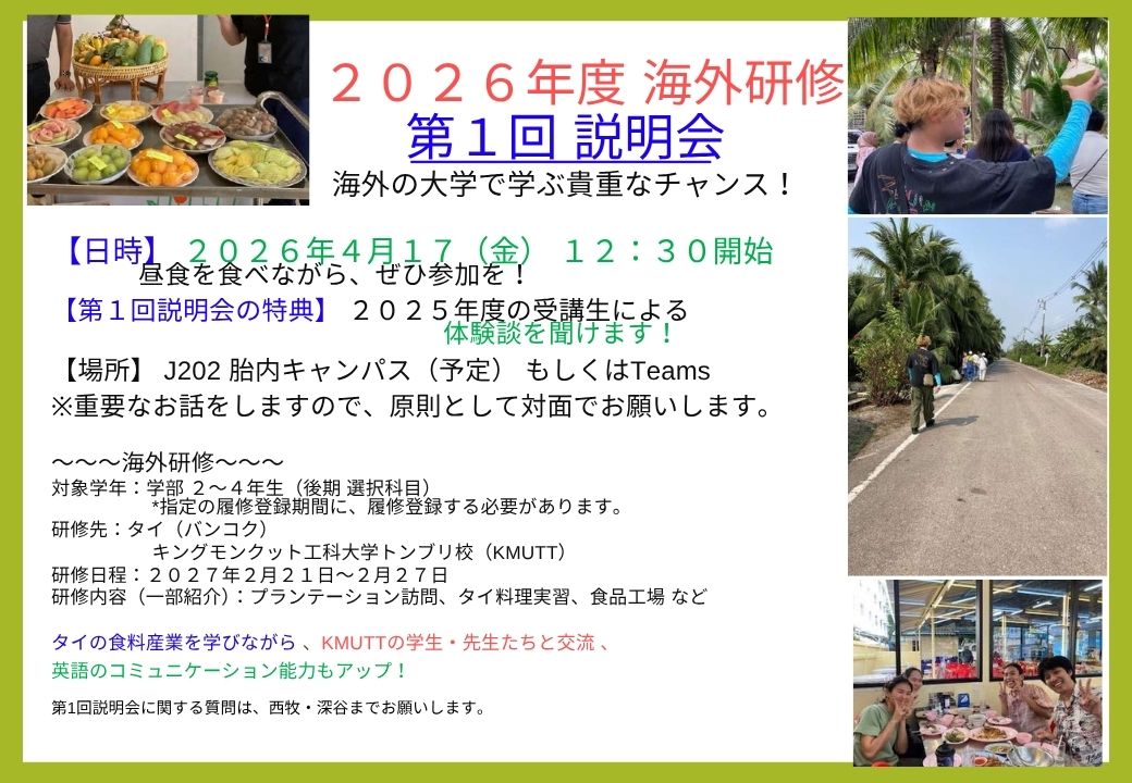 「海外に行ってみたい」「食や農業を世界の視点で見てみたい」。そんな気持ちを持っている在学生。そして、ブログを読んでいる高校生のみなさん!新潟食料農業大学に進学したら、こんなチャンスが待っています。