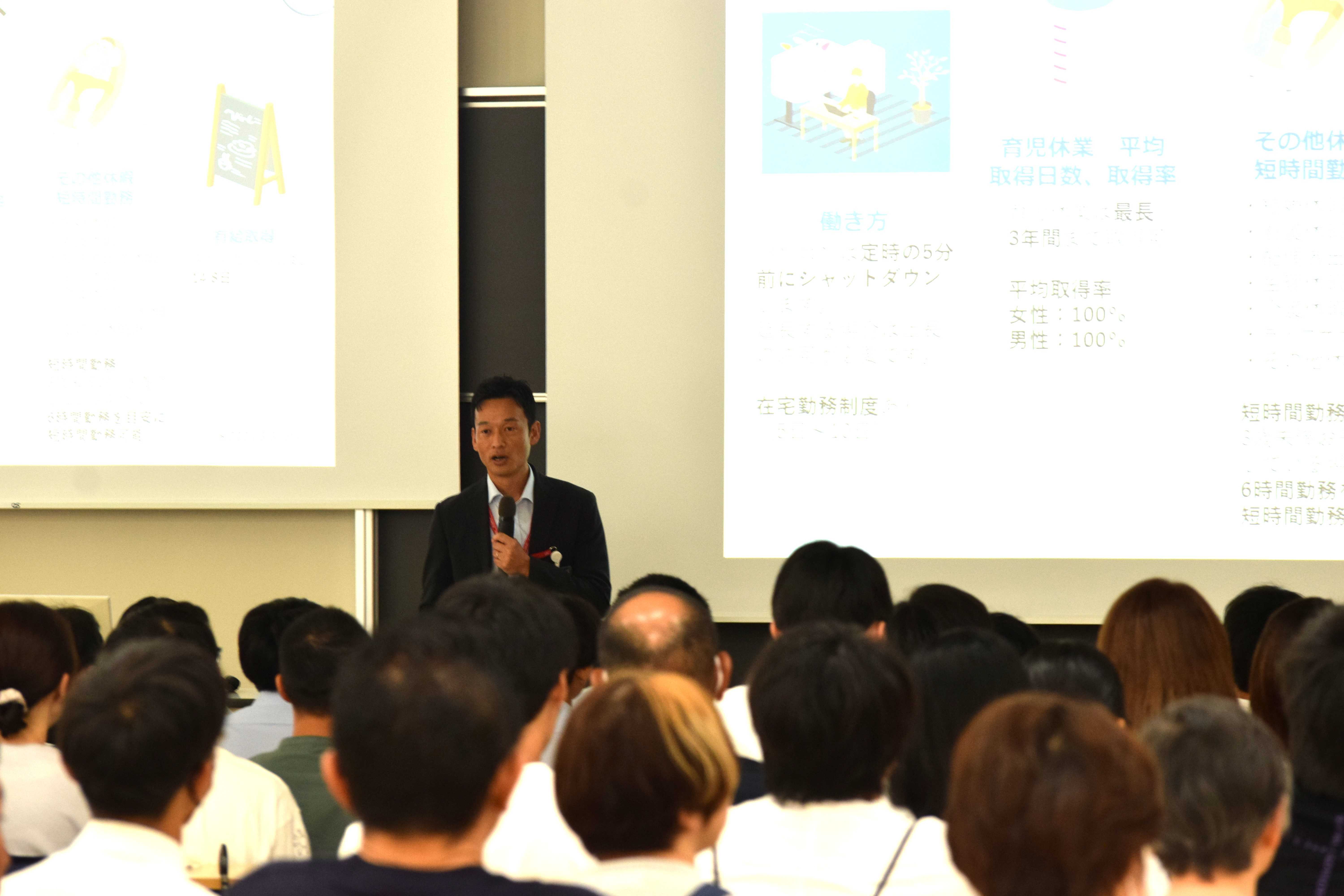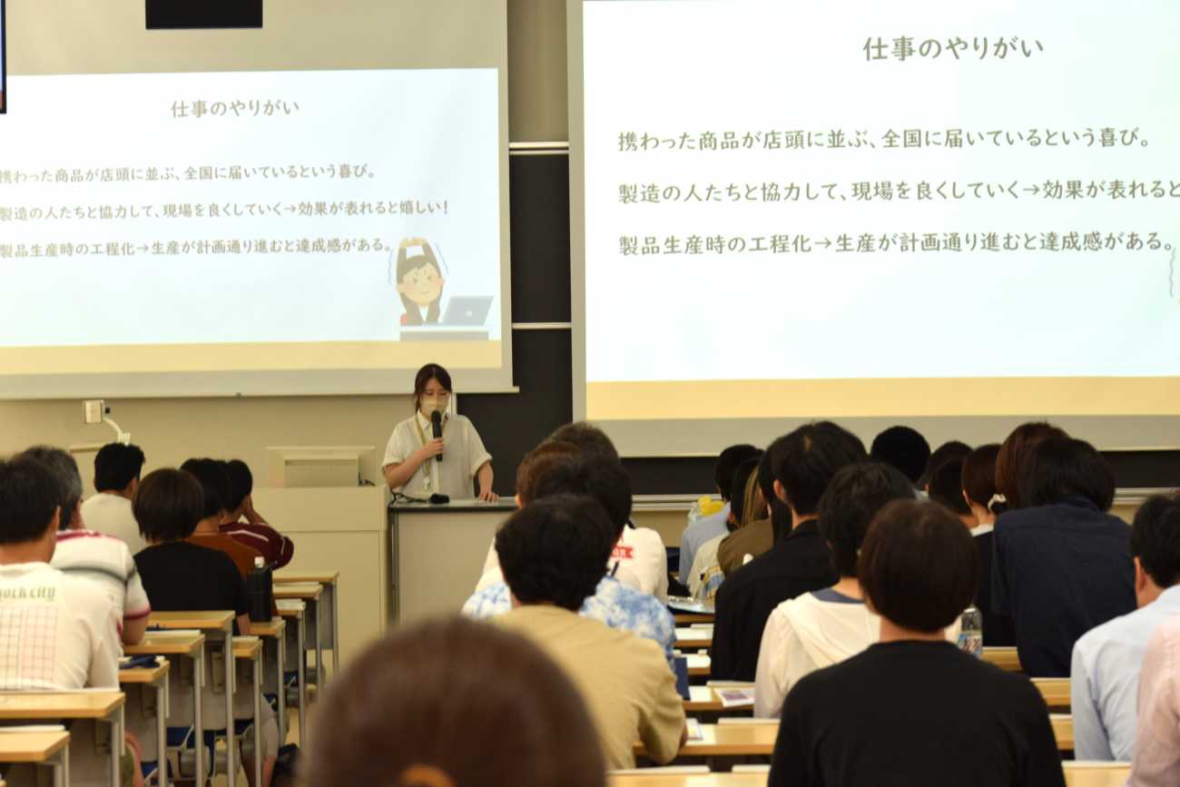 続いて本学卒業生の田辺さんより現在の仕事についてお話いただきました。現在、たくさんの消費者に商品を味わってもらうために品質管理の部門で活躍しています。品質の管理はもちろん、作業効率や生産量を高める利益改善の提案など多岐にわたる業務に携わっています。