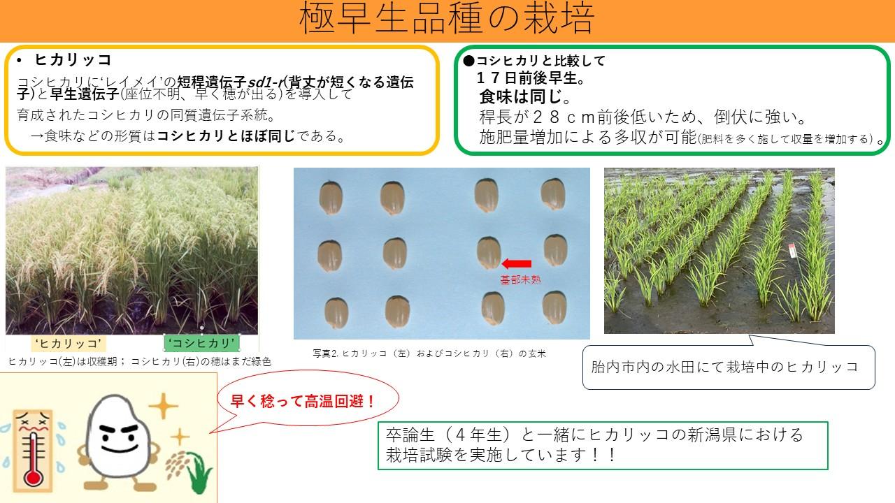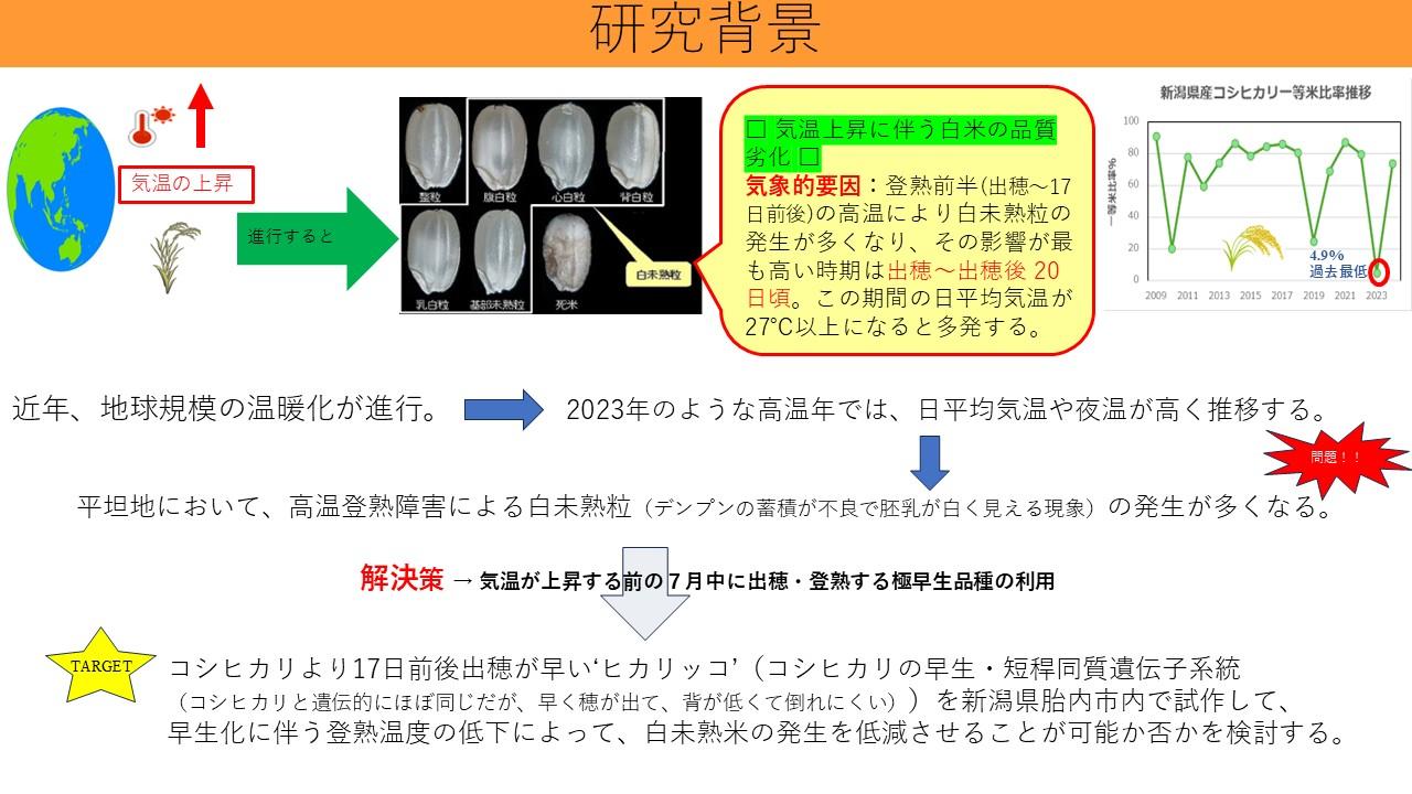 本研究では、コシヒカリの早生・短稈同質遺伝子系統「ヒカリッコ」を用いて胎内市内の水田で栽培し、2週間前後出穂が早進化する事により登熟前半を7月前半に移行させることによって高温登熟障害を回避できるか否かを検討します。