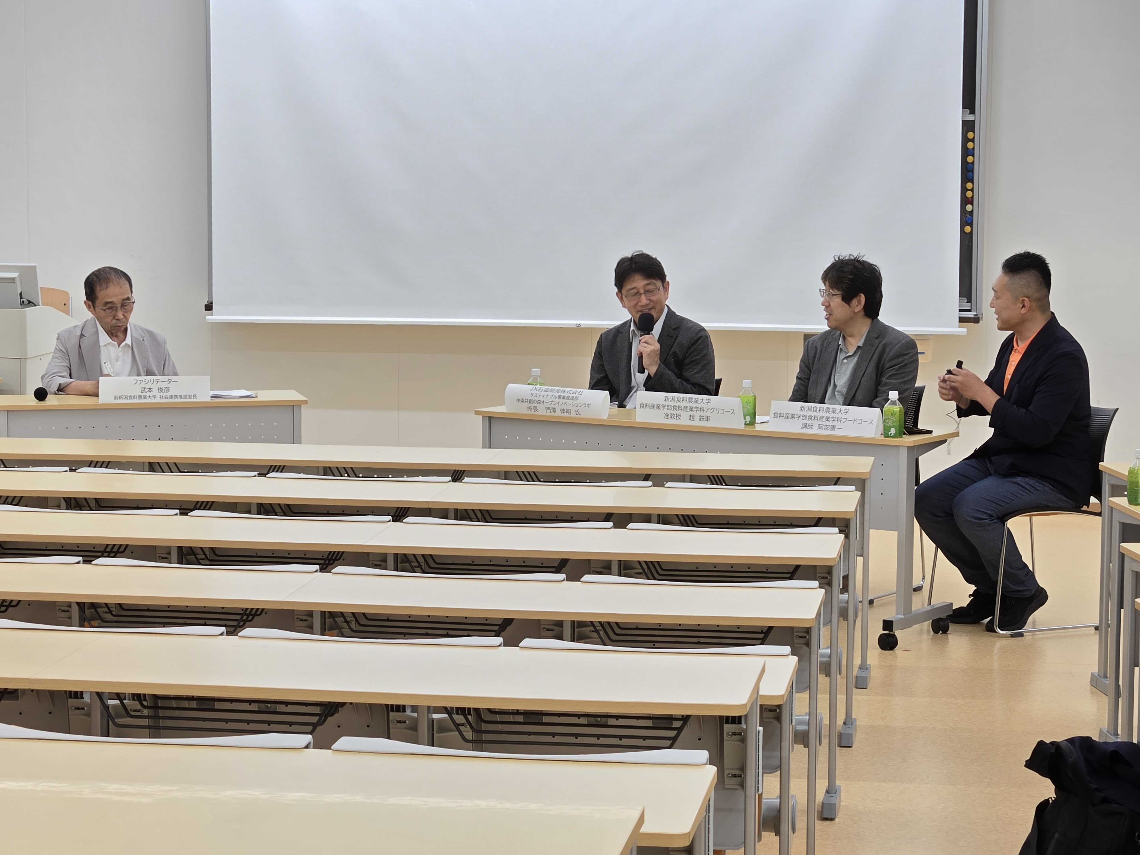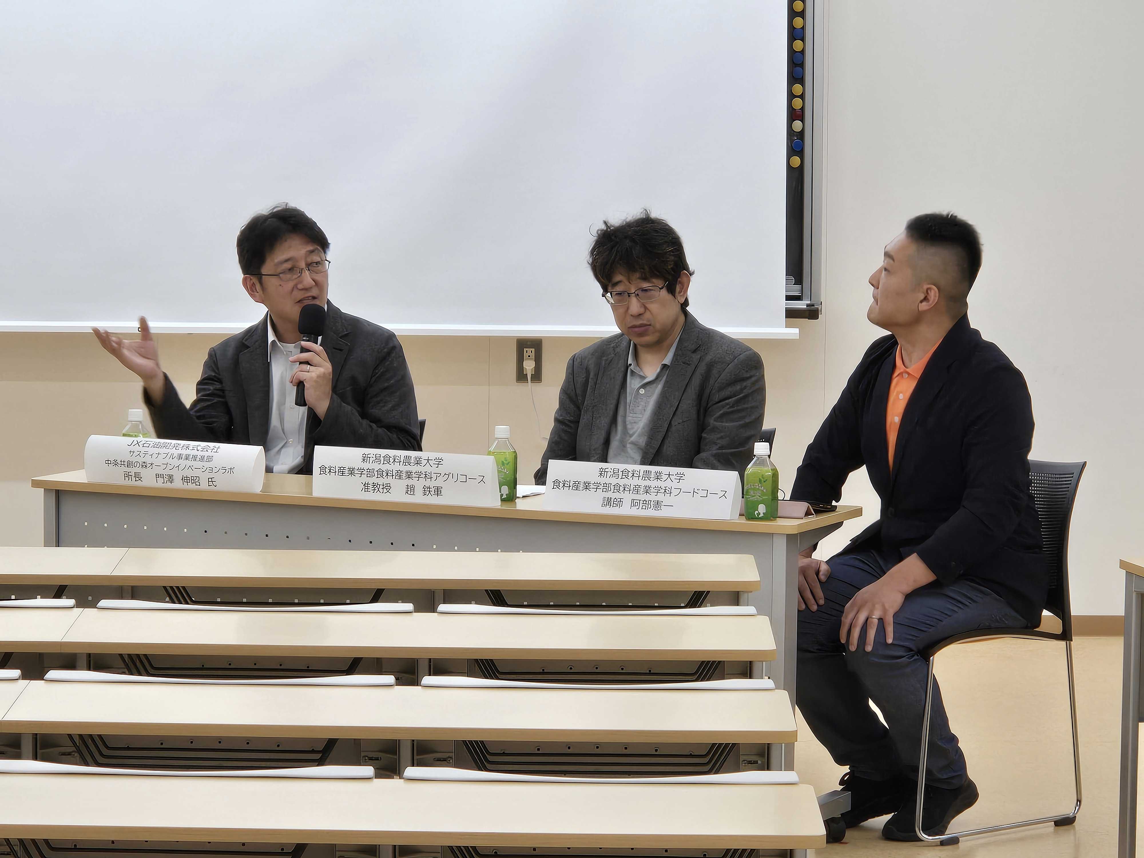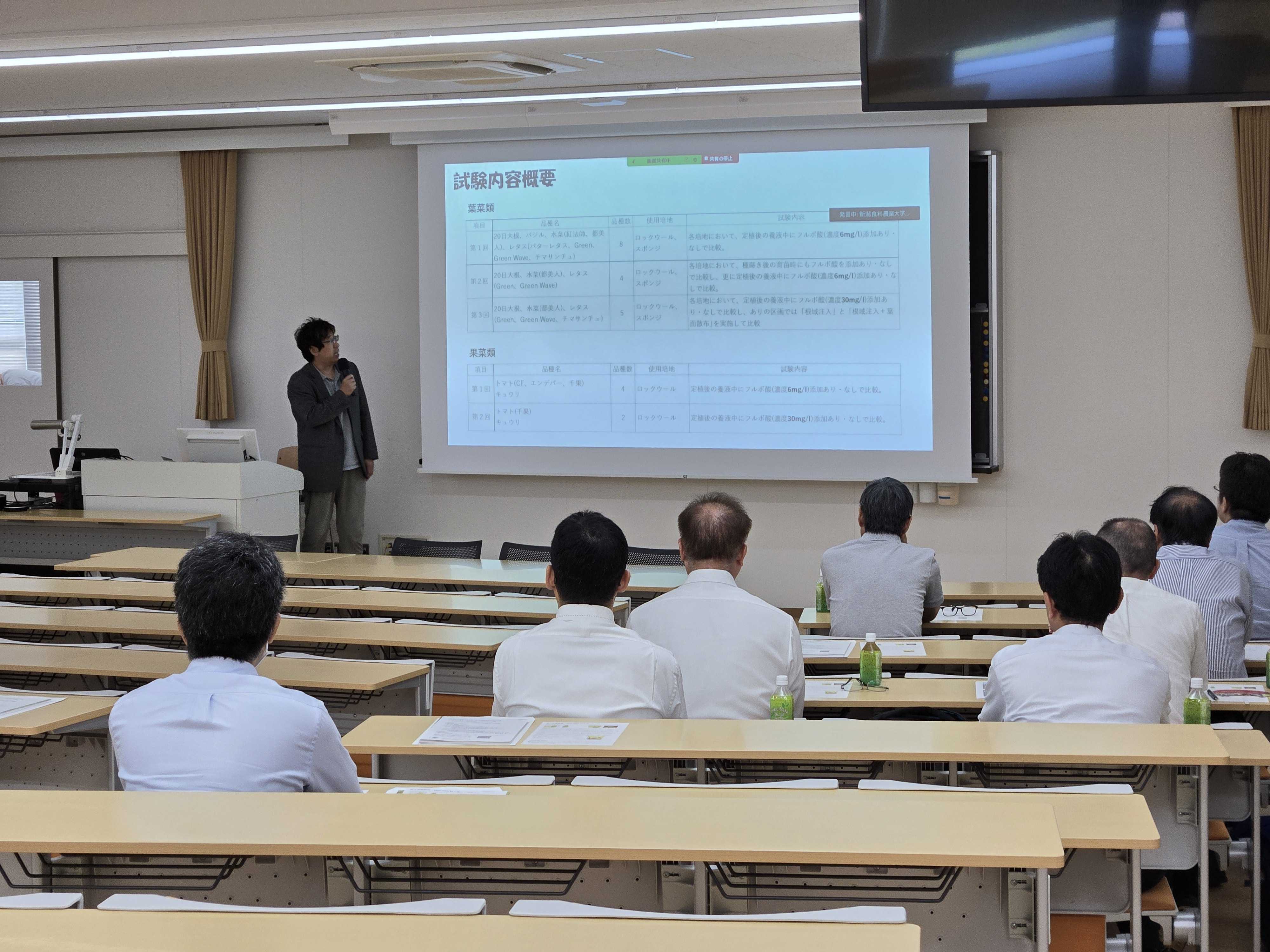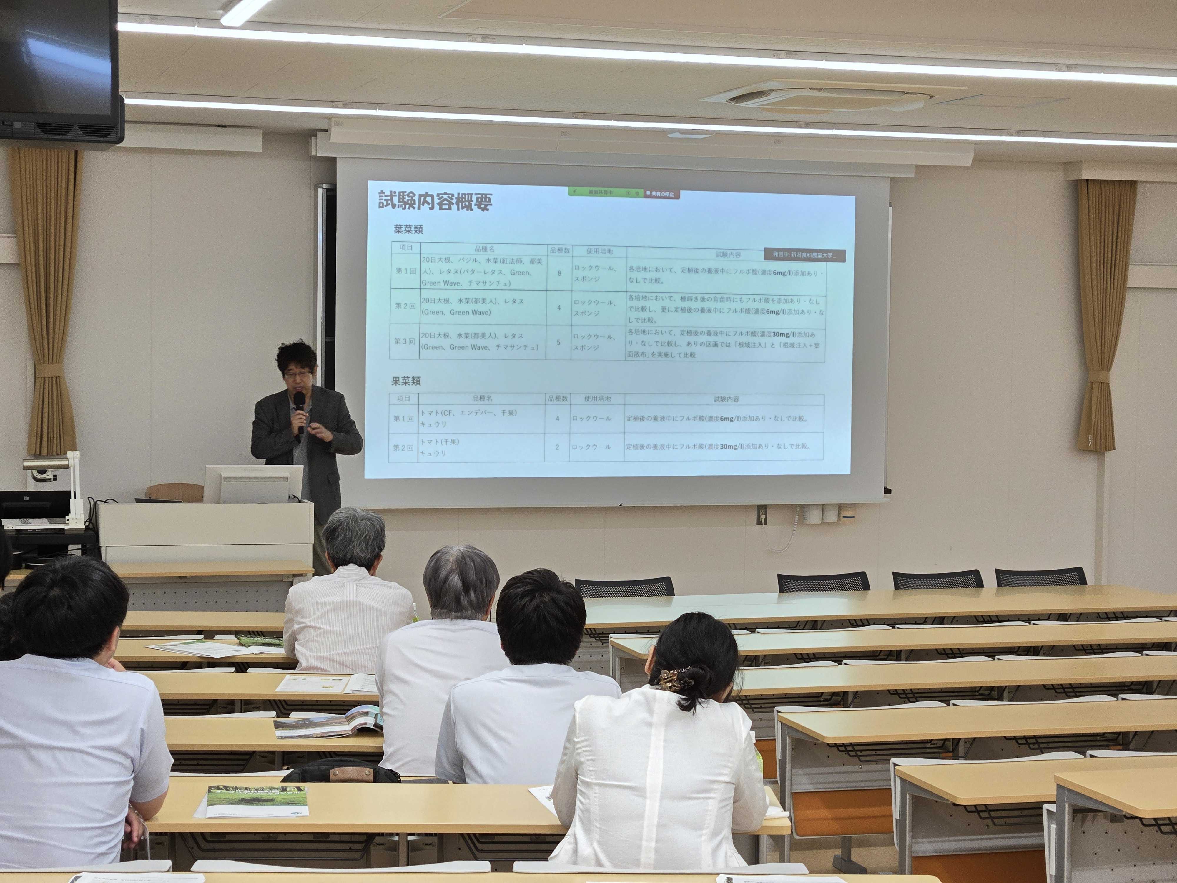 また、新潟県内の環境対応に向けた動きと今後の展望についてもお話いただき、最後は、本学に委託いただきました研究「かん水中に含まれるフルボ酸の植物生育に対する効能に関する研究」について触れ、将来的に『営農型太陽光』、『 未利用熱、 CO2 農業活用 』 、 『 バイオマス残渣利用 』 等、カーボンニュートラルと農業を結び合わせた取組みについて本学と協力のもと実証等の検討を進めたい、と締め括られました。