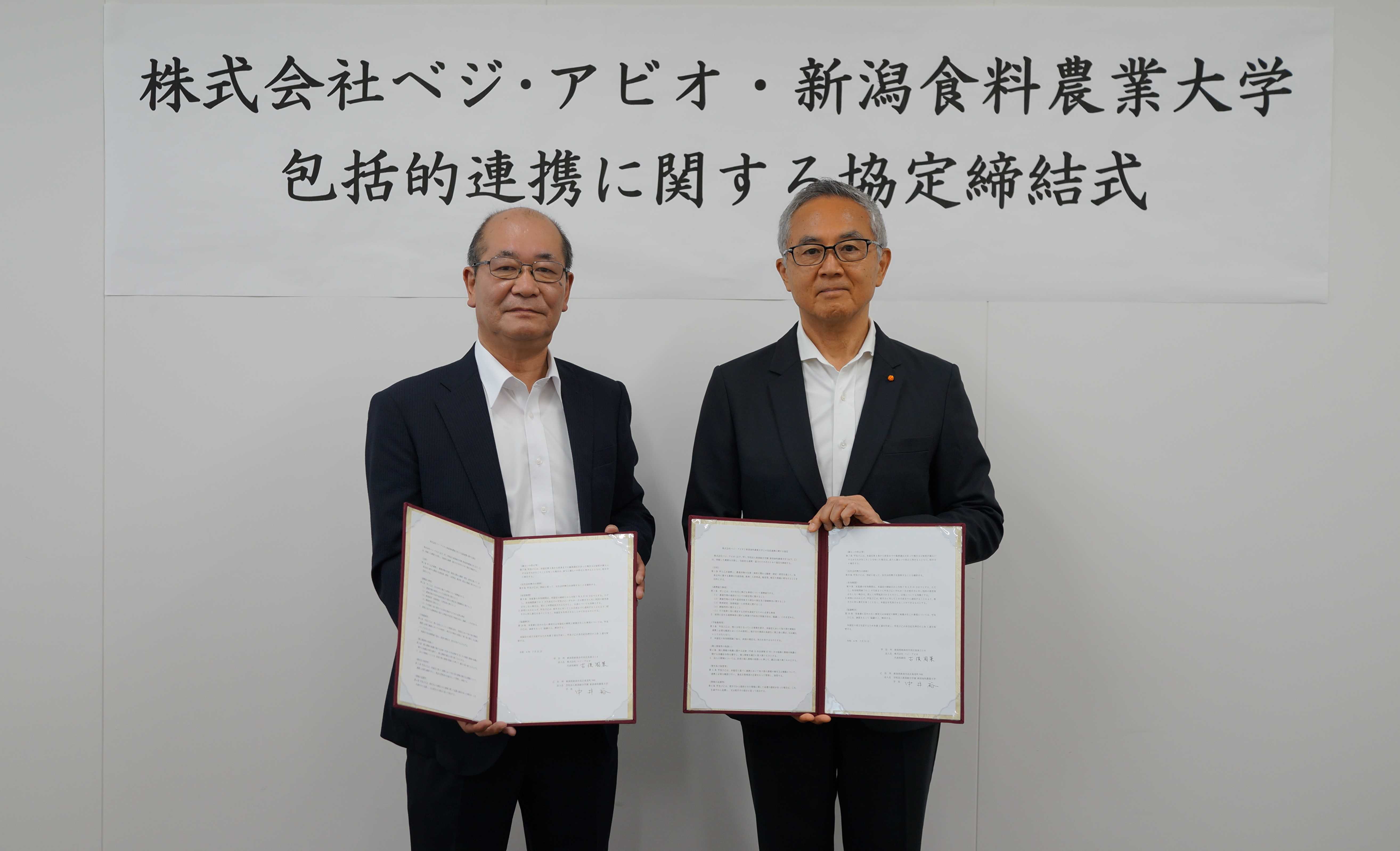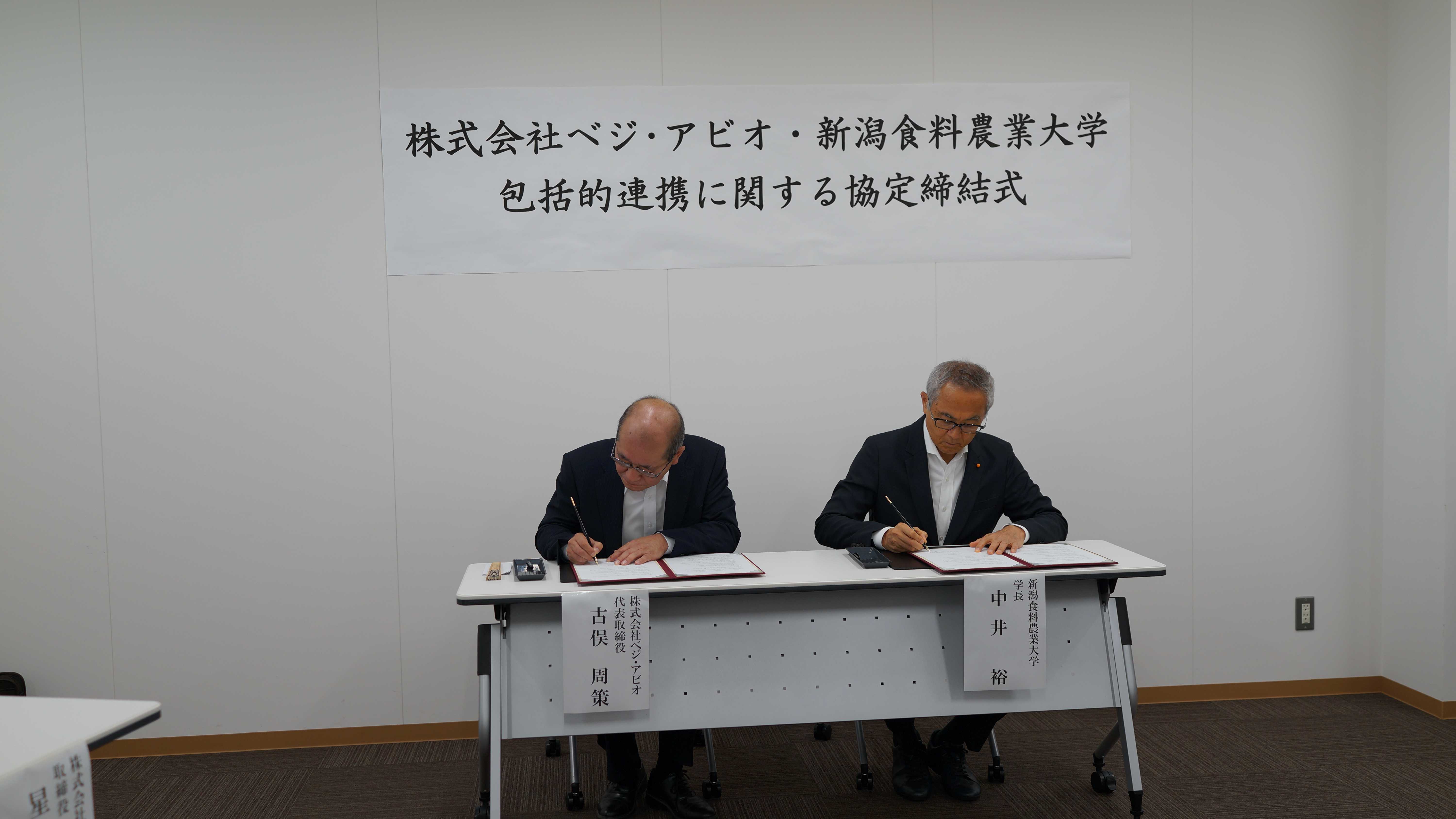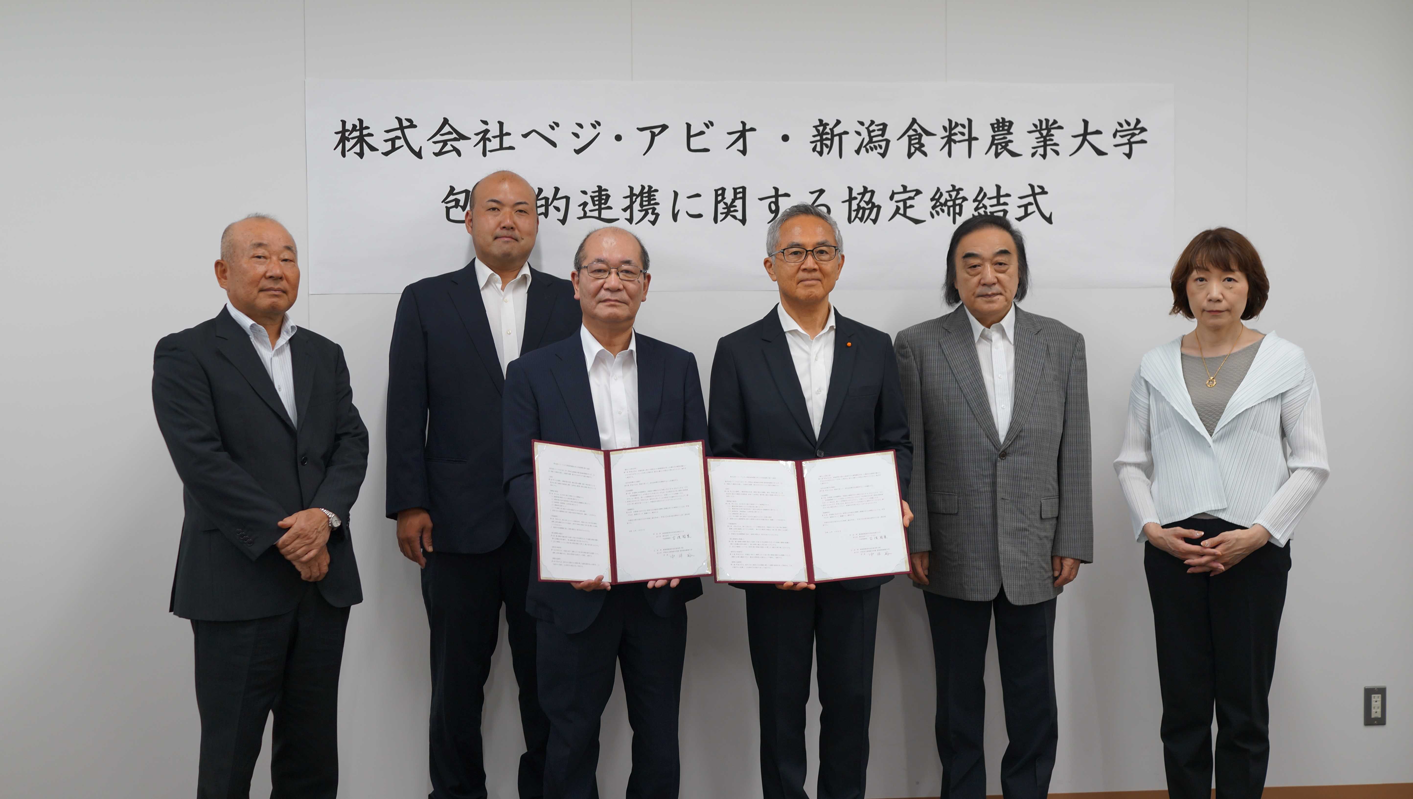 本学は株式会社ベジ・アビオと「農産物の生育・研究を通じて、農業の生産技術、教育・人材育成、販売等、相互に連携・協力して発展していくこと」に合意し、7月31日(水)本学の新潟キャンパスにて締結式を執り行いました。