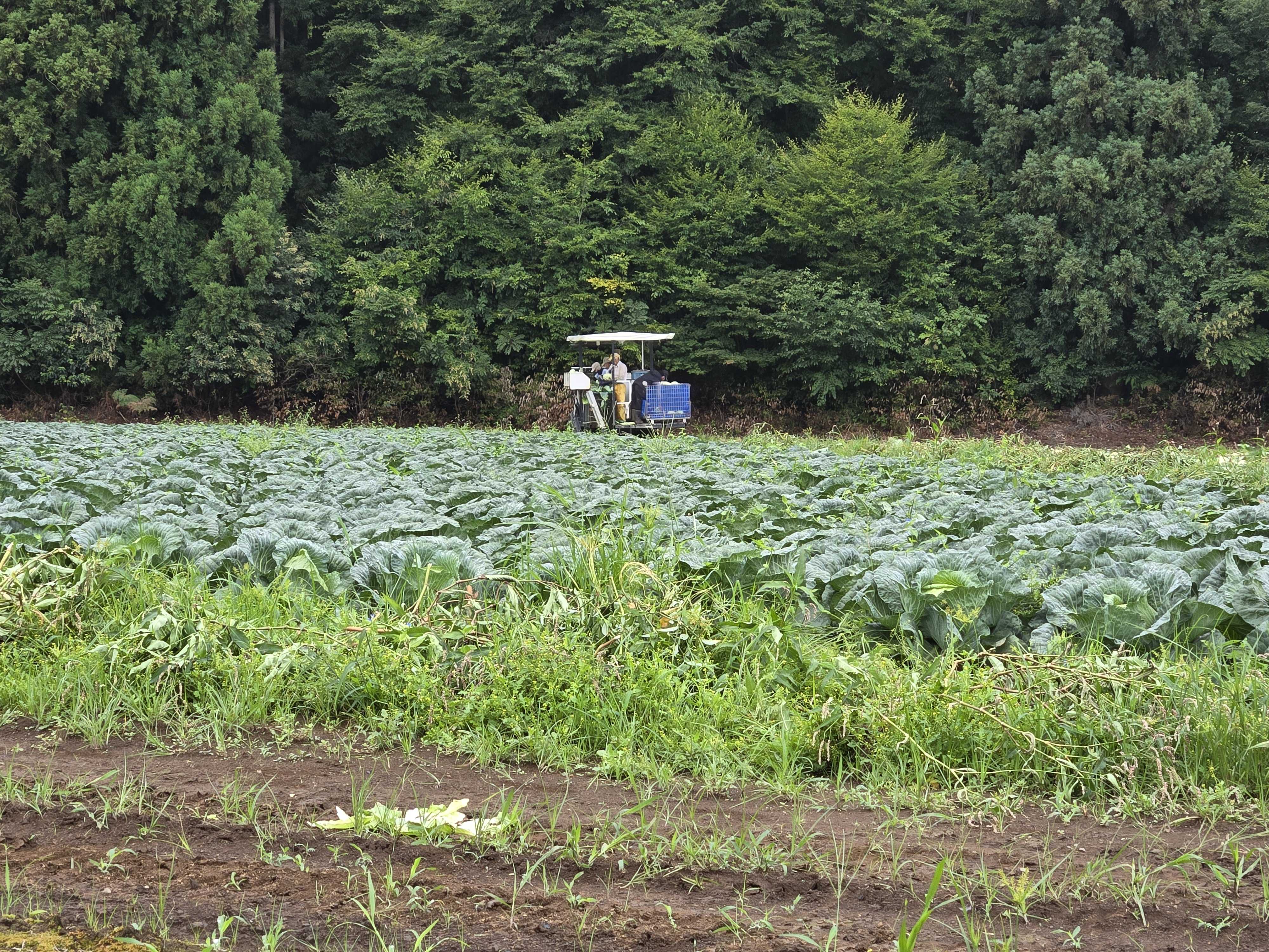 次々に機械に吸い込まれていき、収穫機の上では4人の方が乗って、キャベツの葉などを整えながら、ケースに納めていて、包丁で1つずつ収穫するのに比べ、かなり効率よくスピーディーに作業されていました。