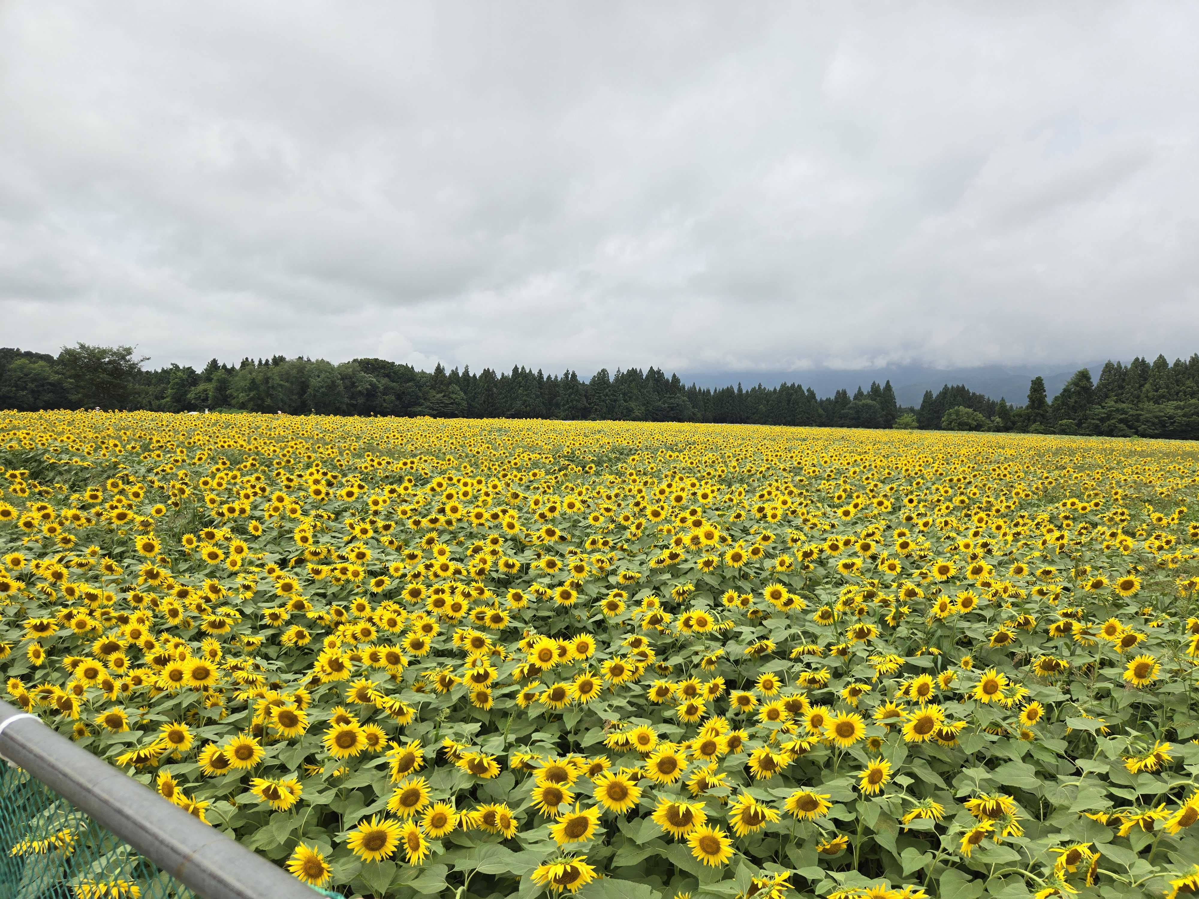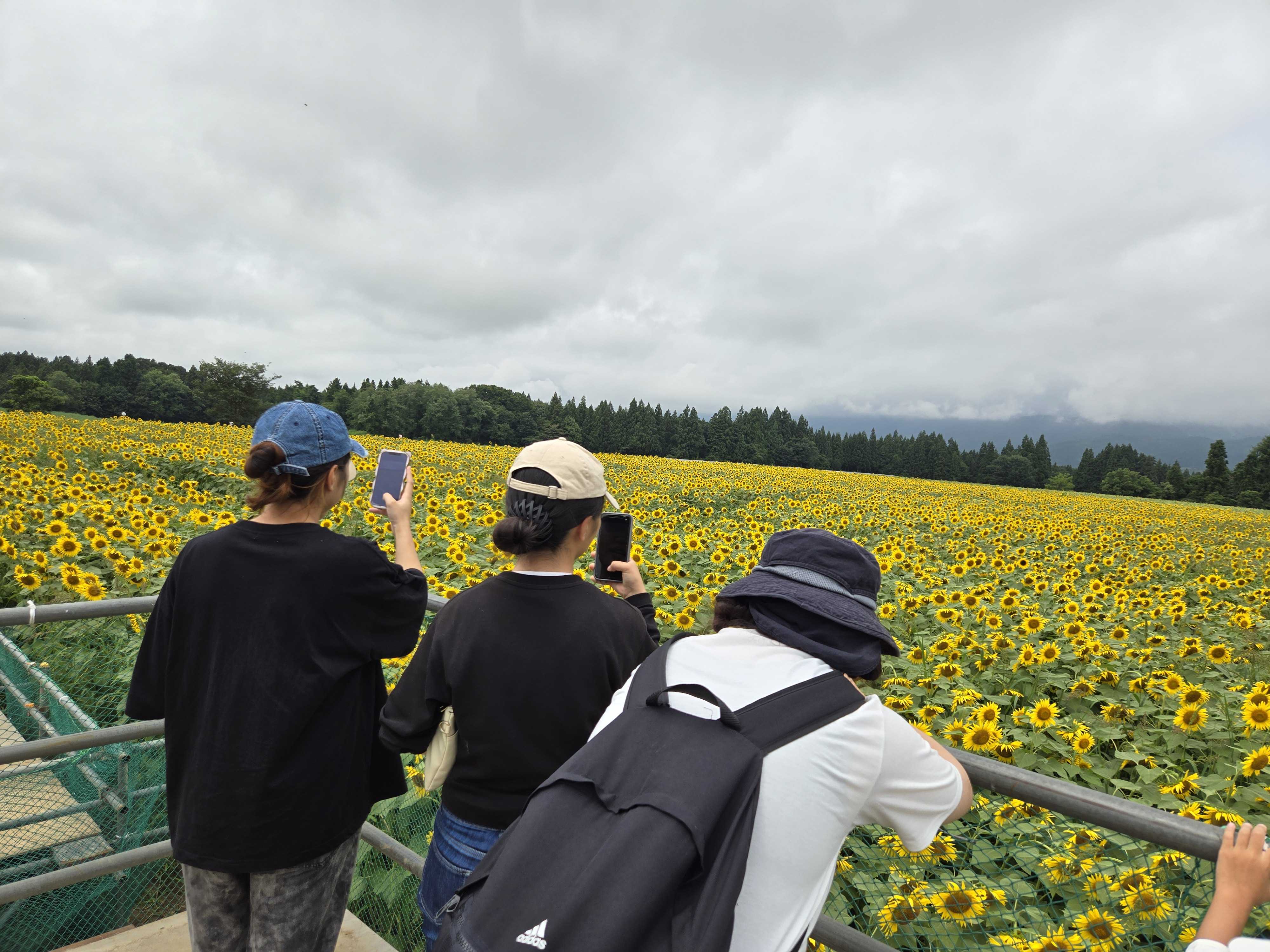 第1畑~第3畑まで、見ごろをずらして、全体で50万本が咲き誇る夏の風物詩だそうです。学生たちは、展望台に上がって一面に広がるひまわりに感動していました。