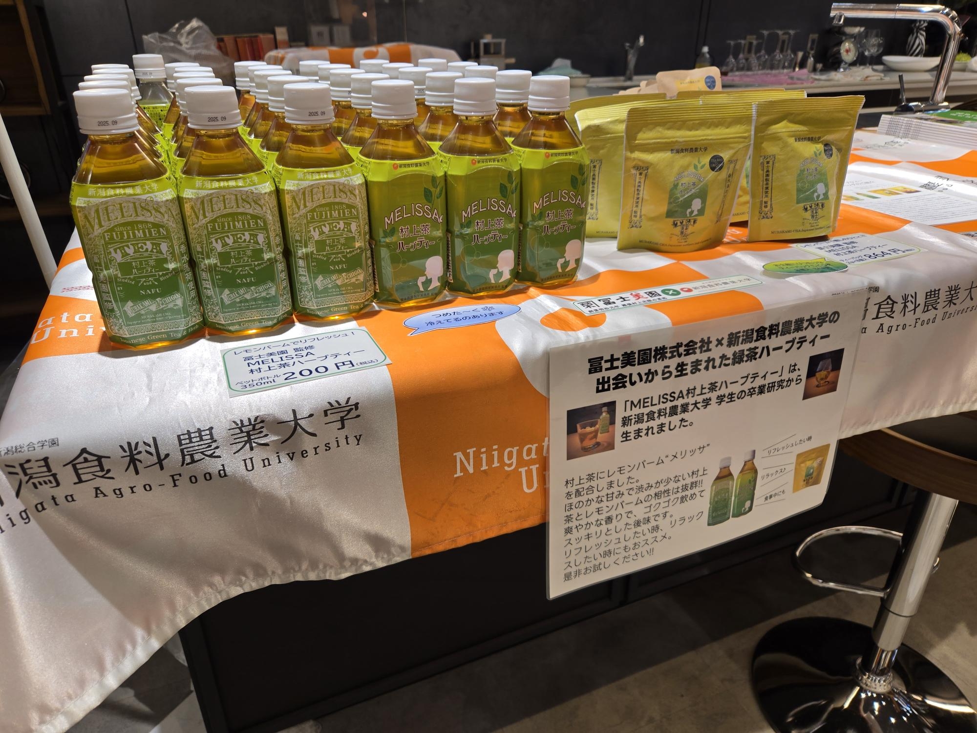 MELISSA村上茶ハーブティーは、本学学生が卒業研究でハーブの配合割合等を研究し、冨士美園様と共同で開発した商品です。