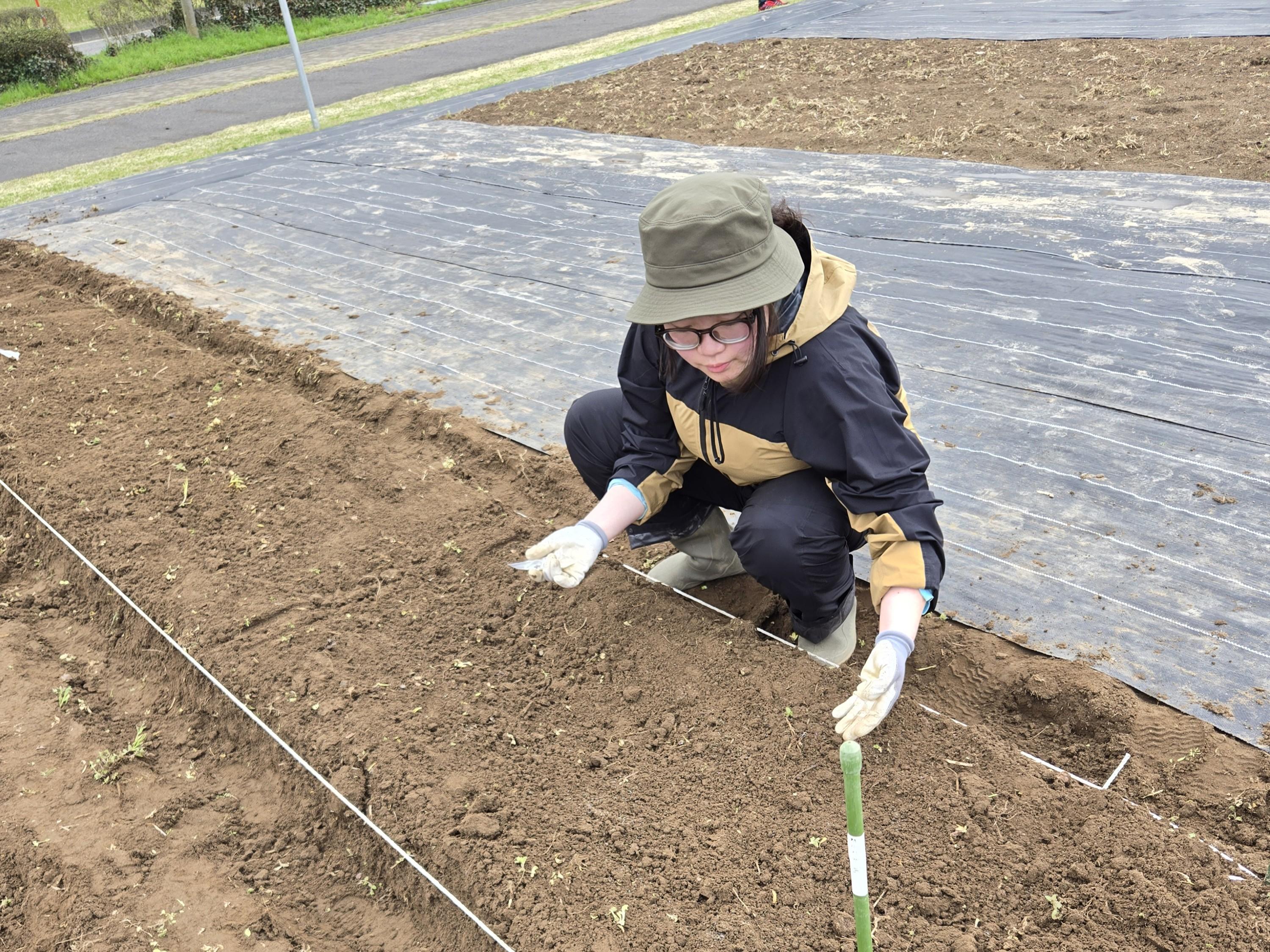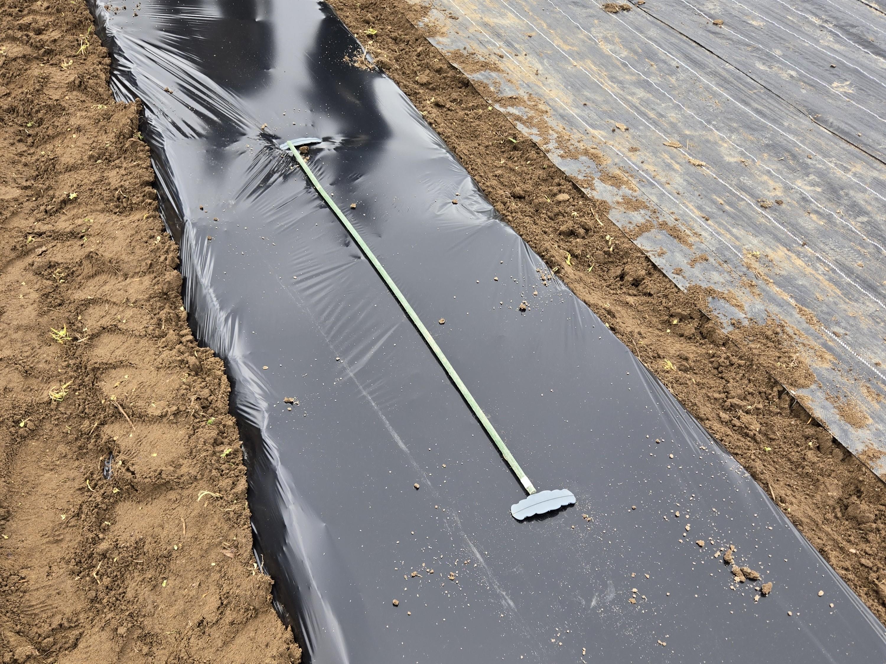 それぞれ、野菜ごとに決められた量とまき方で農薬をまいたら、最後に黒い「マルチ」と言われる防草シートを張って、作業完了!