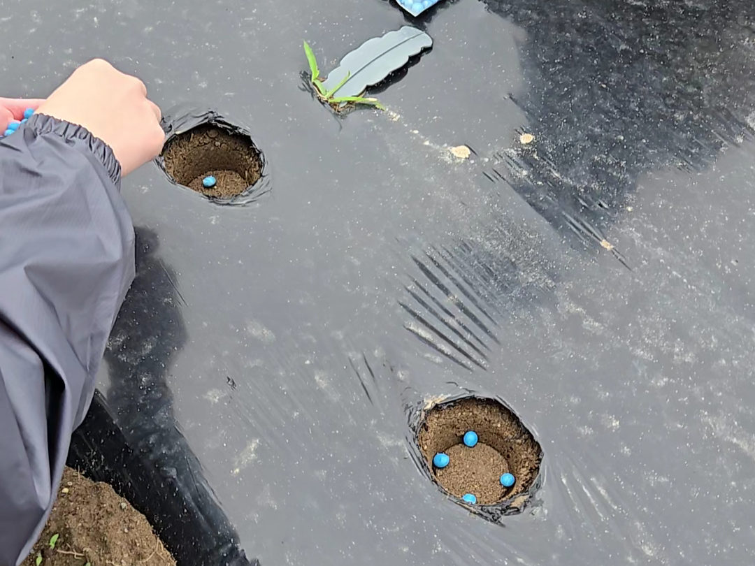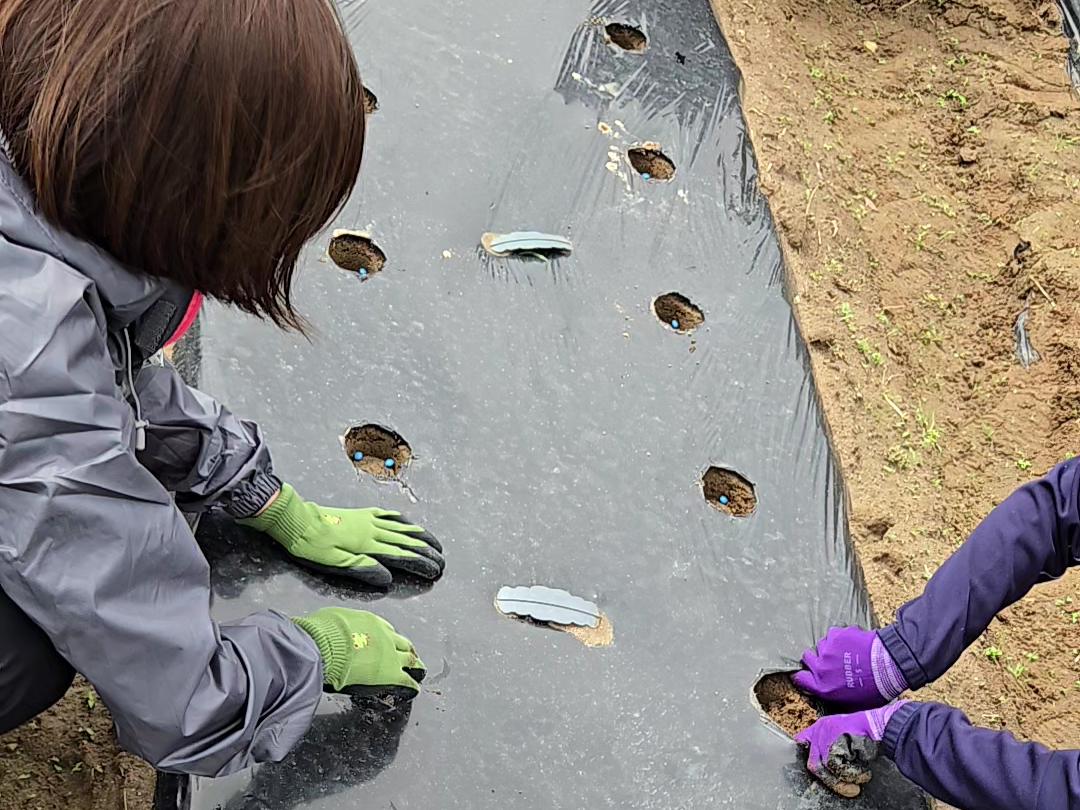 4月中旬に、畝立て・マルチ張りを行い、肥料を土になじませました。