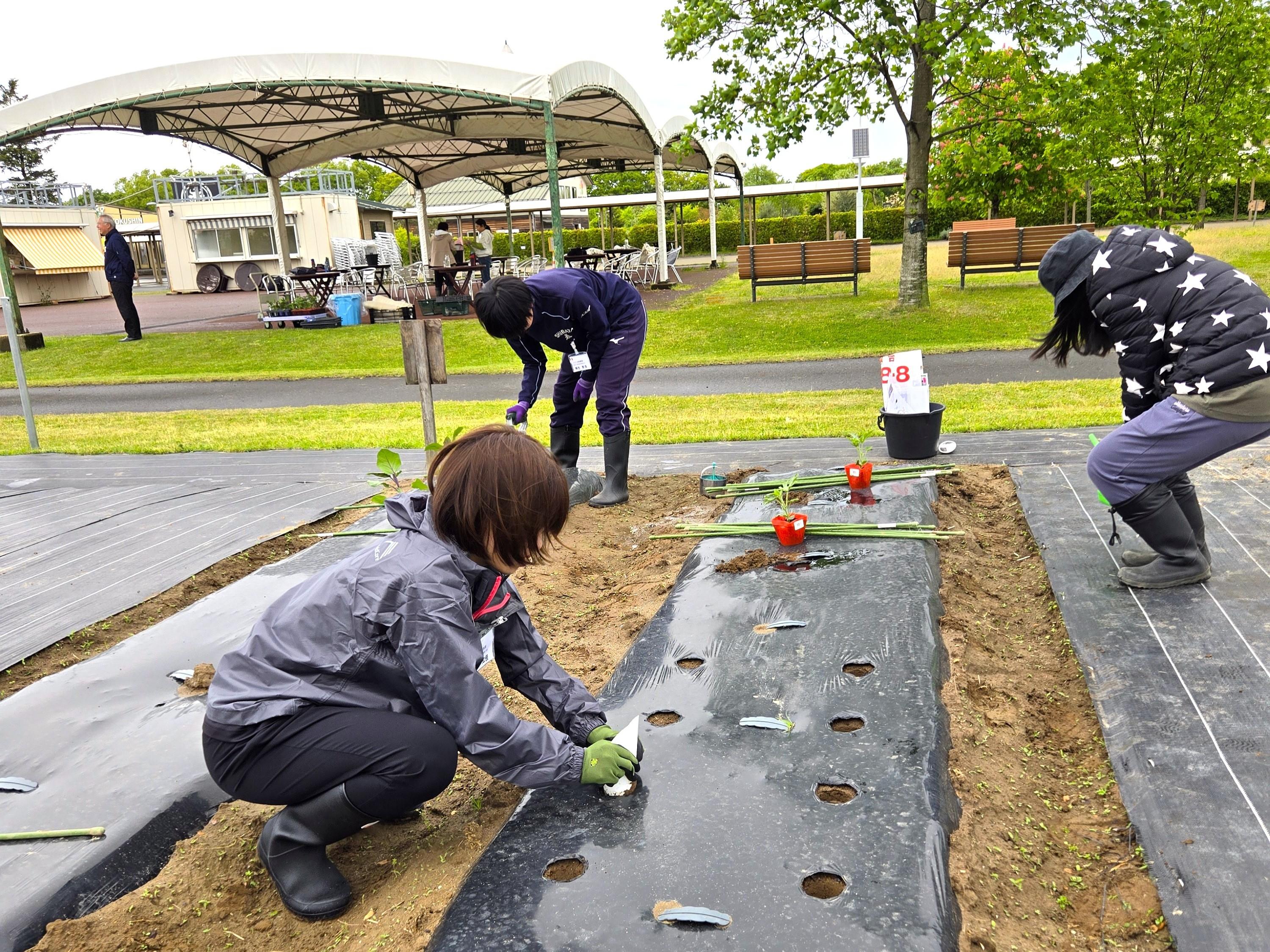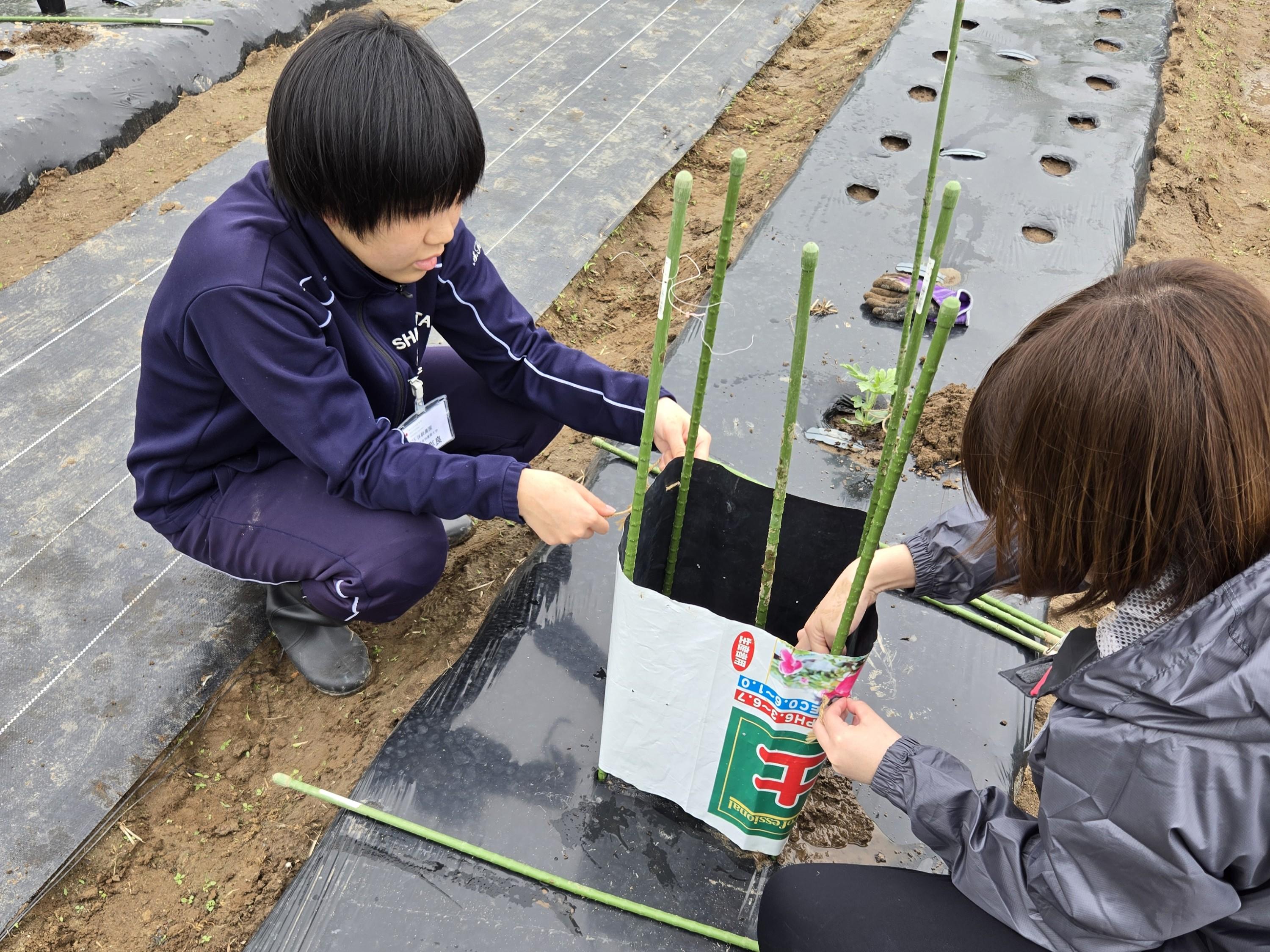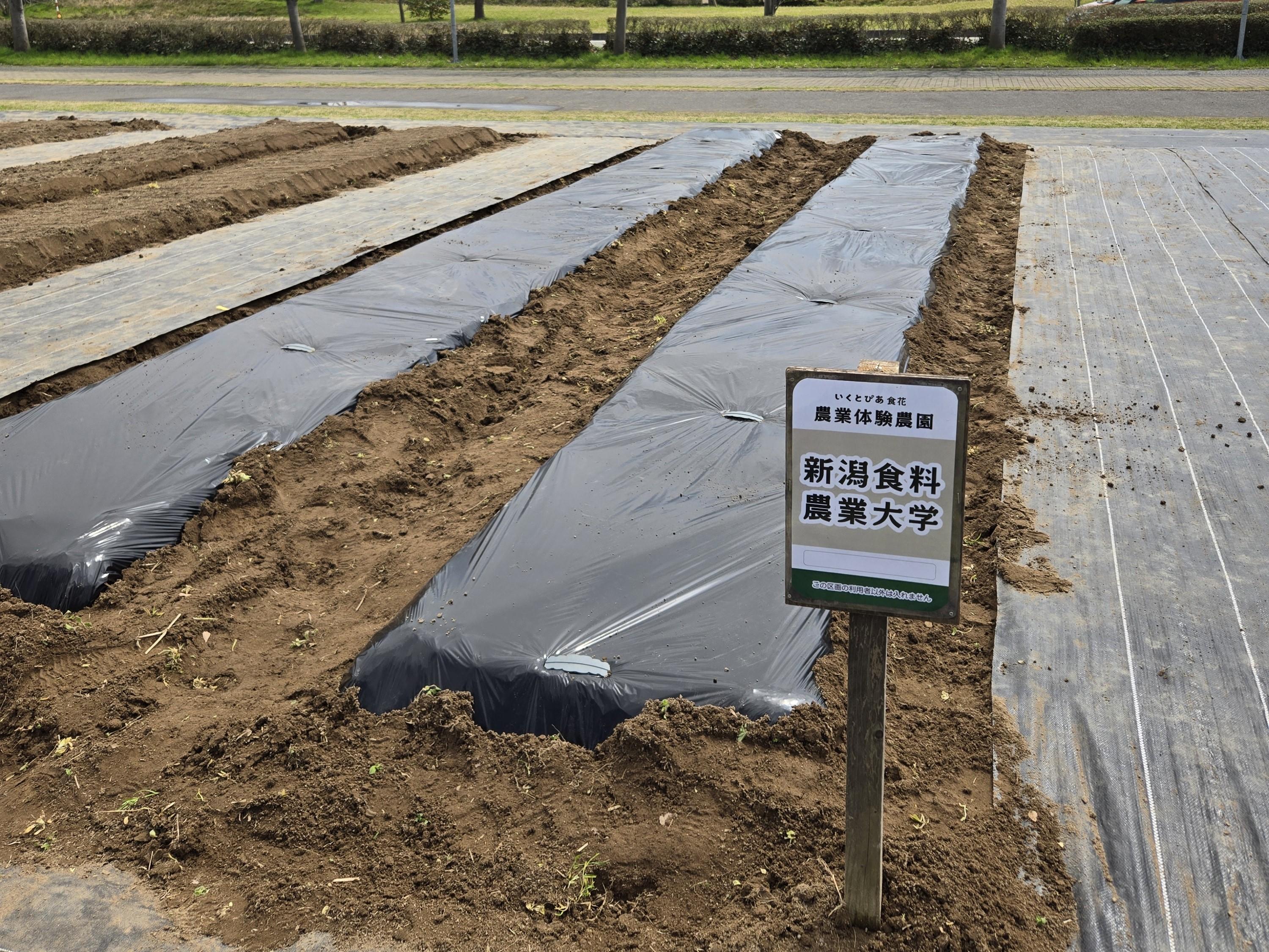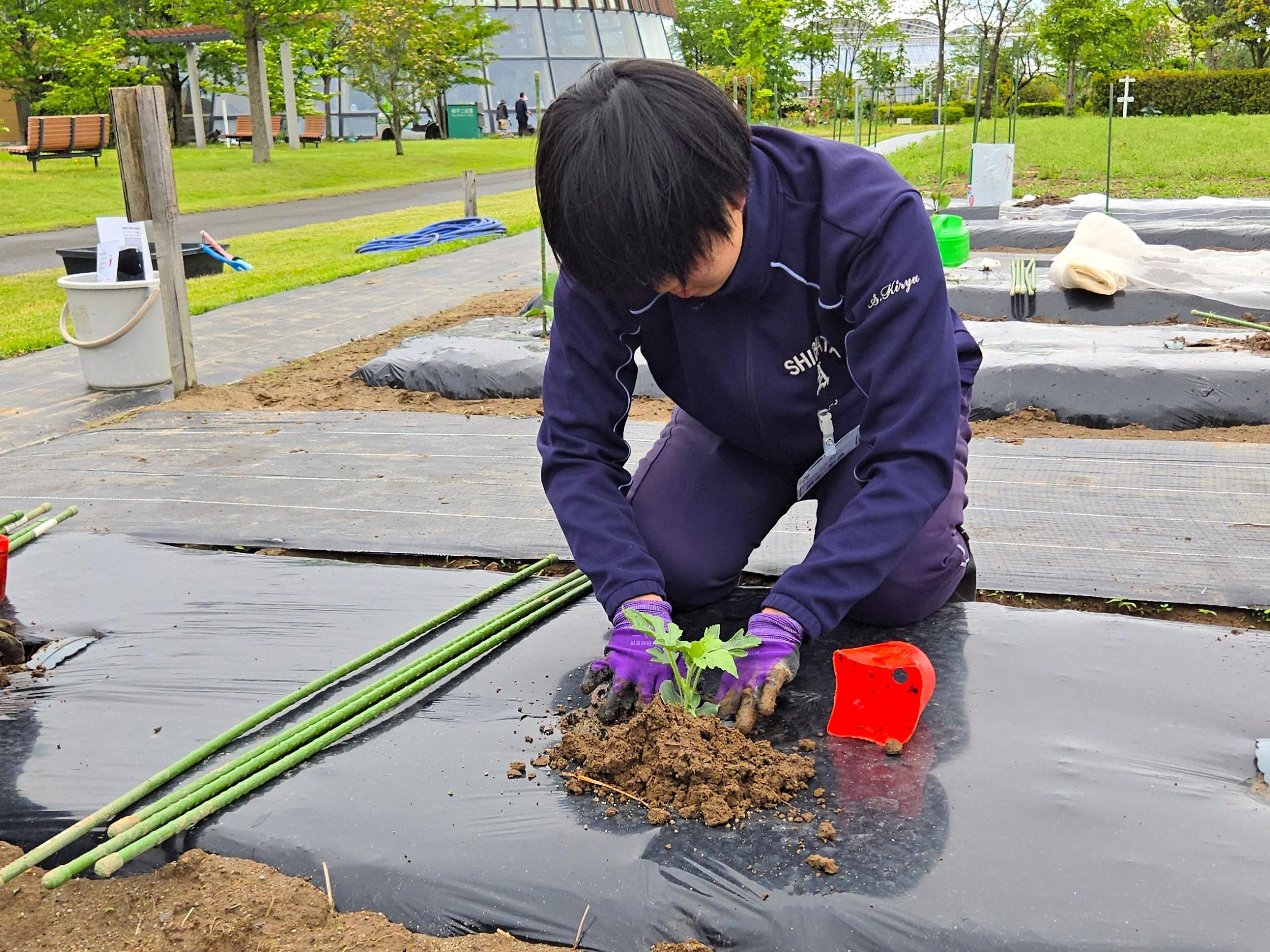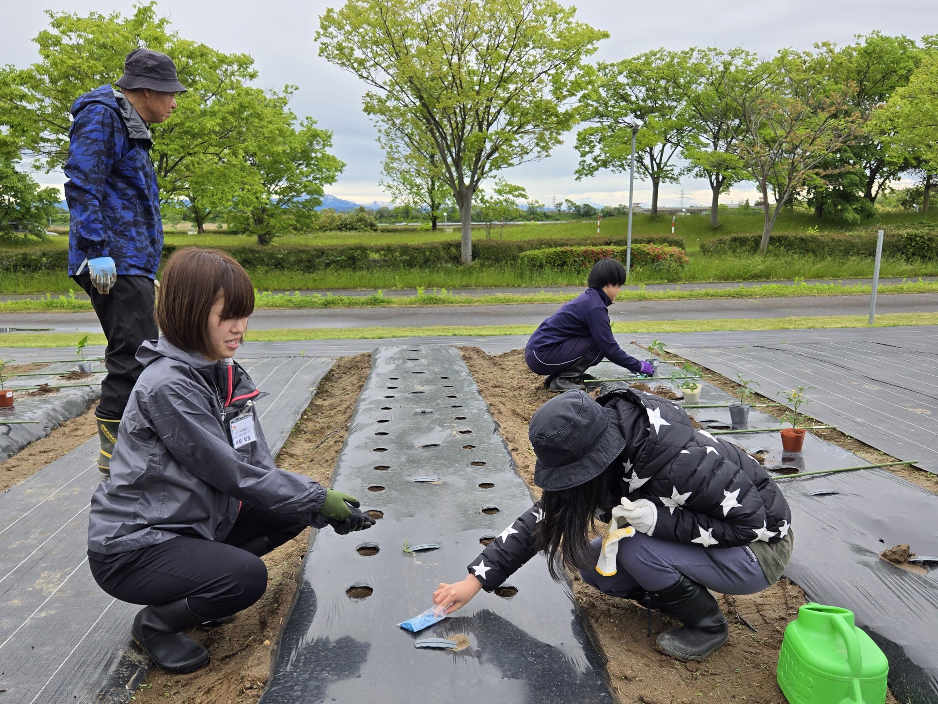 新潟市中央区にある【いくとぴあ食花 体験農園】にて、新潟食料農業大学専用区画を設けていただき、学生たちが夏野菜の栽培に取り組んでいます。