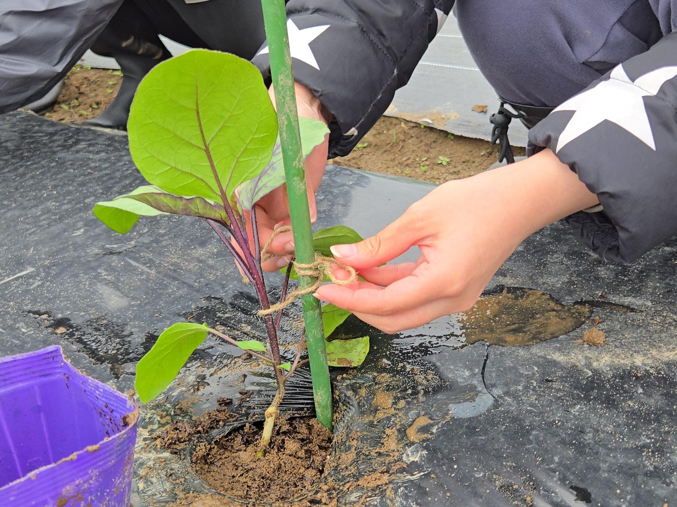 風で苗が倒れないように、仮支柱を立て、麻ひもで苗と支柱を軽く縛ります。