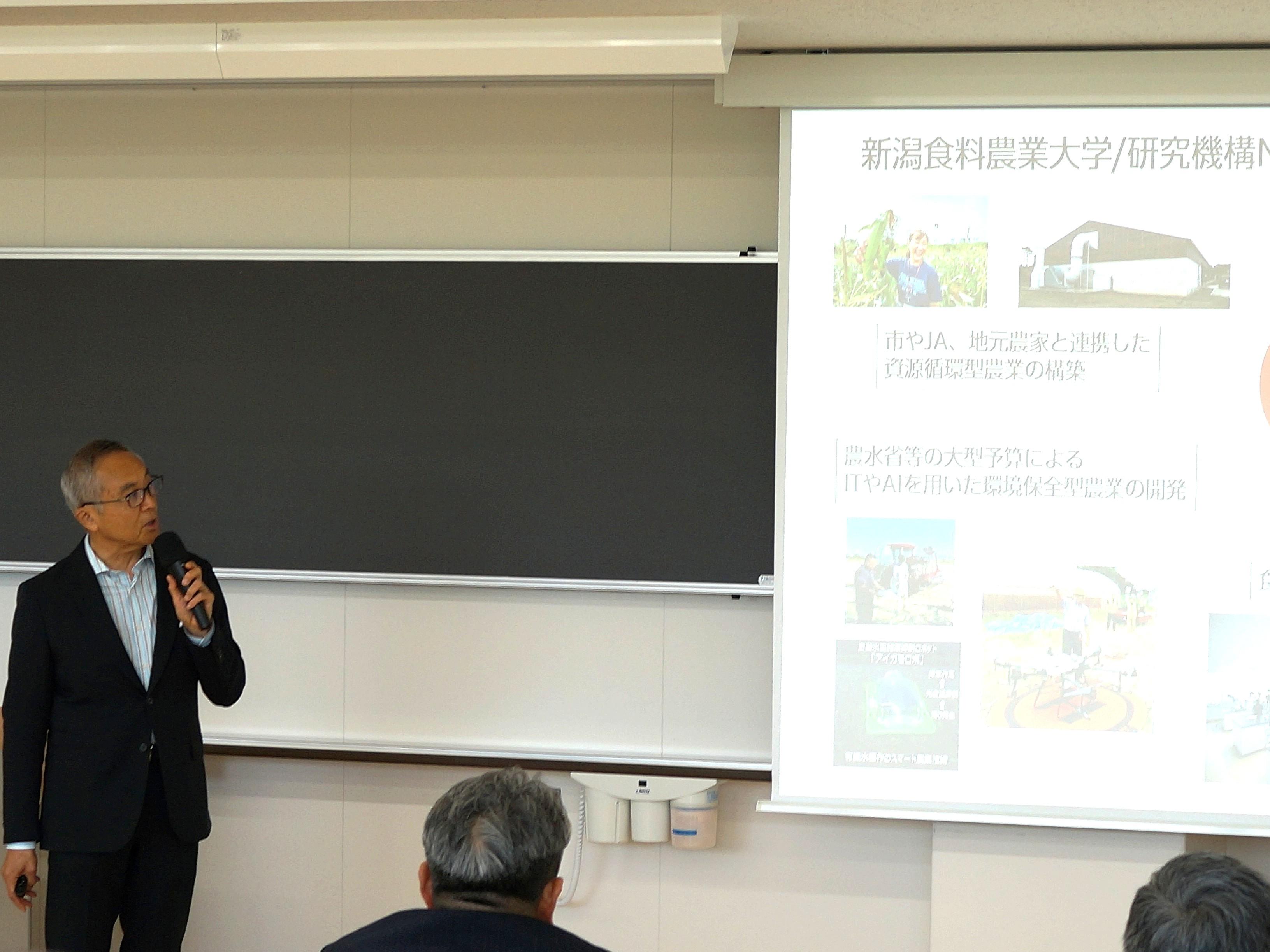 はじめに、本学学長中井裕より、開会挨拶および新潟フードテックタウン構想における本学の役割についてお話させていただきました。