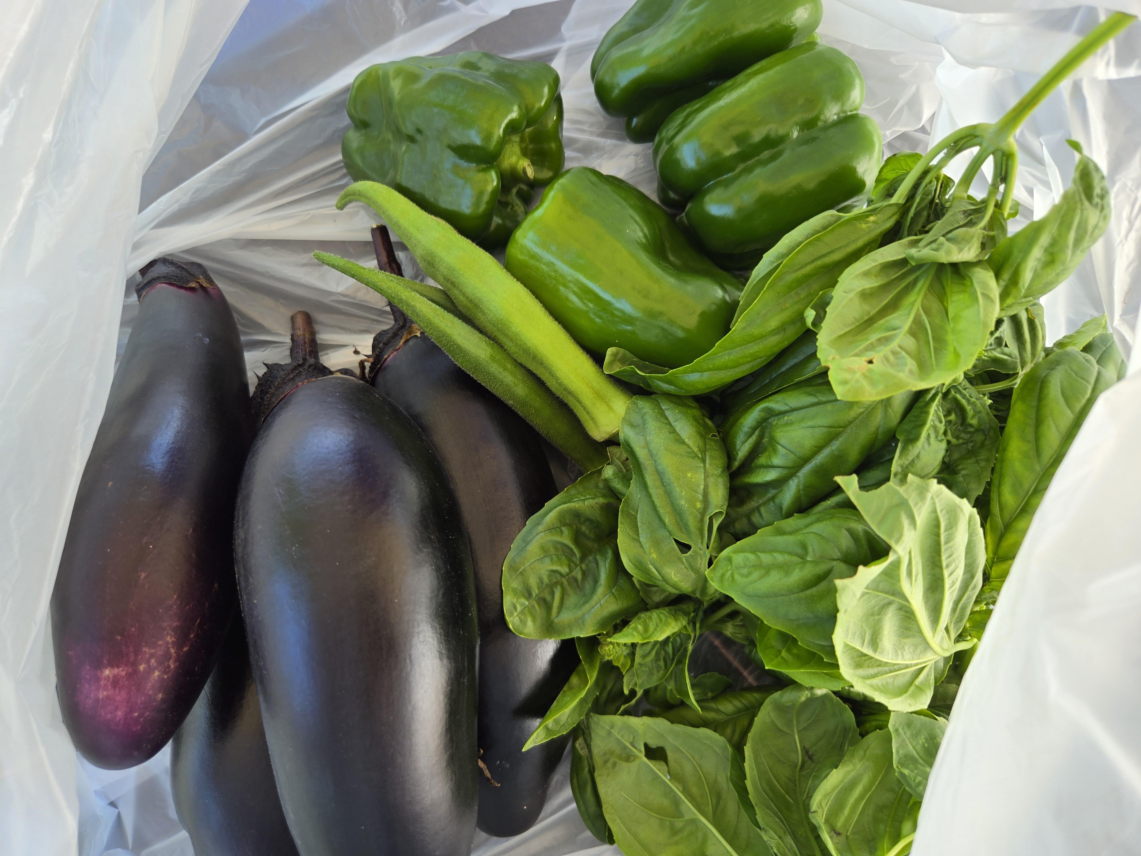 ピーマン、ナス、オクラ、バジルは順調に生育し、収穫するほど新たな実がなっていきます。