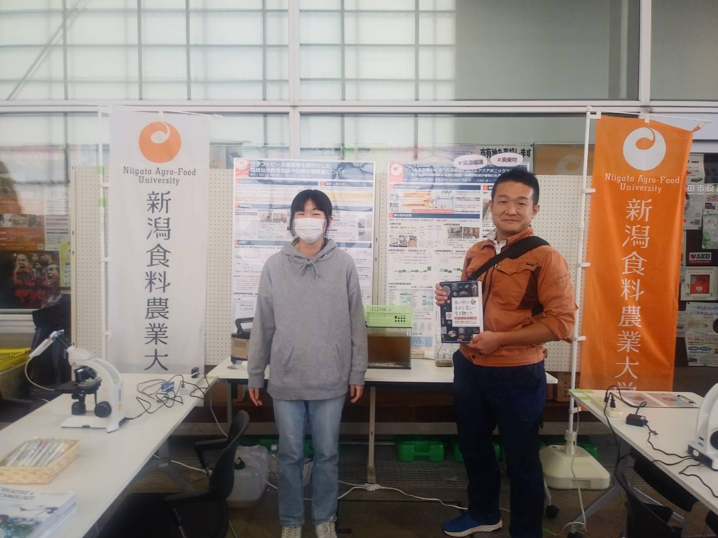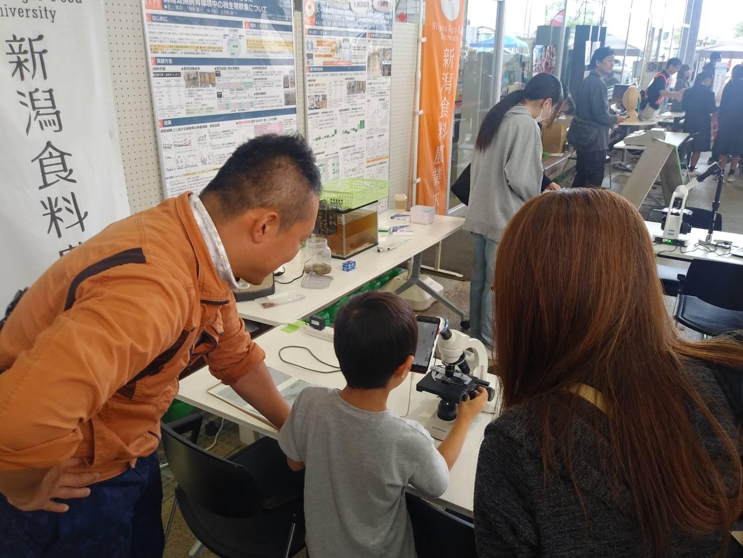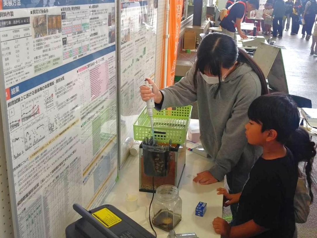 ブースでは、「アクアポニックス」の展示を行いました。アクアポニックスとは、魚と植物を一緒に育てる循環型の栽培システムで、魚の排泄物を微生物が分解し、その栄養を植物が吸収して成長します。自然の仕組みを生かした、環境にやさしい栽培方法です。当日はアクアポニックス装置を実際に展示し、水槽の水を電子顕微鏡で観察してもらいました。