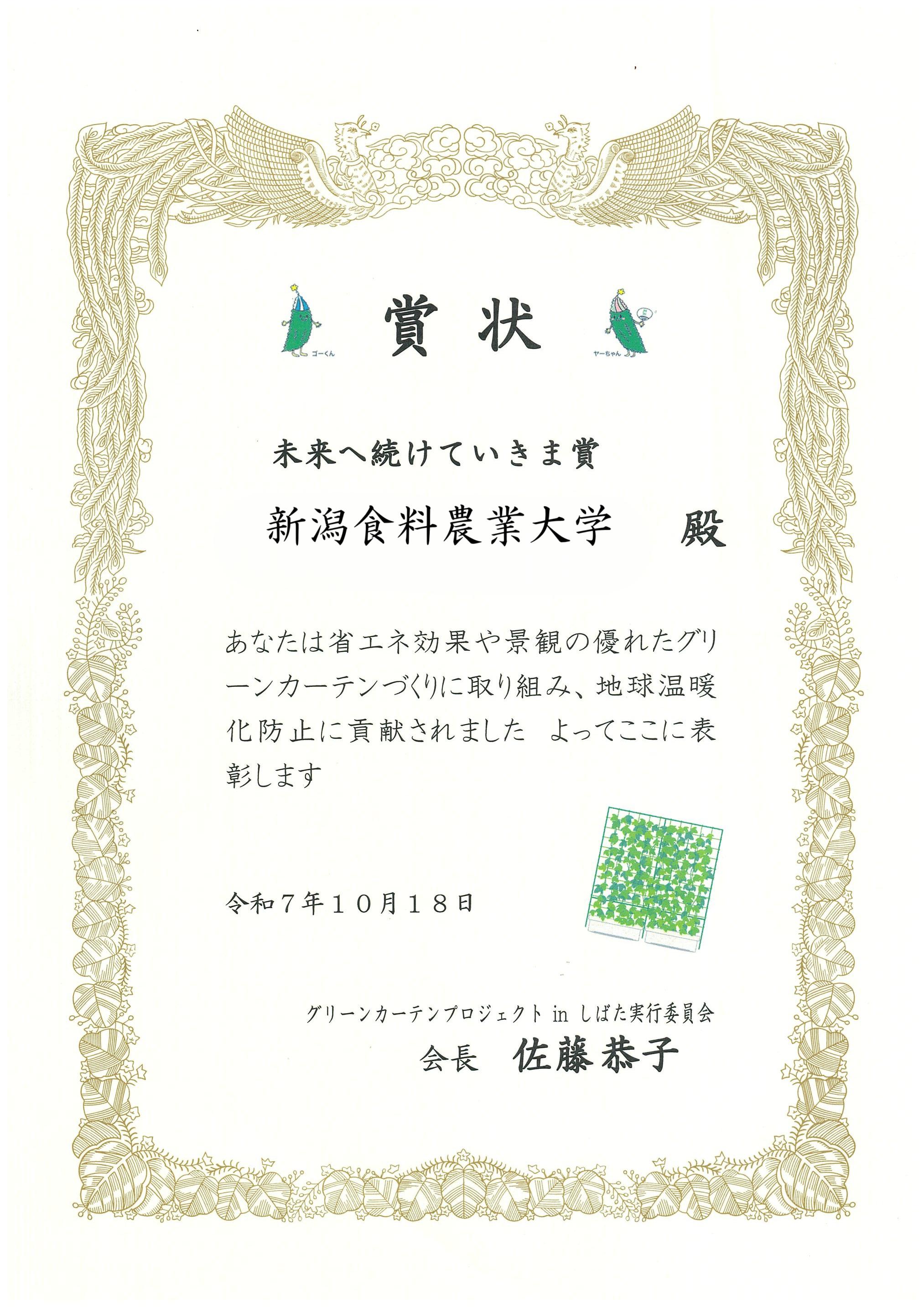 また、「グリーンカーテンプロジェクト2025 in しばた」にも本学が参加し、『未来へ続けていきま賞』を受賞しました。本学では、胎内キャンパスのメイン廊下に毎年グリーンカーテンを設置しています。アグリコースの職員や学生が中心となって育てており、今年もその様子を撮影しフォトコンテストに応募いたしました。初めての入賞となりました。