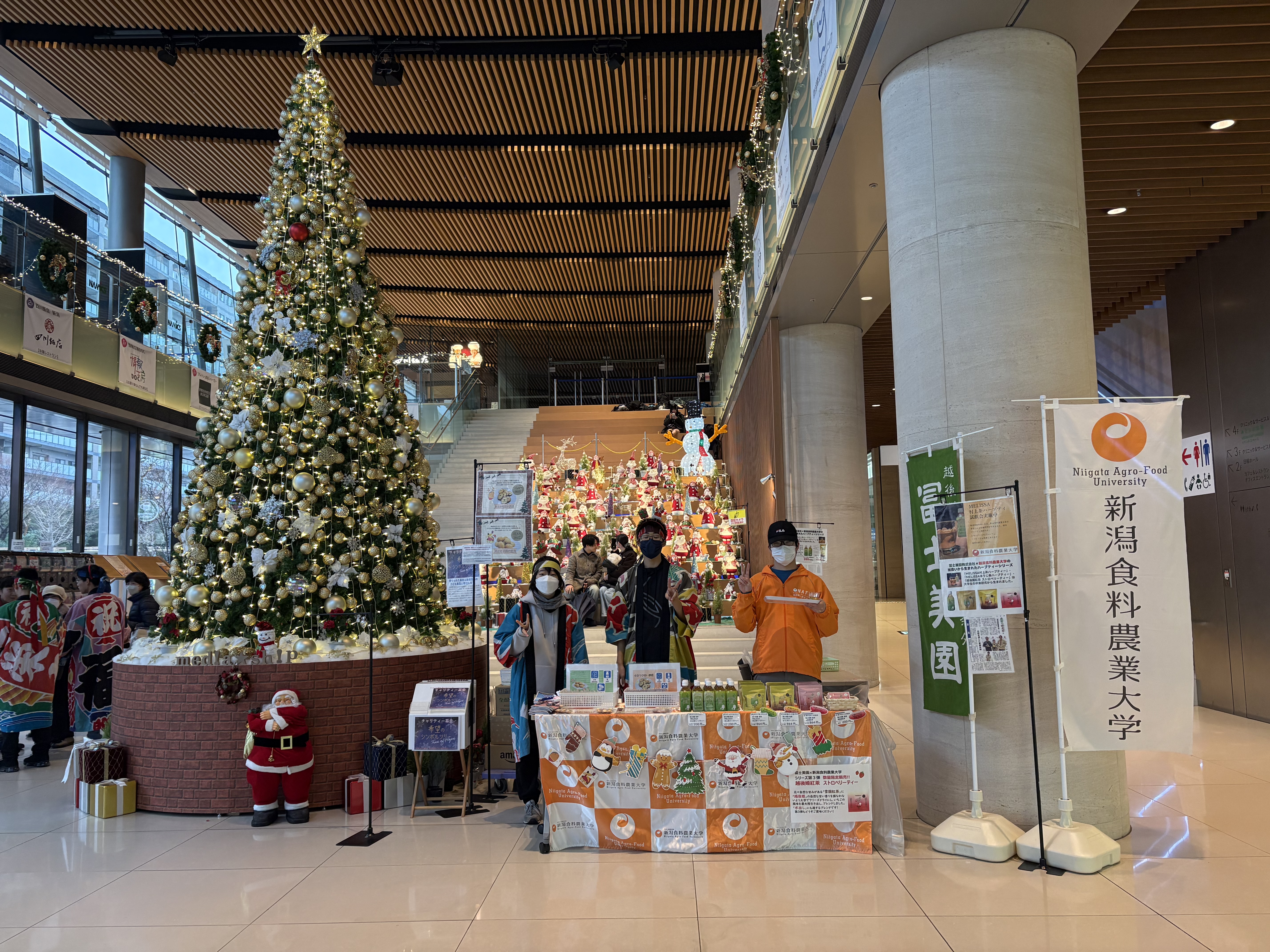 2025年12月25日(木)に新潟日報メディアシップ「みなと広場」、2026年1月10日(土)に新潟空港「アカシア前」において、本学コラボ商品の店頭試食・試飲会を行いました。両日ともに悪天候の予報でしたが、大きく荒れることなく、無事に実施することができました。