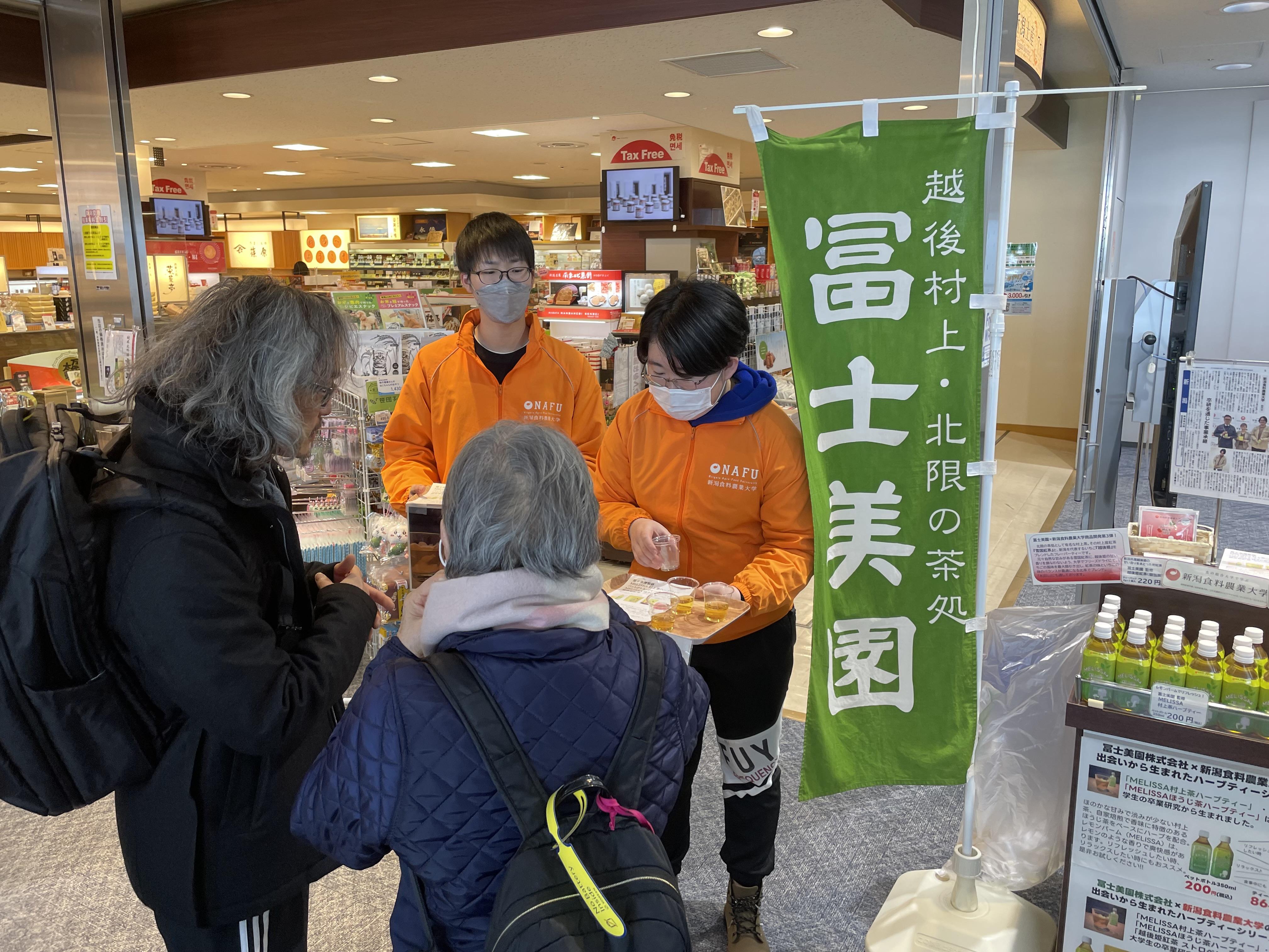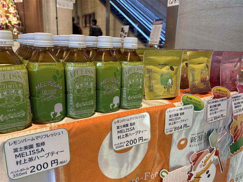 今回も、粟島浦中学校の生徒さんと本学学生が一緒に店頭に立ち、さつまいも米粉クッキーの試食販売と、村上市の老舗茶舗 冨士美園 と本学学生の卒業研究で共同開発したお茶の全シリーズの販売、ならびにMELISSA 村上茶ハーブティー(ペットボトル)の試飲を行いました。