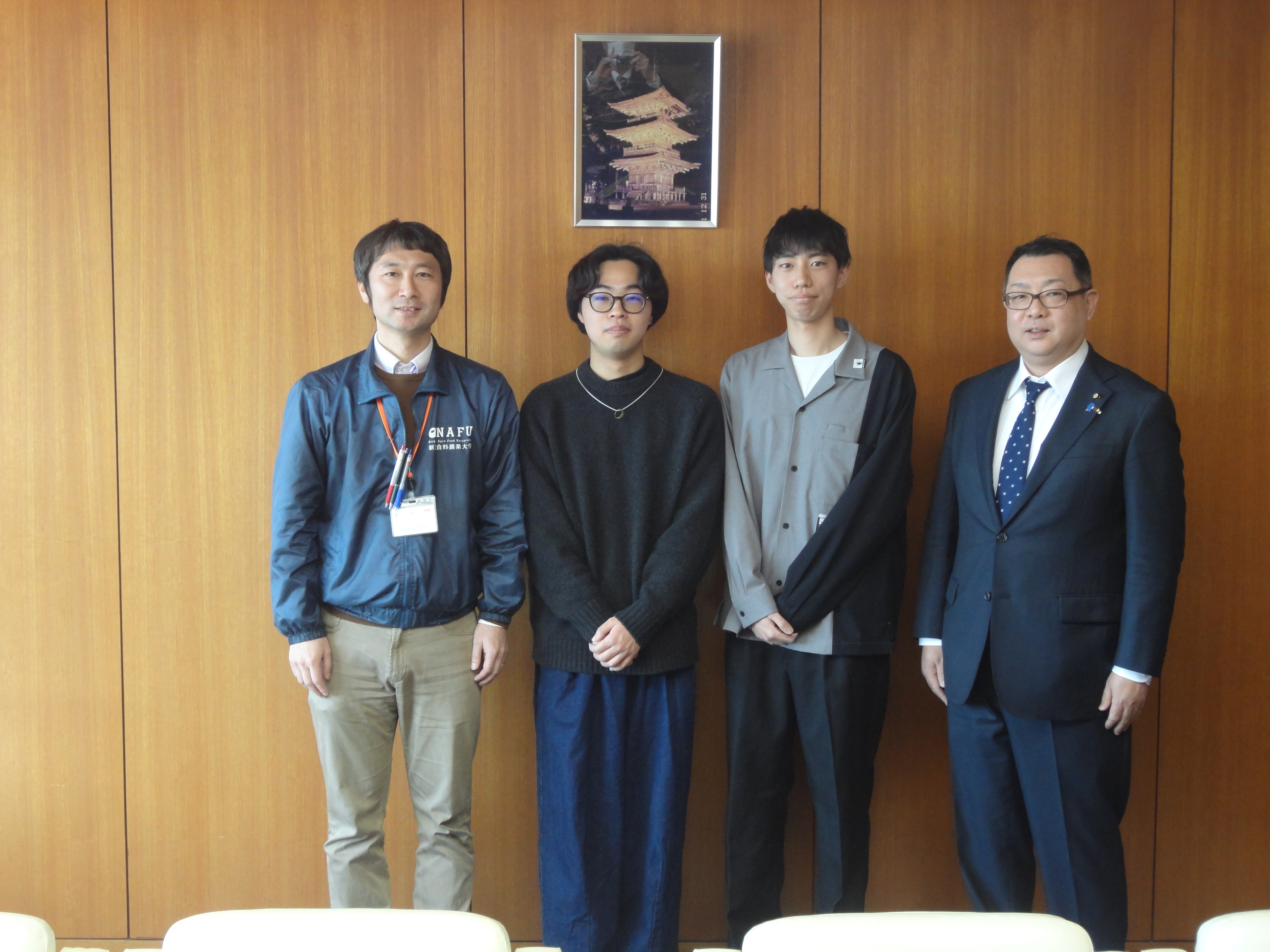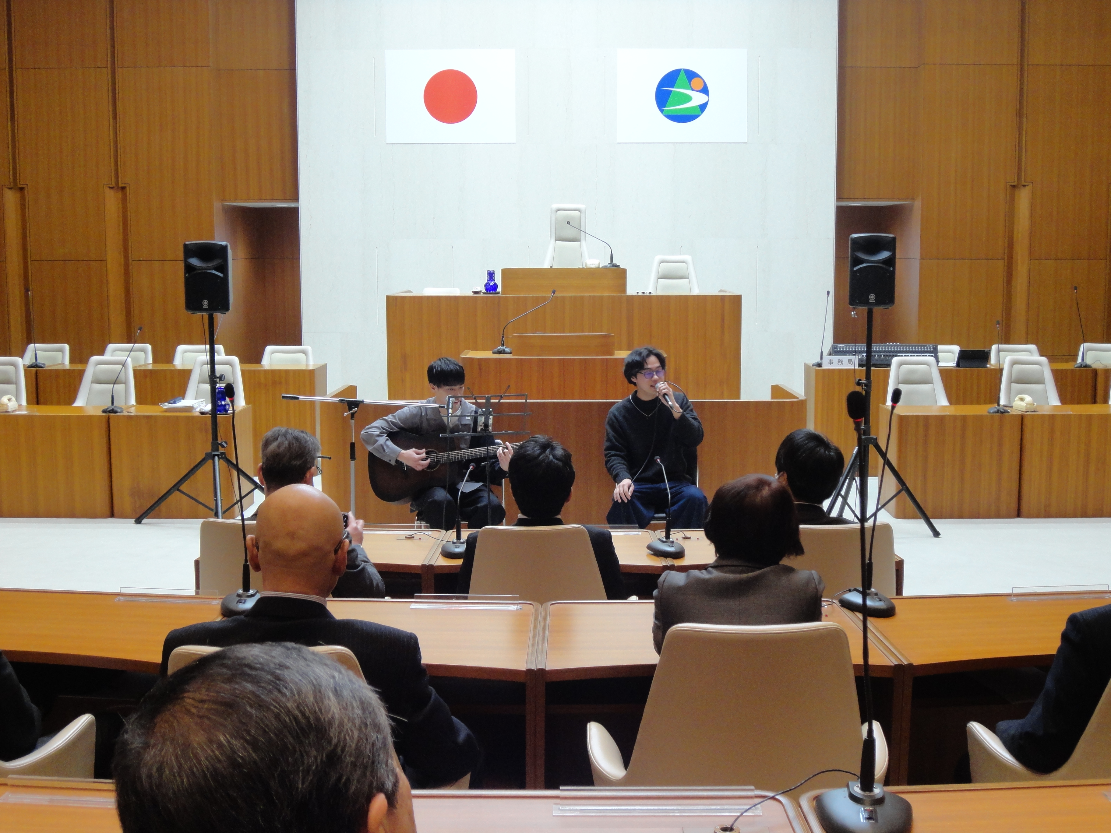 演奏した曲目は、「歌うたいのバラッド」(斉藤和義) と「明日はきっといい日になる」(高橋優)の2曲です。学生は、幅広い世代の方が耳にしたことのある曲で議員さんに届くように、胎内市の未来が「きっといい日になる」という思いで選曲したそうです。慣れない場所で少し緊張しながらも、学生たちは堂々と、楽しそうに演奏してくれました。