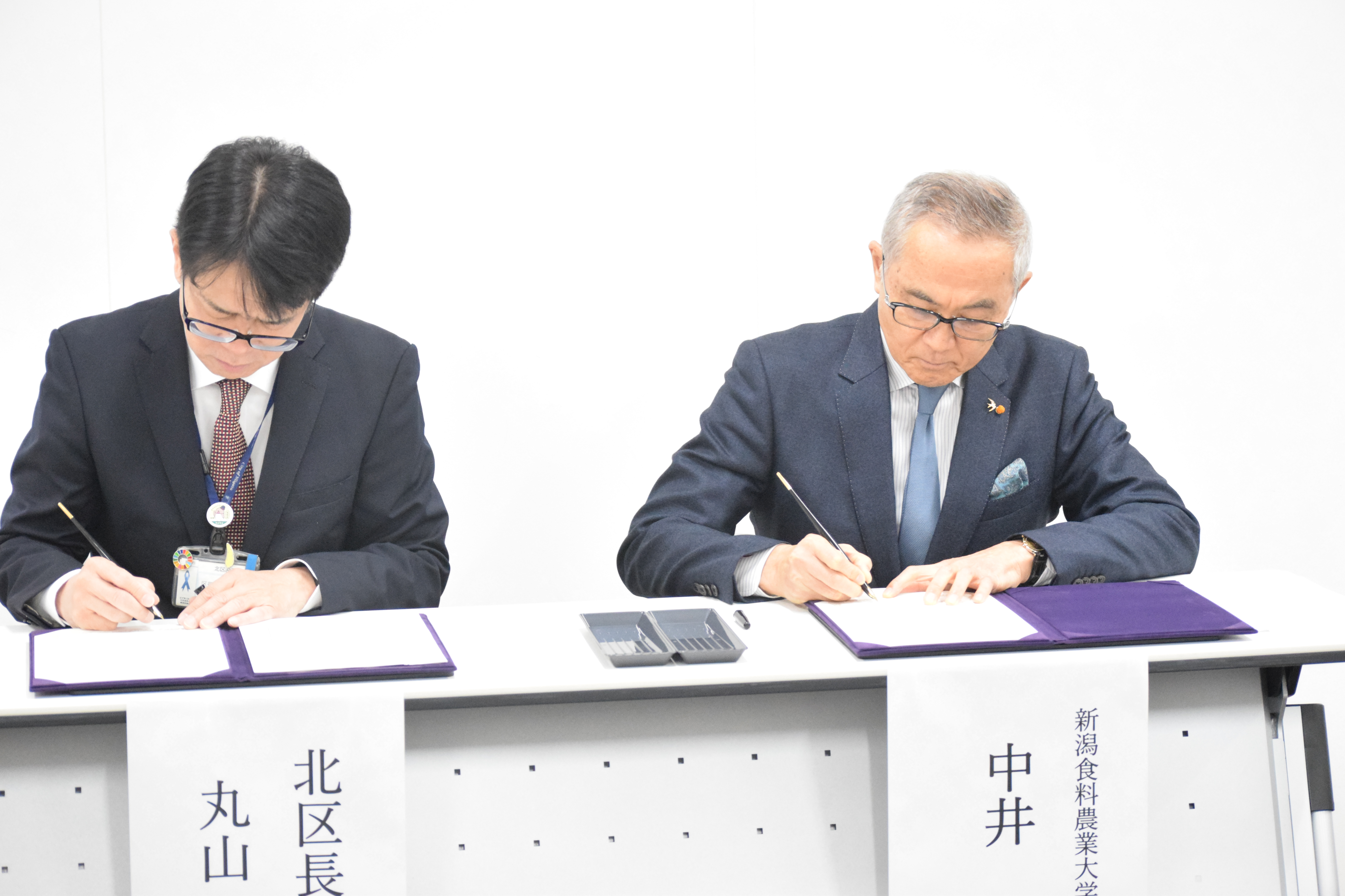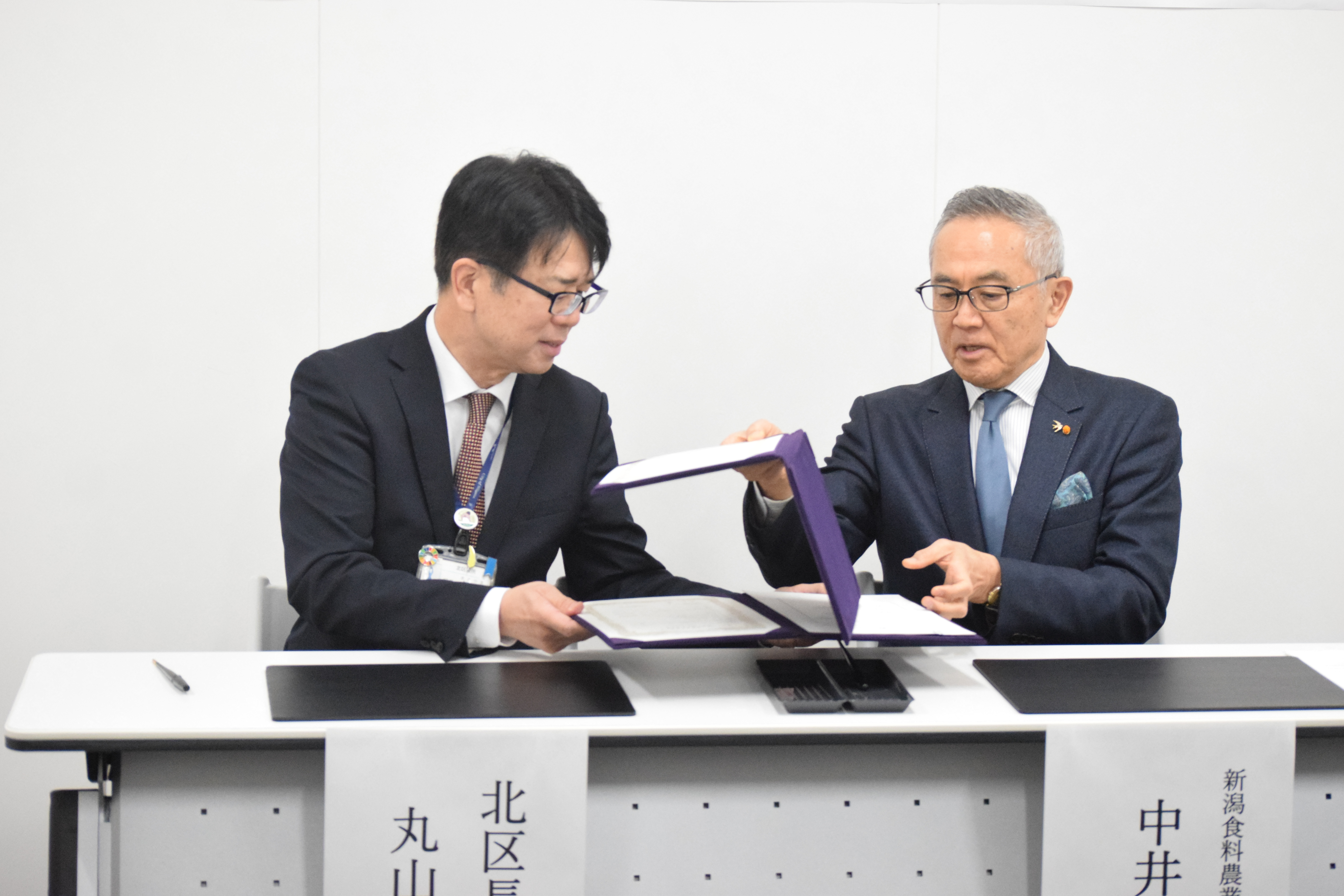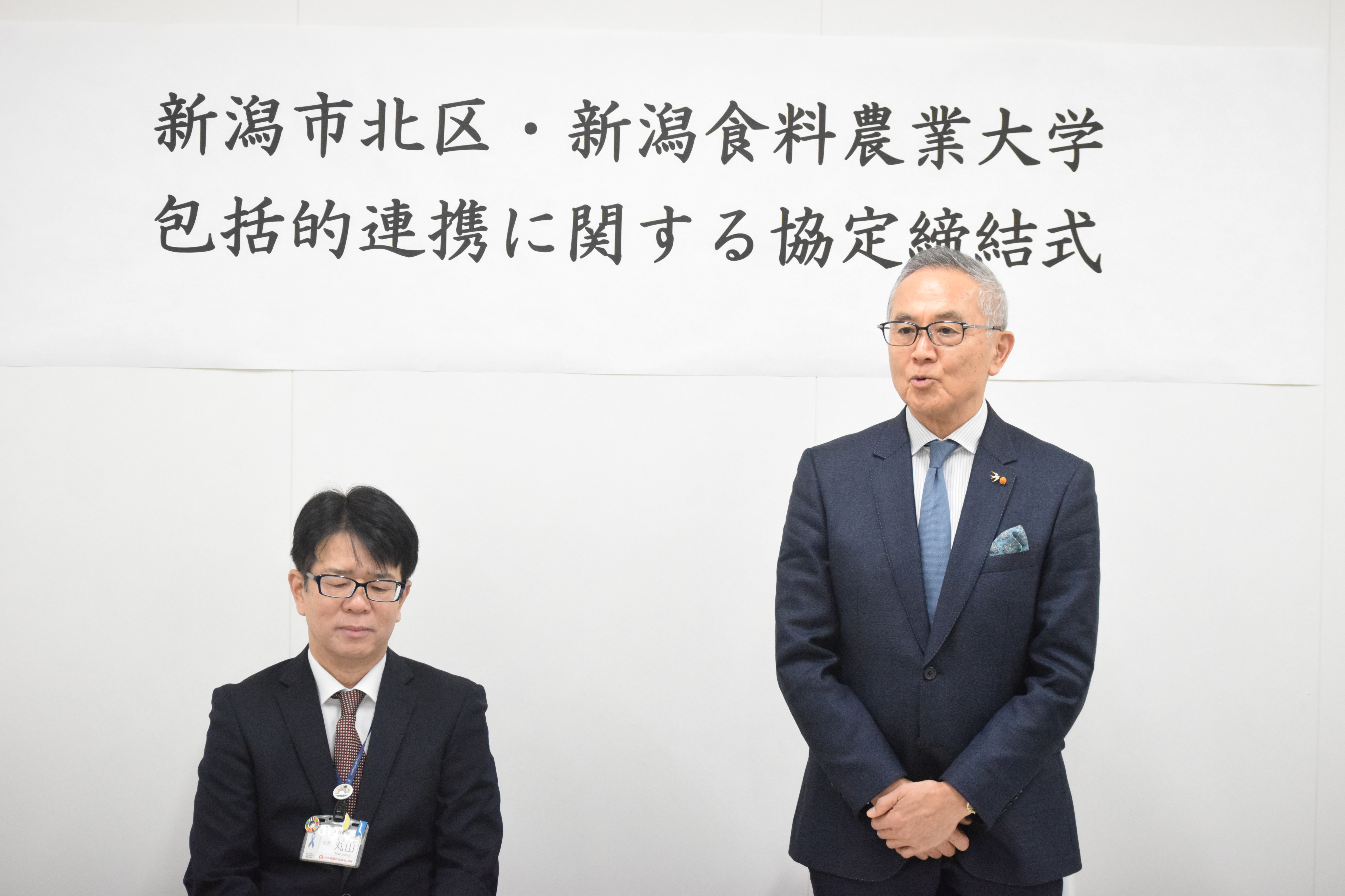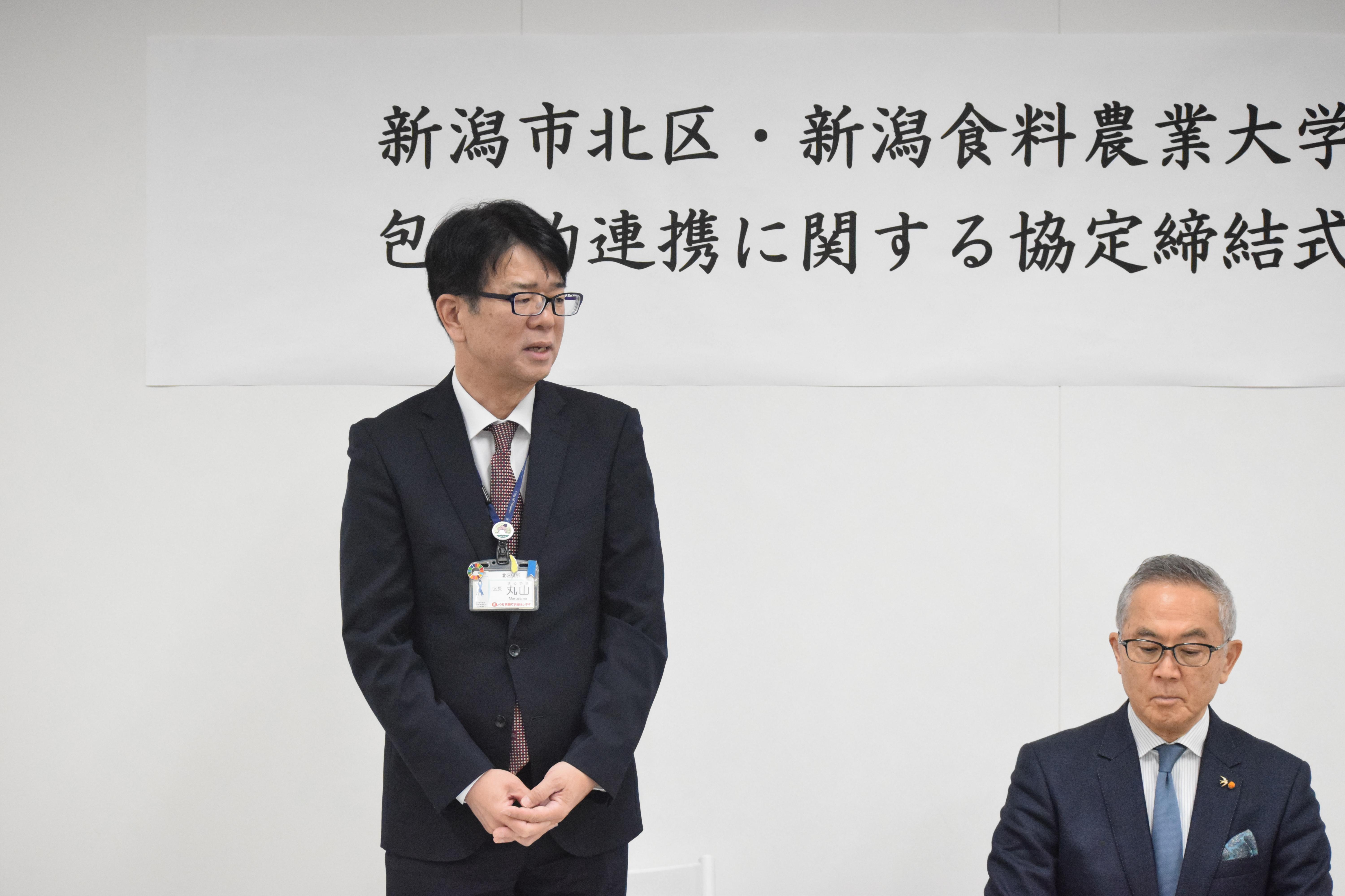 ・ 出席者:新潟市北区長 丸山 寛 氏、新潟食料農業大学 学長 中井 裕