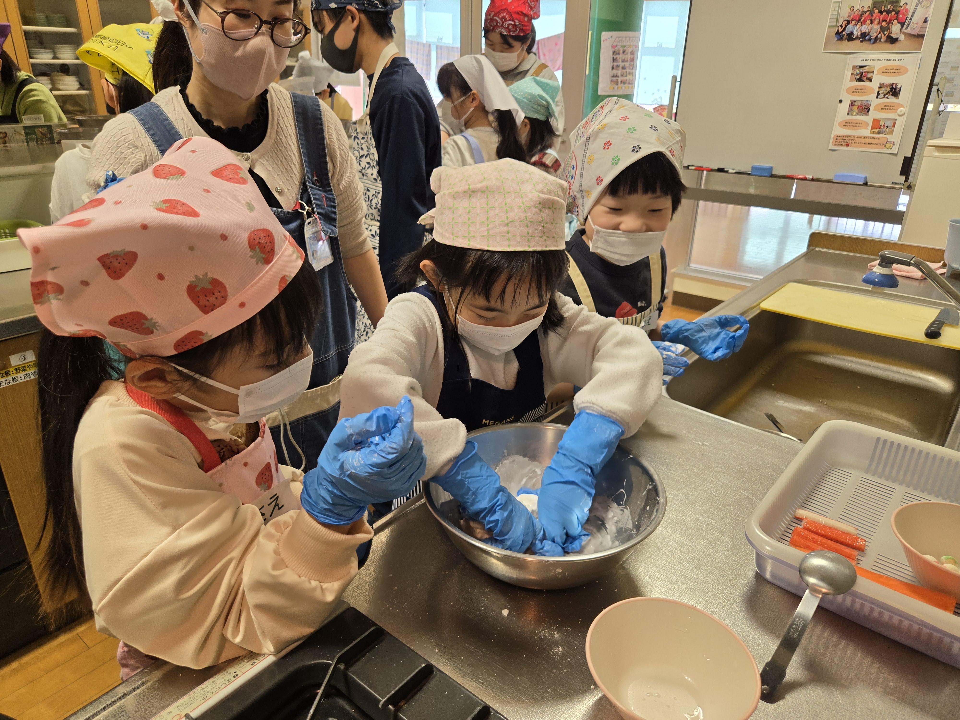 白玉のフルーツポンチは、米粉・白玉粉に砂糖・水・油を加えてよく混ぜ、みんなで一つずつ丸めて作りました!