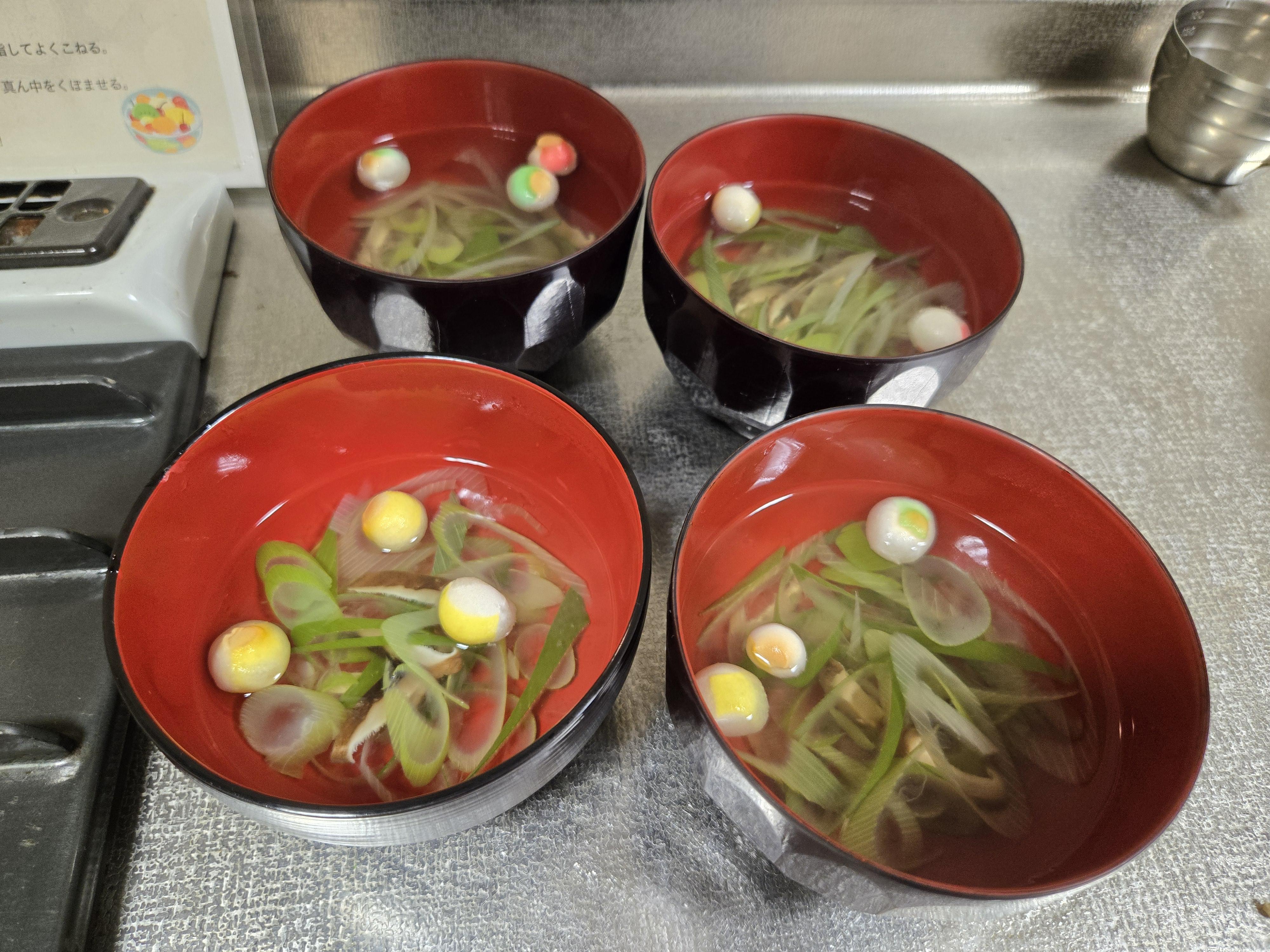 すまし汁は、乾燥シイタケの戻し汁でだし汁を取り、手毬麩で飾り付けます。