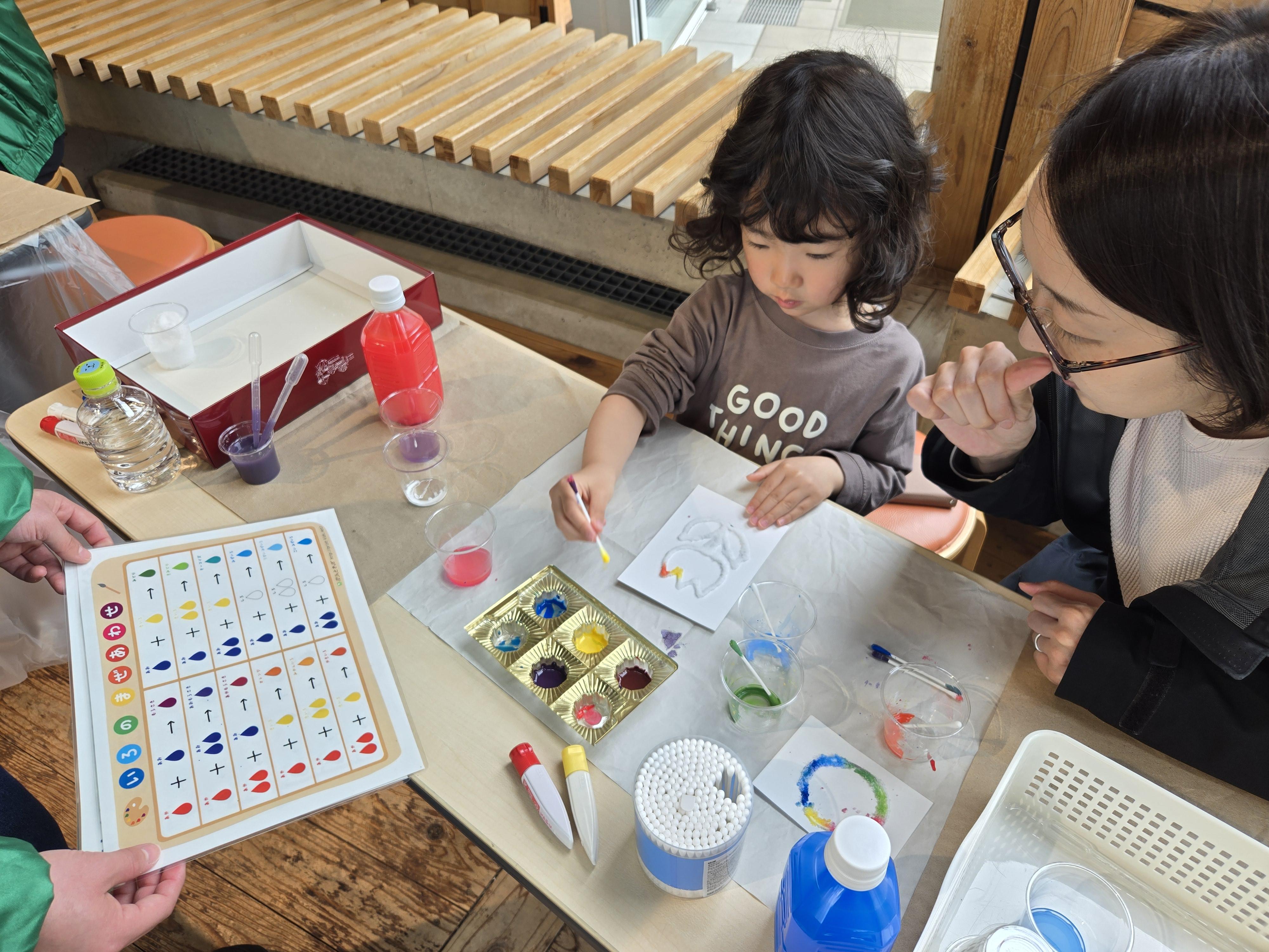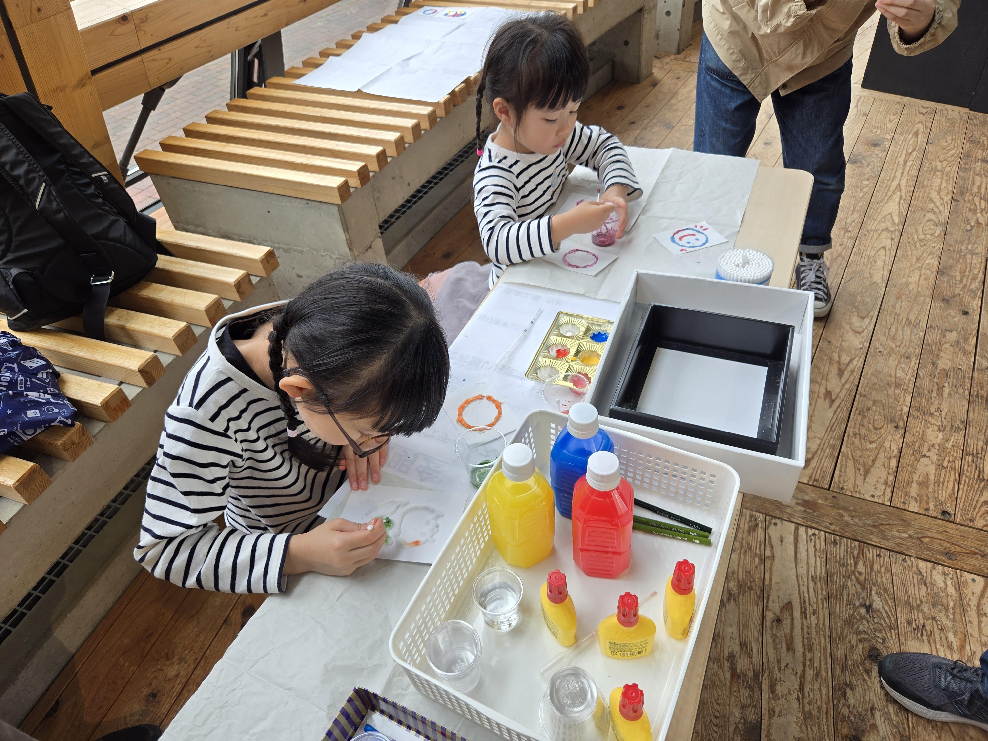 インクは、赤・青・黄色をベースに組み合わせて好きな色をつくってもらったので、赤が多めのオレンジや、青が多めの緑でターコイズブルーにする!など、子どもたちの豊かな色彩感覚に触れることができました。
