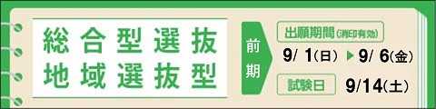 2024.08.23 入試情報 【9/1(日)出願受付開始】総合型選抜 主体性重視型(A日程)・地域選抜型(前期日程) 9月1日(日)より総合型選抜 主体性重視型(A日程)および地域選抜型(前期日程)の出願受付を開始いたします。 本学で学びたいという熱意・意欲溢れる皆さまからのご出願をお待ちしています! 【出願期間】 9月 1日(日)~ 9月 6日(金)消印有効 【試験日程】 9月14日(土) 【合格発表】11月 1日(金) インターネット出願はこちら↓ 「総合型選抜 主体性重視型」の詳細はこちら↓ 「総合型選抜 地域選抜型」の詳細はこちら↓ News一覧へ