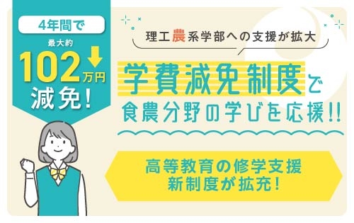 2024.09.17 入試情報 【奨学金】高等教育の修学支援新制度の拡充について 今年度(令和6年度)から、高等教育の修学支援制度が拡充となり、本学もその対象となっております。 農系学部への支援が拡大し、学費減免制度で食農分野の学びを応援します。 修学支援新制度の詳細はこちら News一覧へ