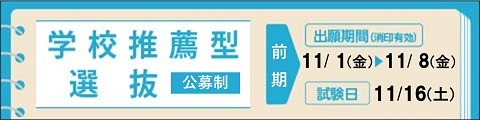 2024.10.25 入試情報 【11/1(金)出願受付開始】学校推薦型選抜 指定校制(前期日程)/ 公募制(前期日程) 11月1日(金)より学校推薦型選抜 指定校制(前期日程)/ 公募制(前期日程)の出願受付を開始いたします。 本学で学びたいという熱意・意欲溢れる皆さまからのご出願をお待ちしています! 【出願期間】11月 1日(金)~11月 8日(金)消印有効 【試験日程】11月16日(土) 【合格発表】12月 2日(月) インターネット出願はこちら↓ 「学校推薦型選抜 指定校制」の詳細はこちら↓ 「学校推薦型選抜 公募制」の詳細はこちら↓ News一覧へ