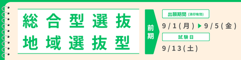 2025.09.01 入試情報 【9/1(月)出願受付開始】総合型選抜 主体性重視型(A日程)・地域選抜型(前期日程) 9月1日(月)より総合型選抜 主体性重視型(A日程)および地域選抜型(前期日程)の出願受付を開始いたします。 本学で学びたいという熱意・意欲溢れる皆さまからのご出願をお待ちしています! 【出願期間】 9月 1日(月)~ 9月 5日(金)消印有効 【試験日程】 9月13日(土) 【合格発表】11月 1日(土) インターネット出願はこちら↓ 「総合型選抜 主体性重視型」の詳細はこちら↓ 「総合型選抜 地域選抜型」の詳細はこちら↓ News一覧へ