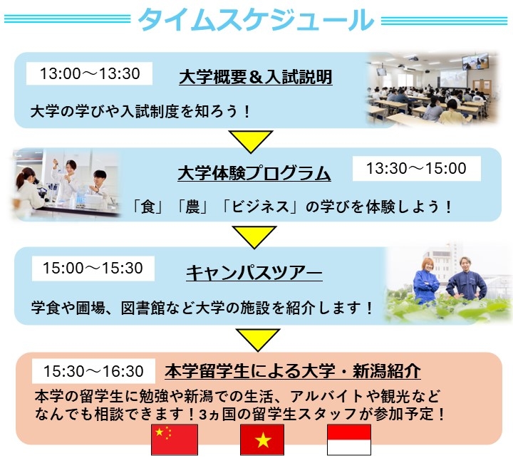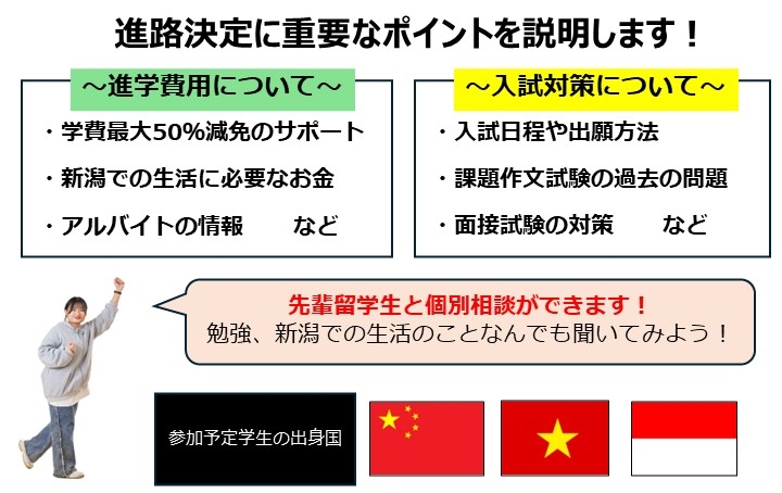 本学で学んでいる留学生スタッフが参加予定です。先輩留学生に大学のことや新潟での生活のことなどなんでも相談ができます。