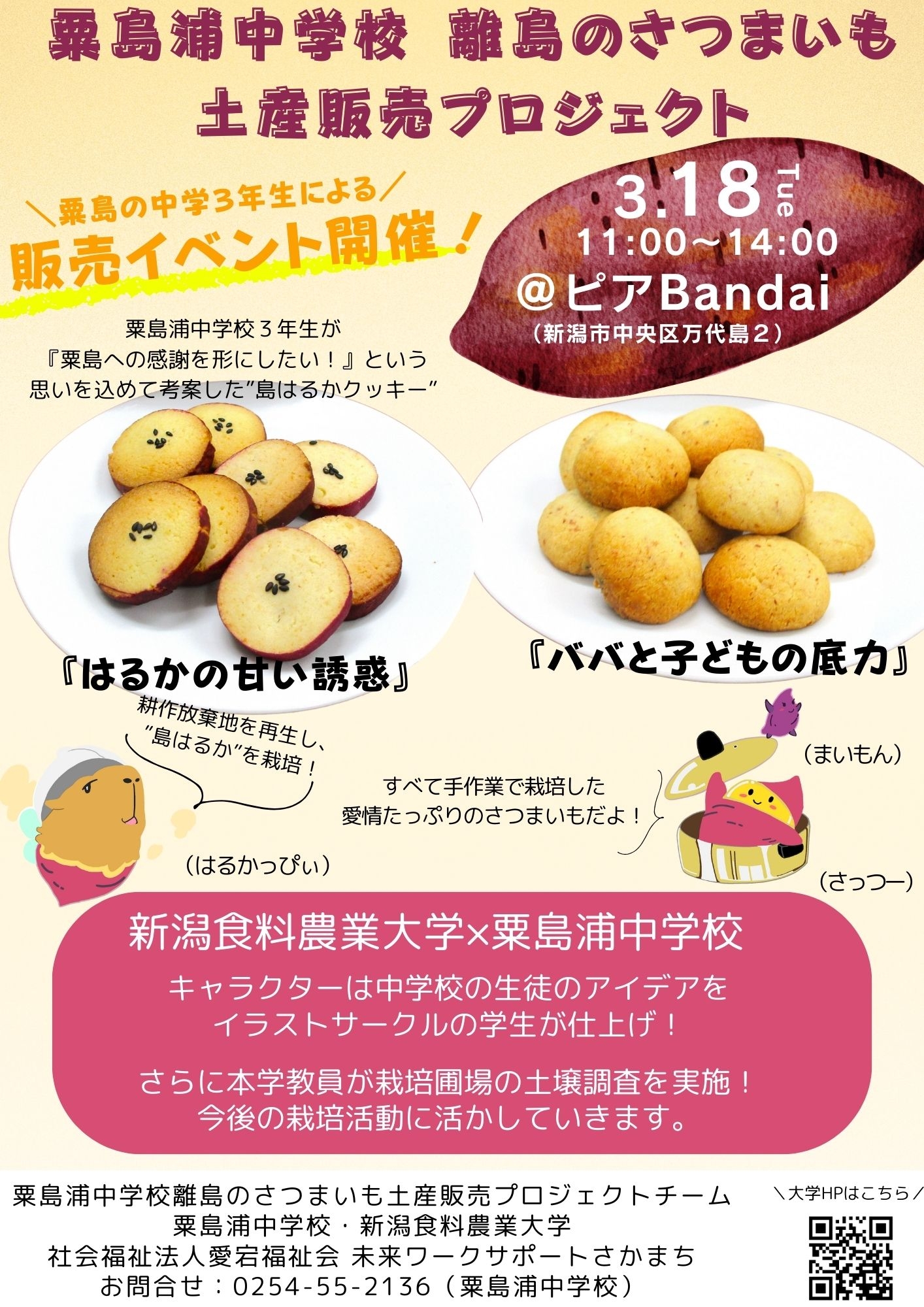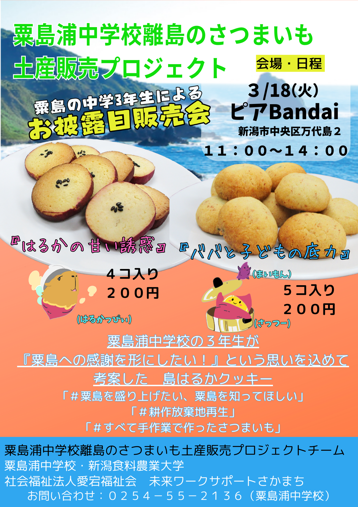 【地域連携活動】粟島浦村産さつまいも「島はるか」クッキー販売イベント開催! 粟島浦中学校×本学×福祉会のコラボ商品